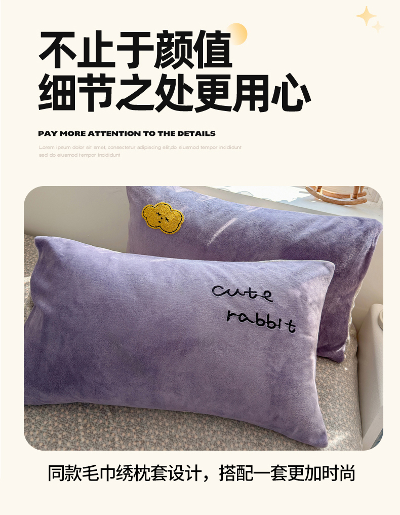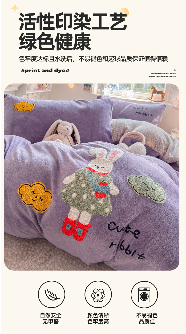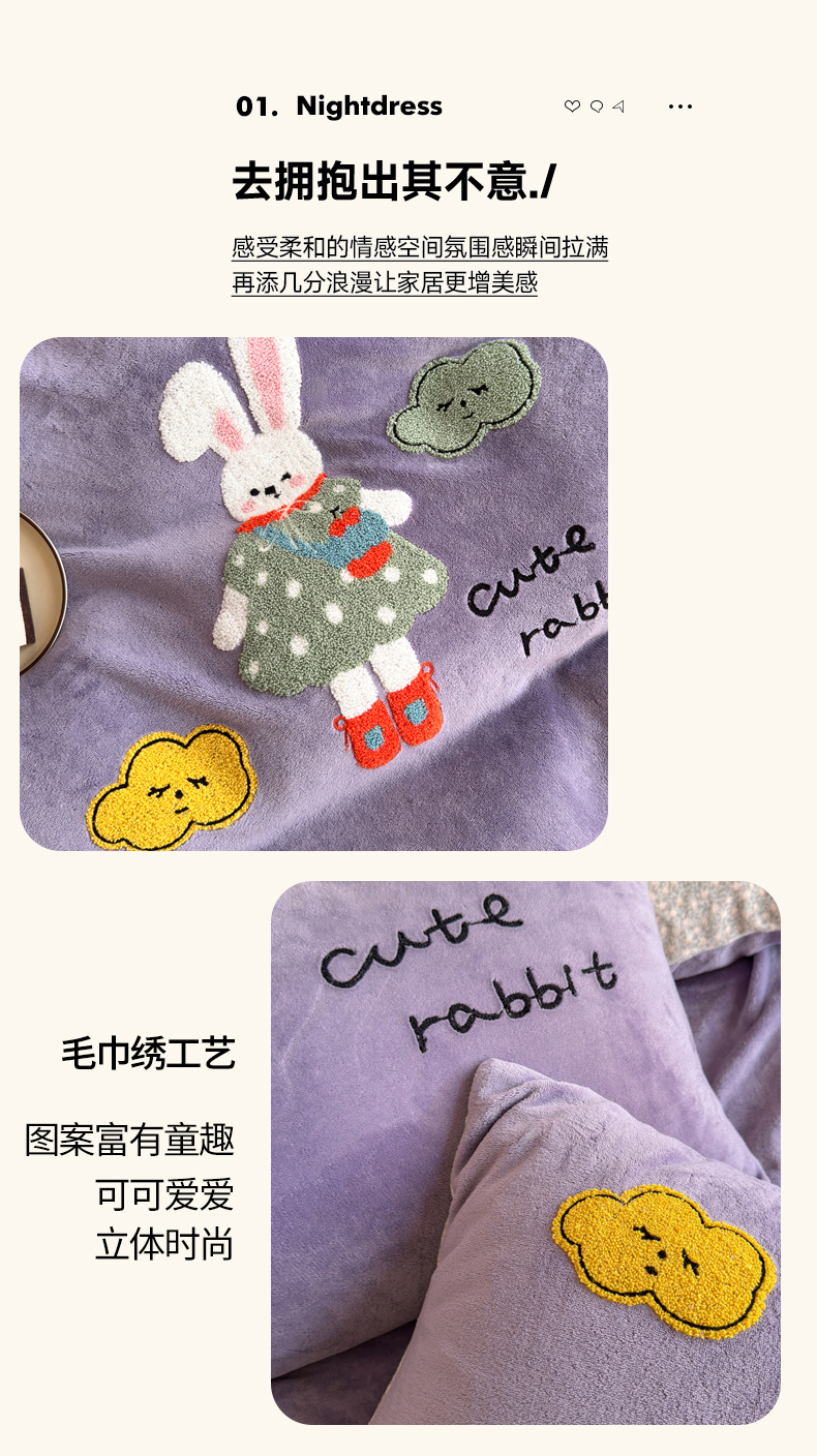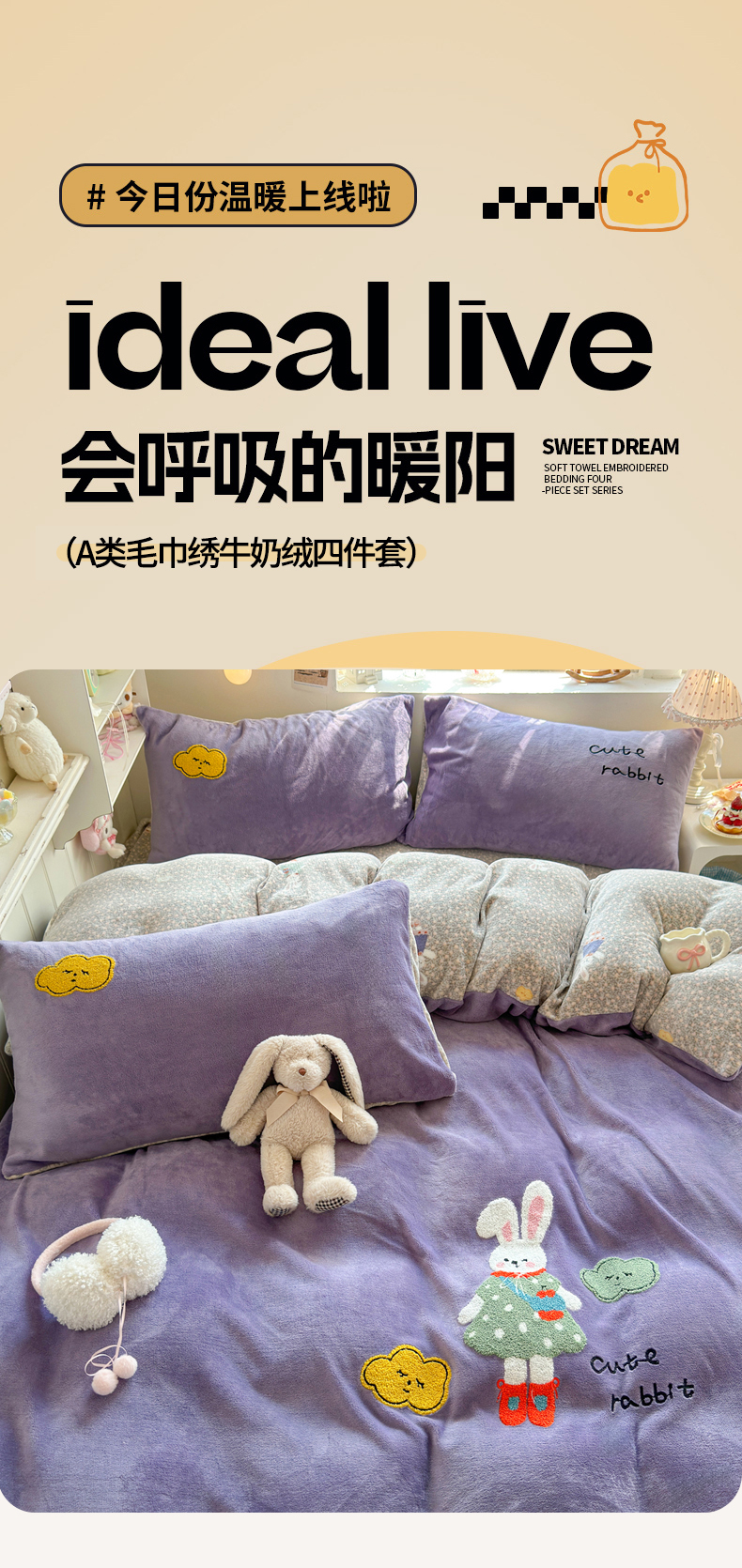 商品名称:Sweet dreams甜梦 2025新款全消光牛奶绒毛巾绣印花四件套 可爱小兔