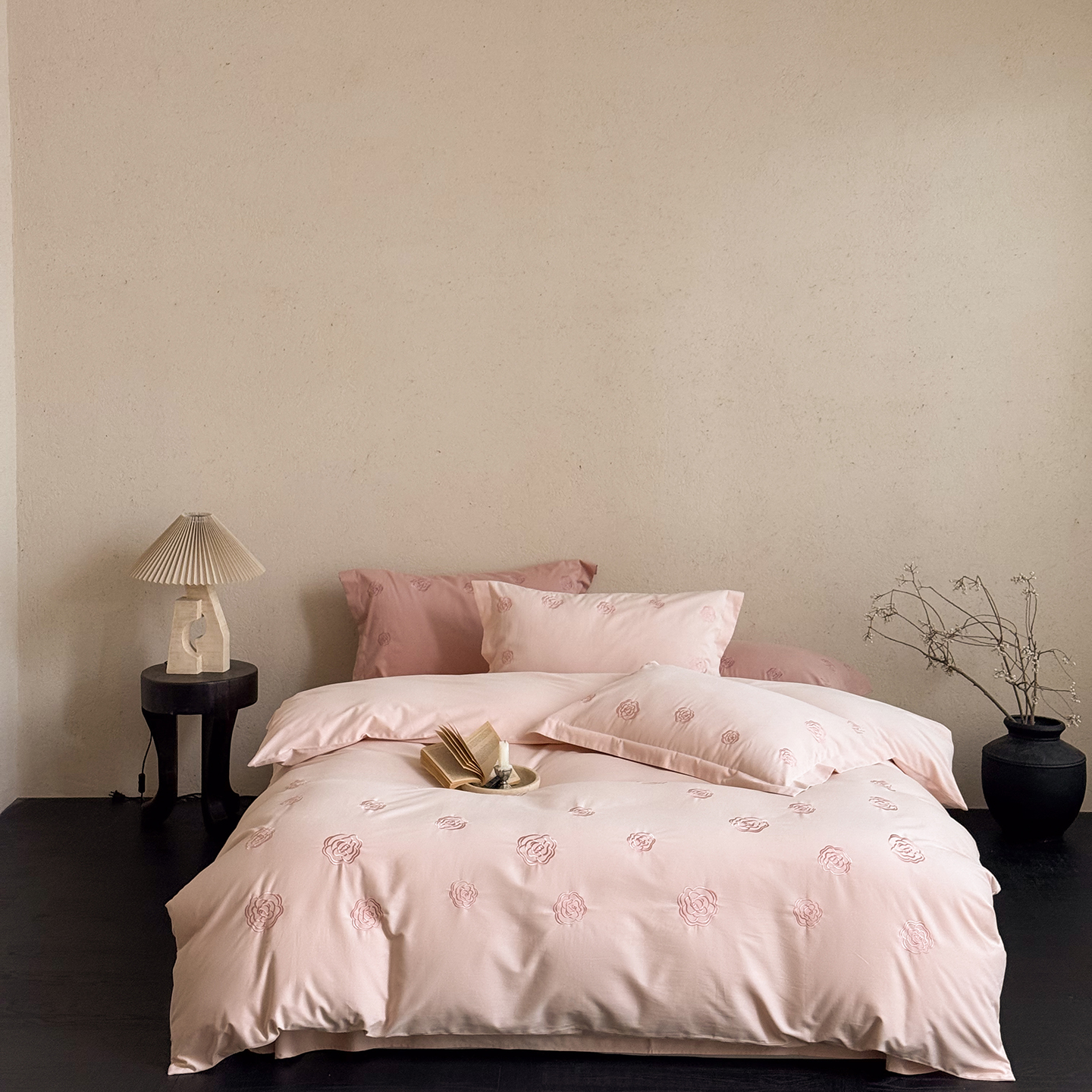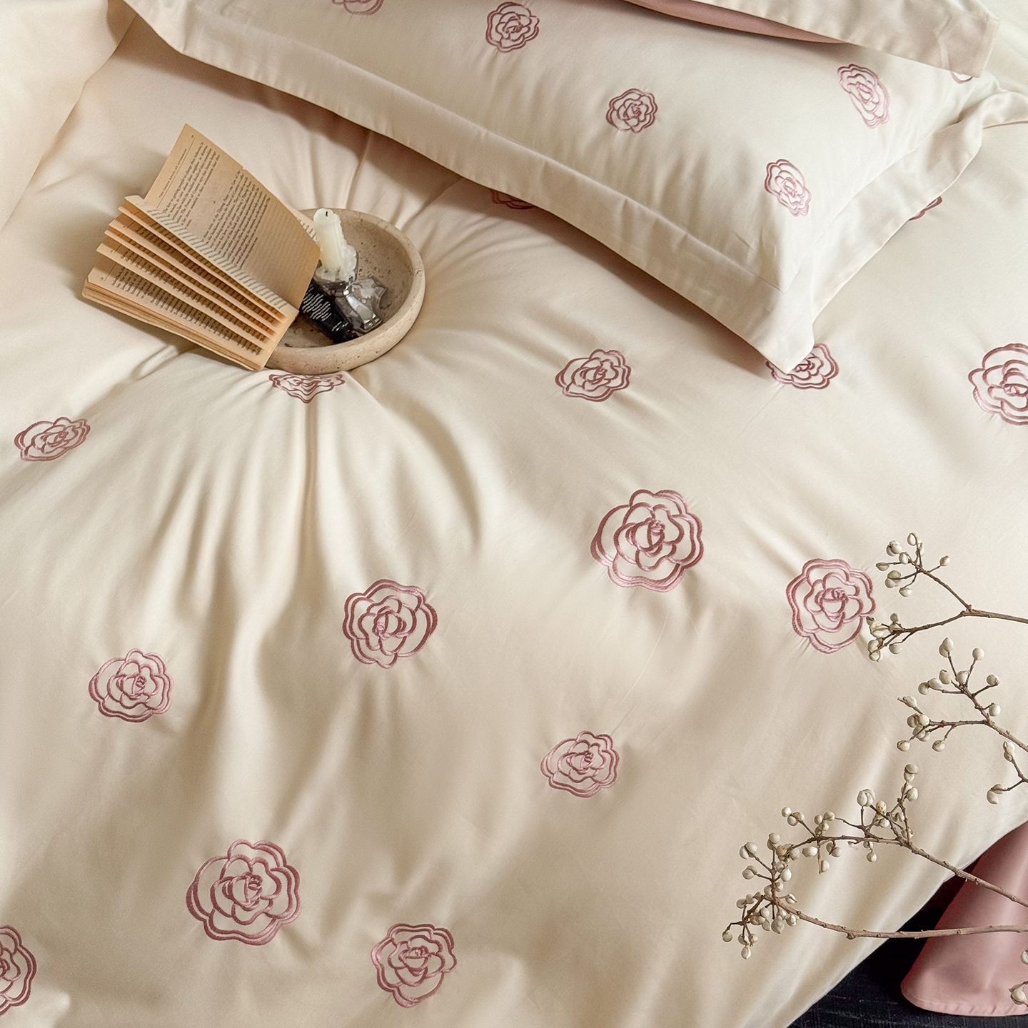 (总)佳汐蓝 2025春夏新品双层皱皱纱刺绣+织带+荷叶边四件套--白茶花,奶白,曲奇