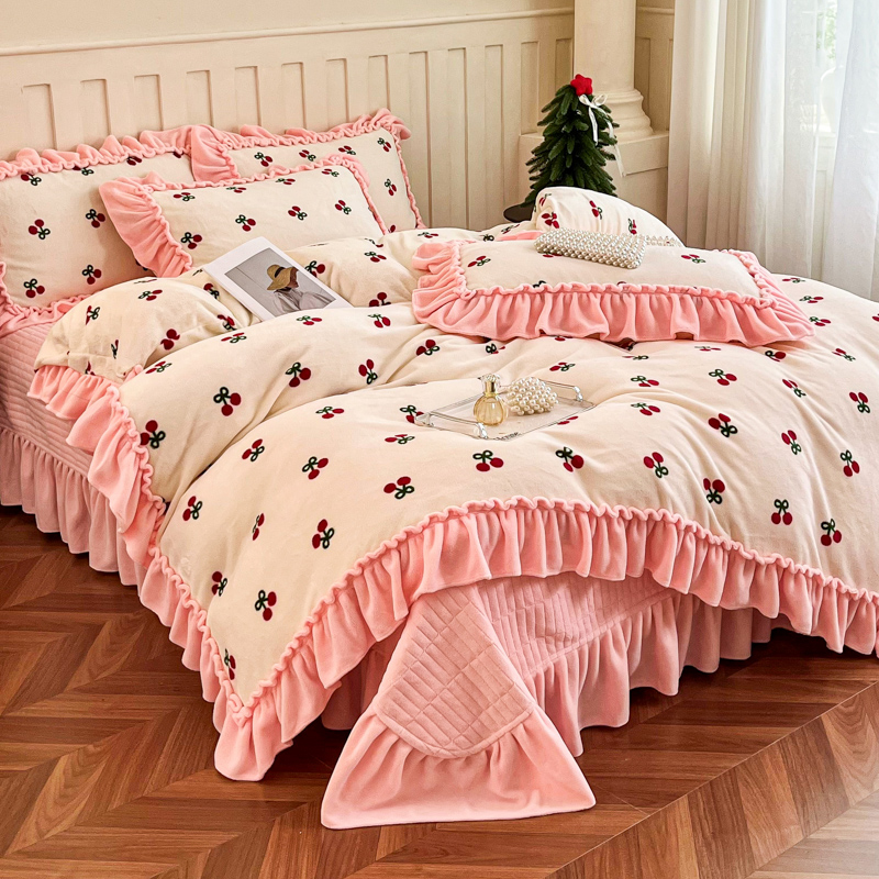 商品名称:尚美 2025新款法式复古风大花边绒床盖被套四件套(花边随机) 复古风樱桃
