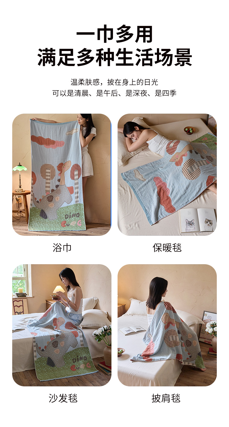 沐瑟家纺 2025新款卡通A类全棉四层纱布浴巾加大毛巾-第五组 小恐龙 150*75cm