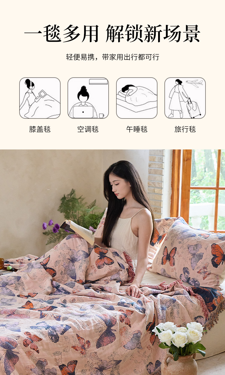 商品名称:沐瑟家纺 2025新款亲肤柔软全棉纱布中国风盖毯毯子 蝶语-绿