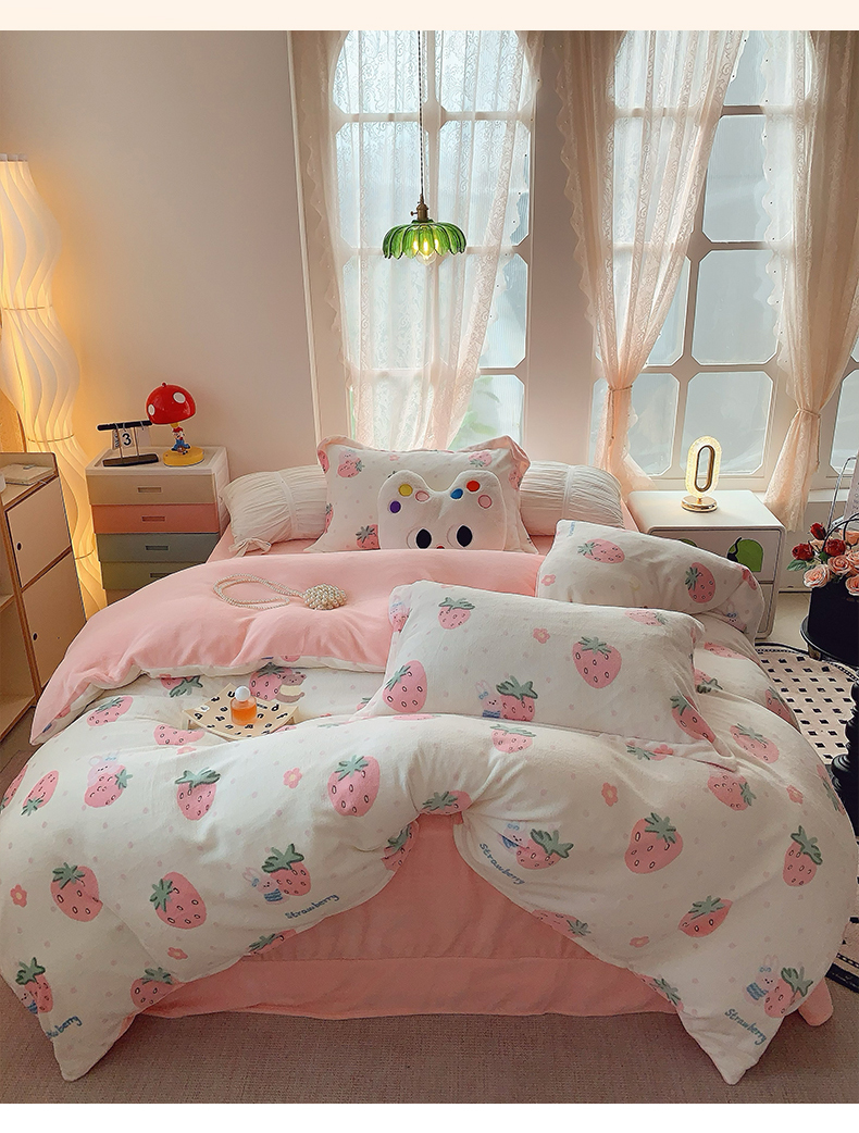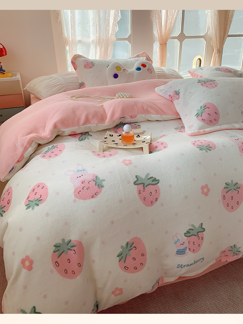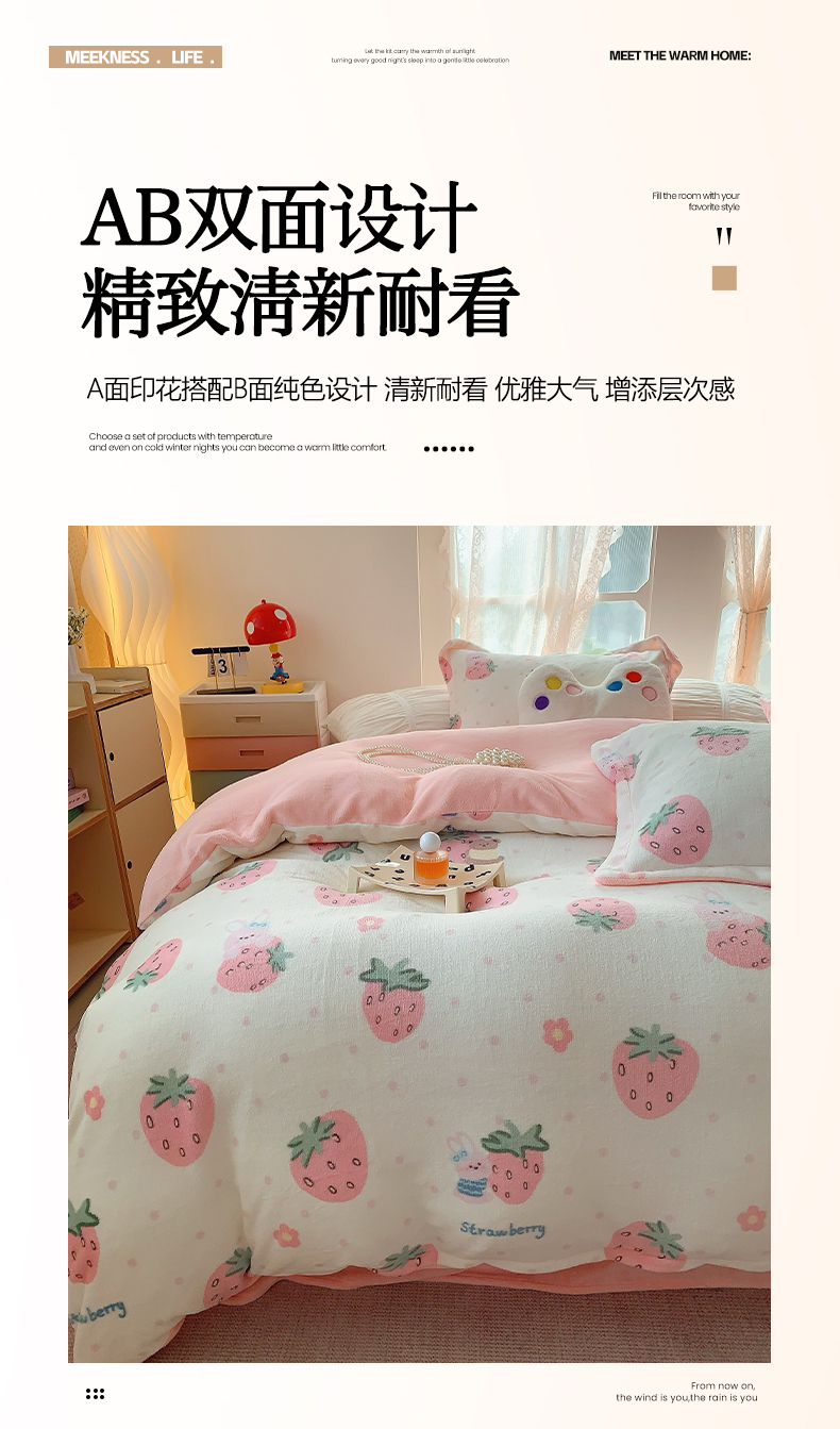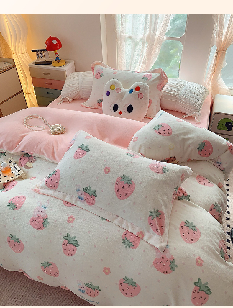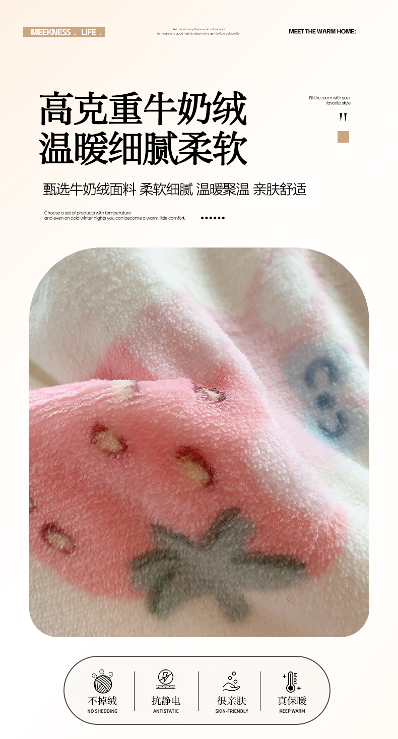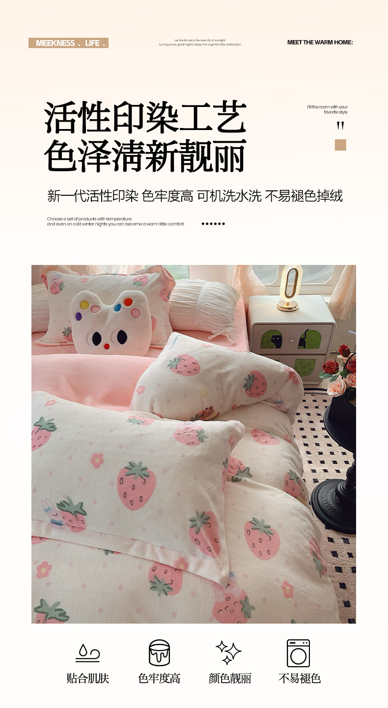 商品名称:奈萝家纺 2025新款加厚小清新印花牛奶绒三件套四件套 奶油草莓