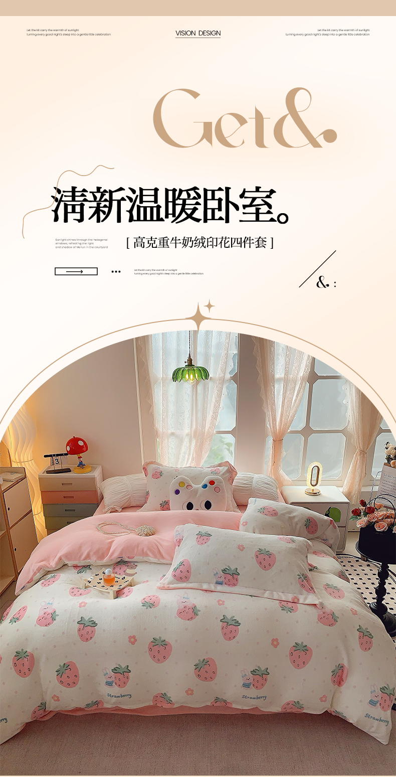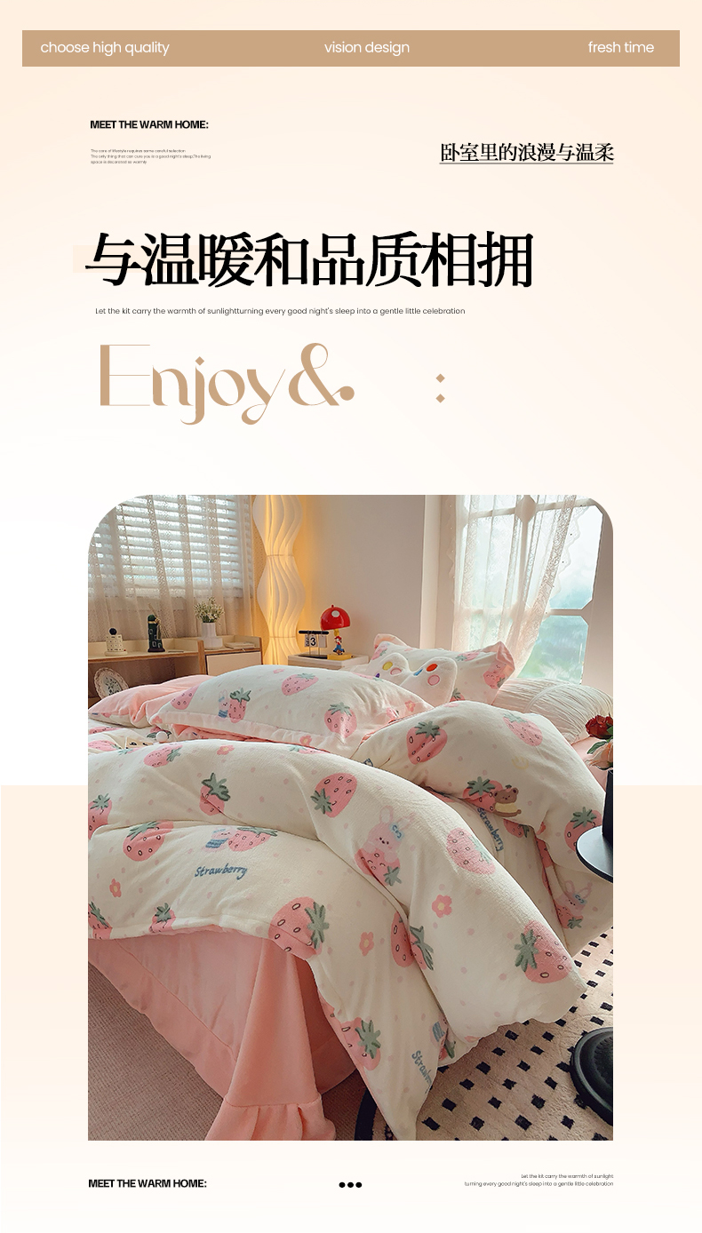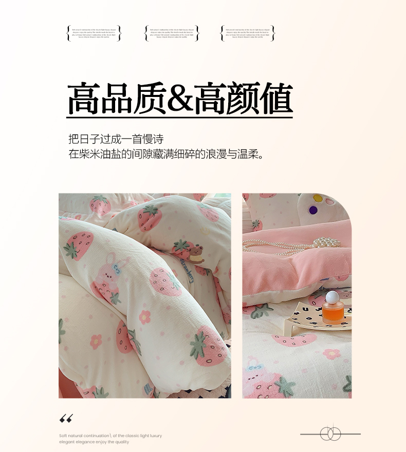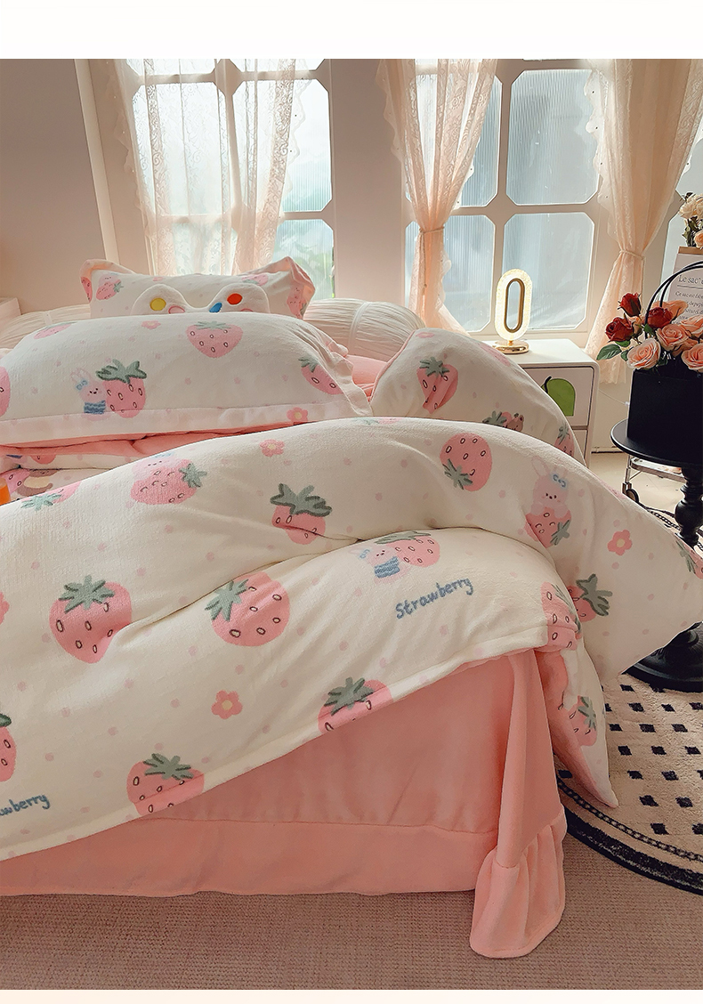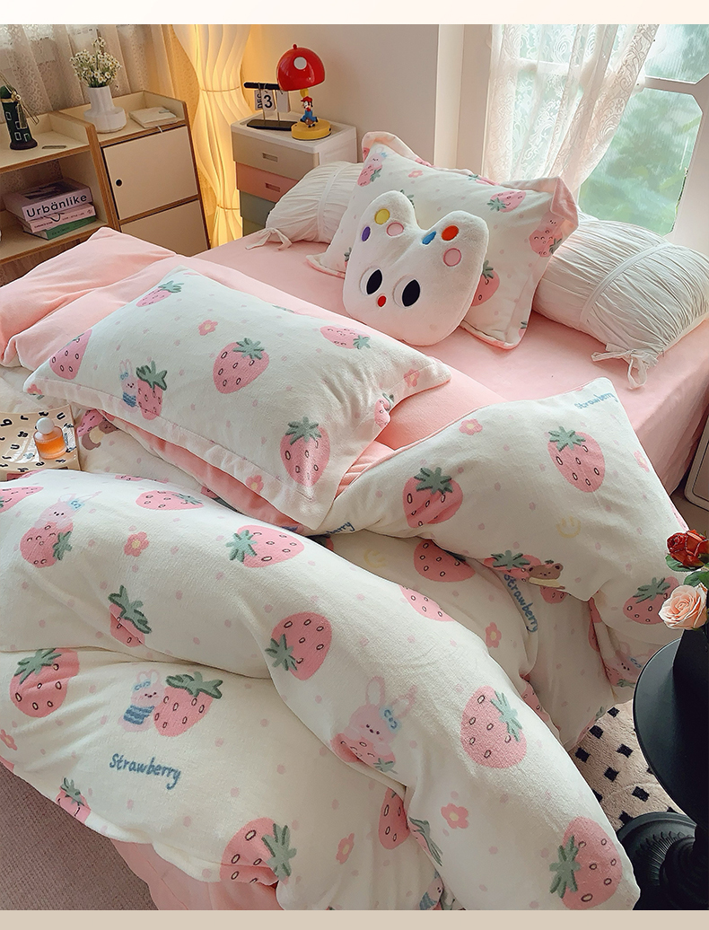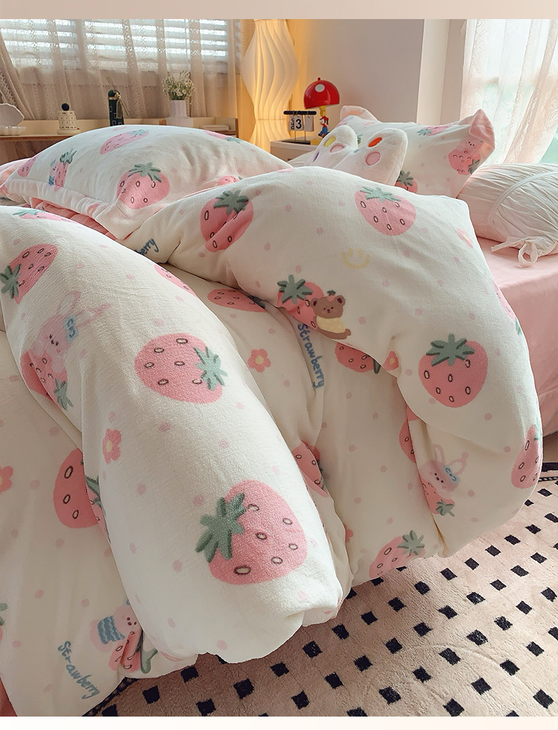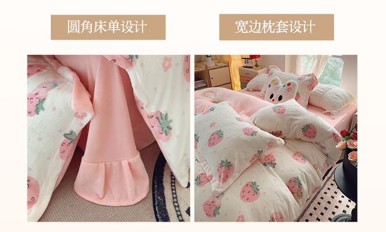商品名称:奈萝家纺 2025新款加厚小清新印花牛奶绒三件套四件套 奶油草莓