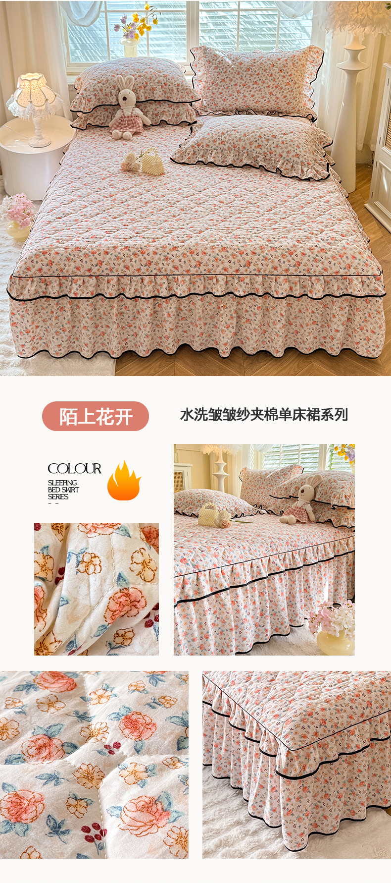 • 91家纺网 家纺一手货源 找家纺 优家居 2025新品水洗棉夹棉床裙单件三件套韩版水洗皱皱纱夹棉床盖床罩直播爆款 粉雾结语