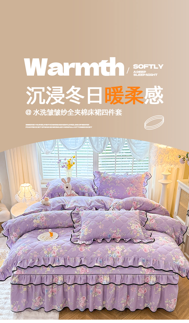 商品名称:(总)优家居 2025新品水洗棉全夹棉床裙四件套韩版糯糯棉水洗皱皱纱床罩花边被套枕套直播爆款