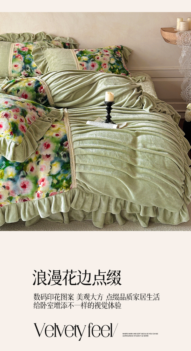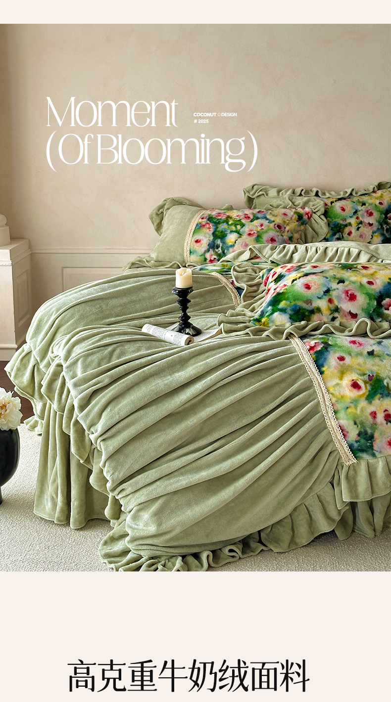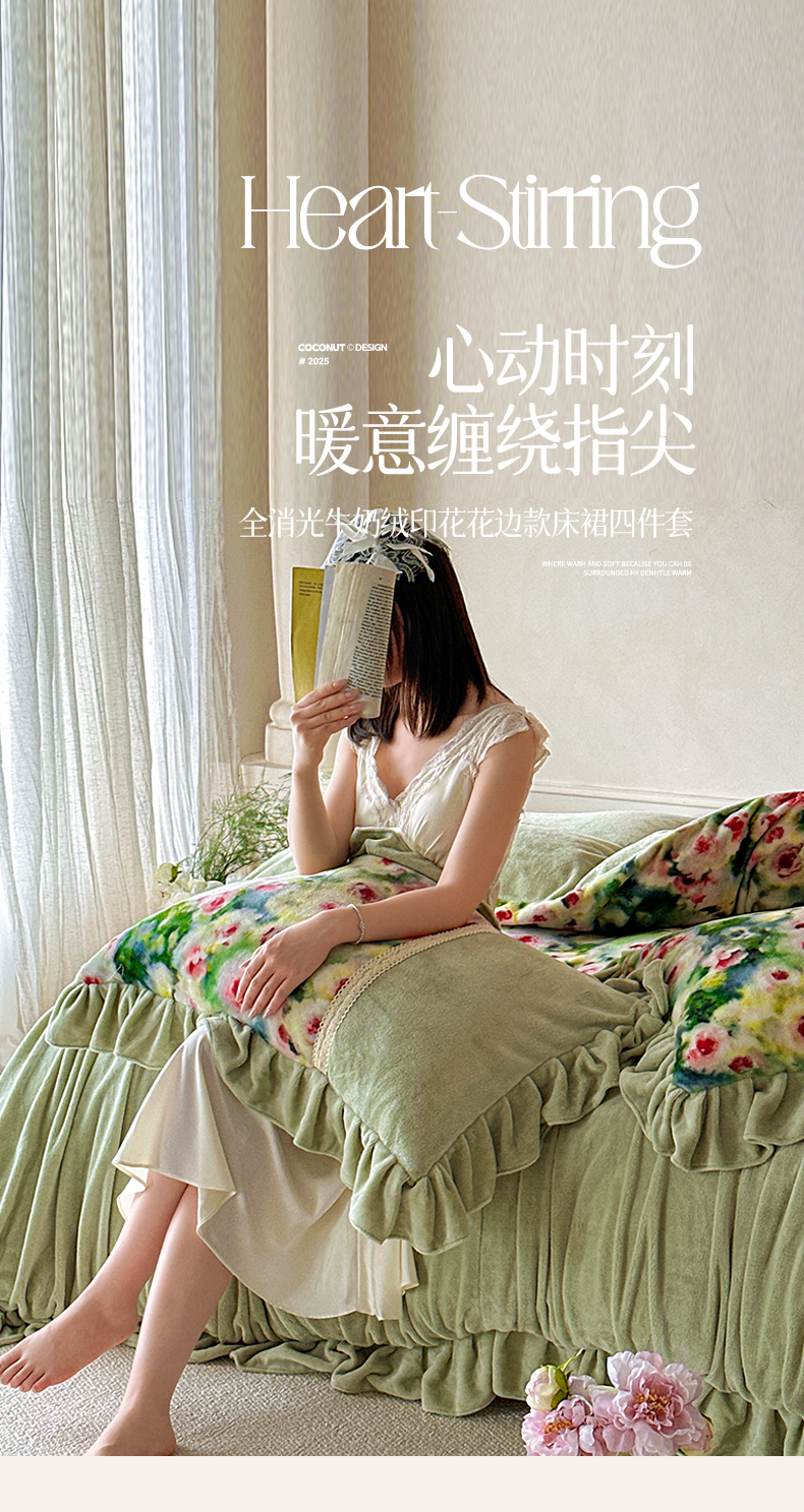 瑞宝 2025新款全消光牛奶绒床裙四件套-花期如梦 花期如梦-青柠绿