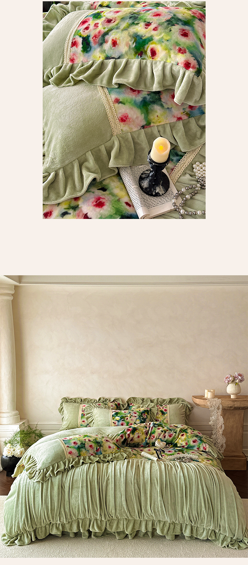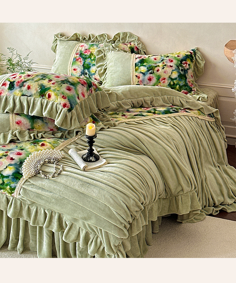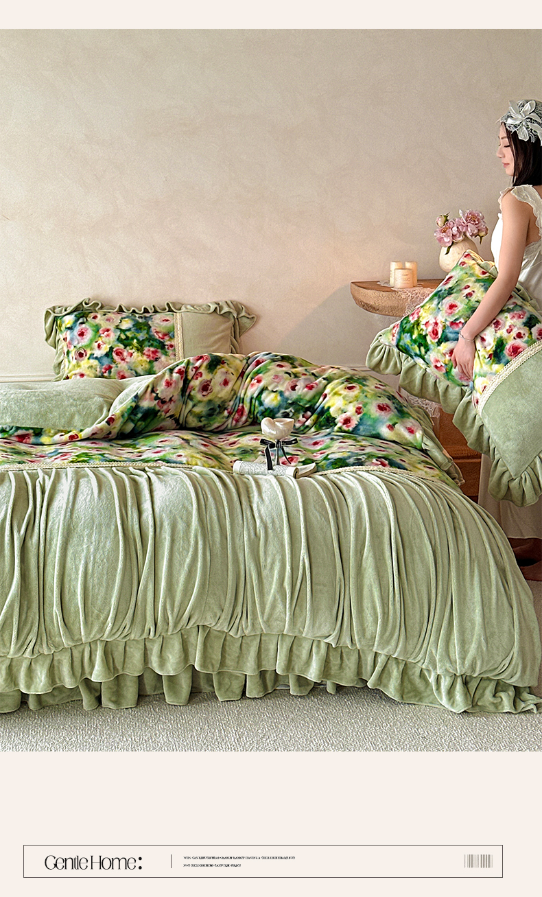 瑞宝 2025新款全消光牛奶绒床裙四件套-花期如梦 花期如梦-青柠绿