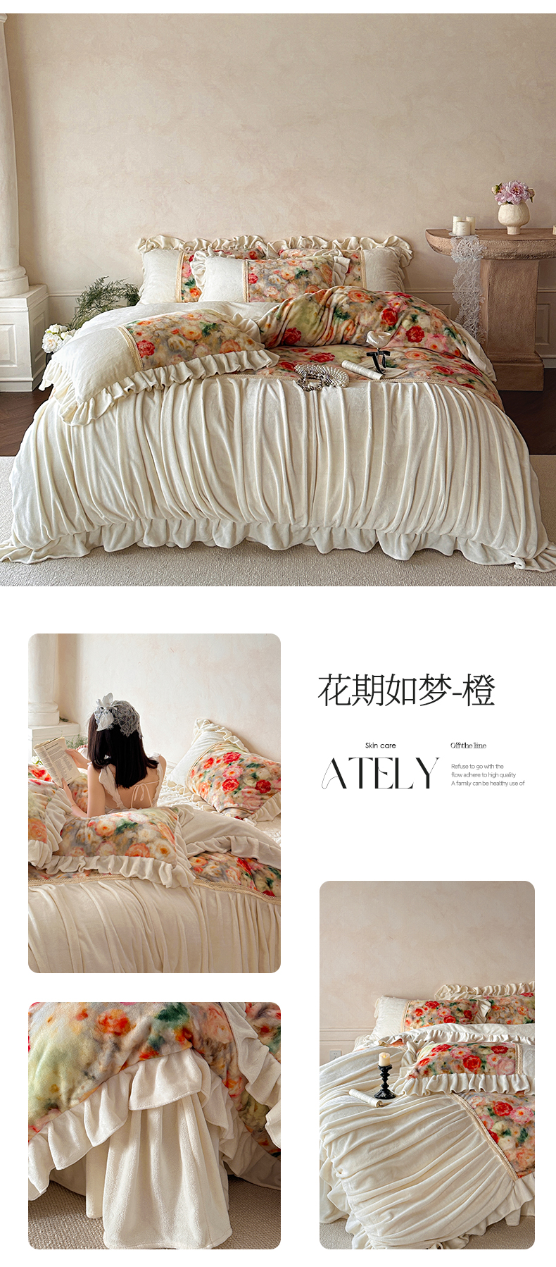 (总)瑞宝 2025新款全消光牛奶绒床裙四件套-花期如梦,花期如梦-橙,花期如梦-蜜粉,花期如梦-青柠绿
