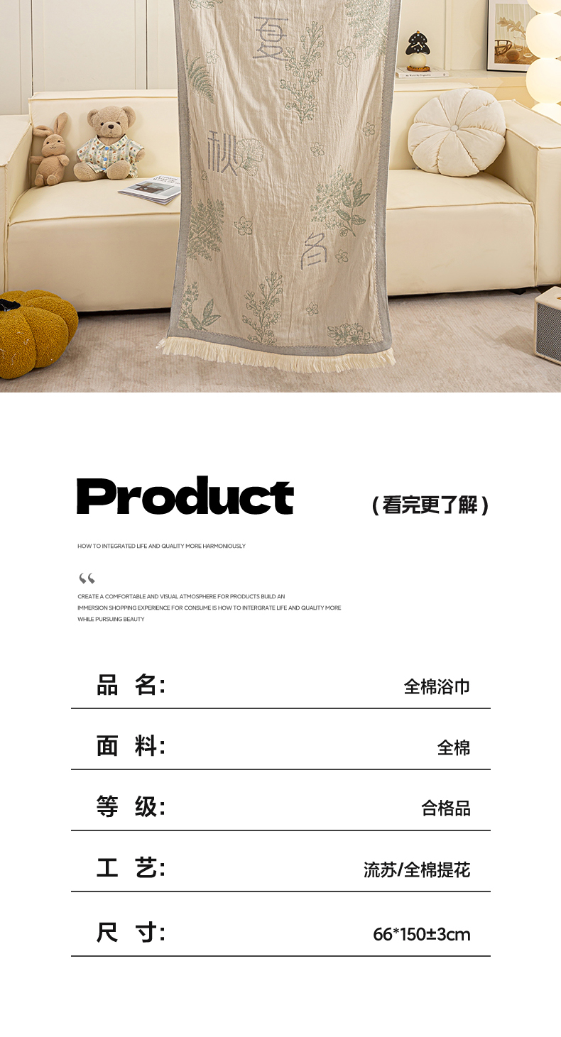 商品名称:恋人优选 2025新款A类流苏全棉纯棉提花四层水洗浴巾 春夏秋冬-米 66x150cm