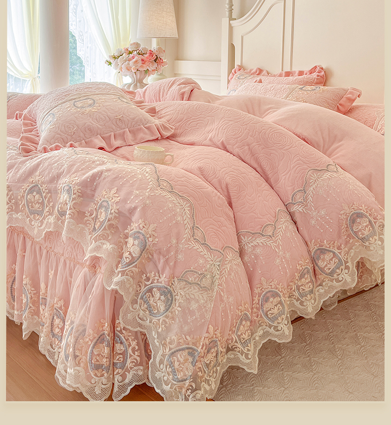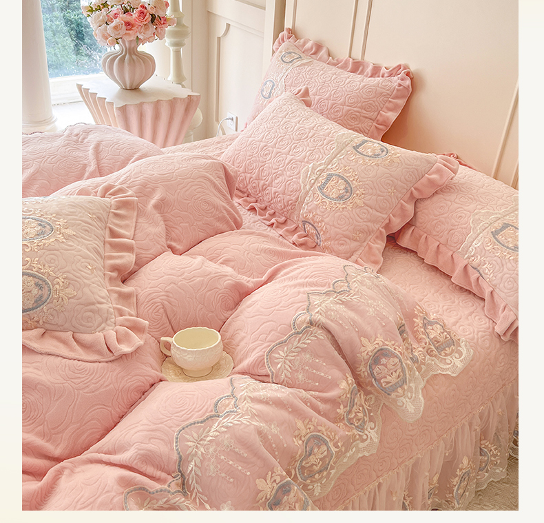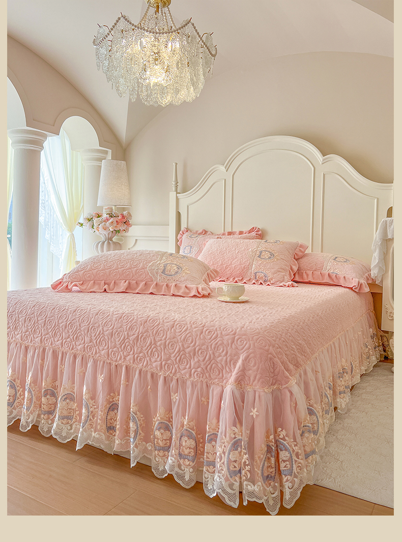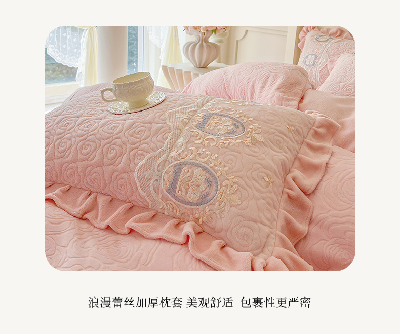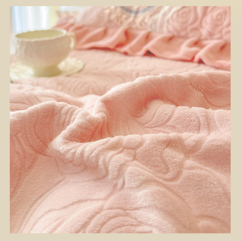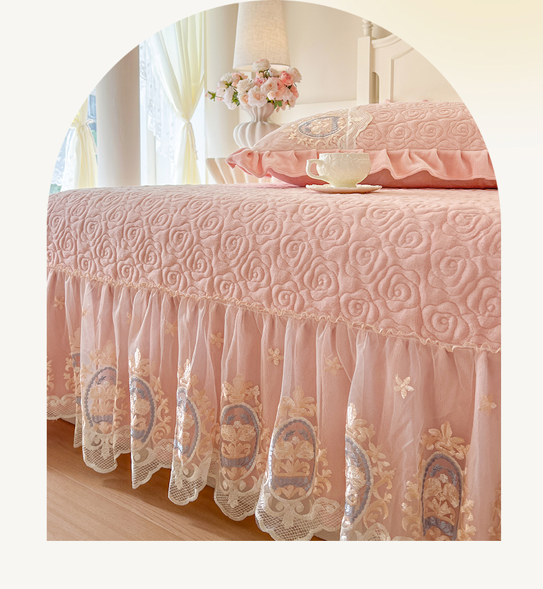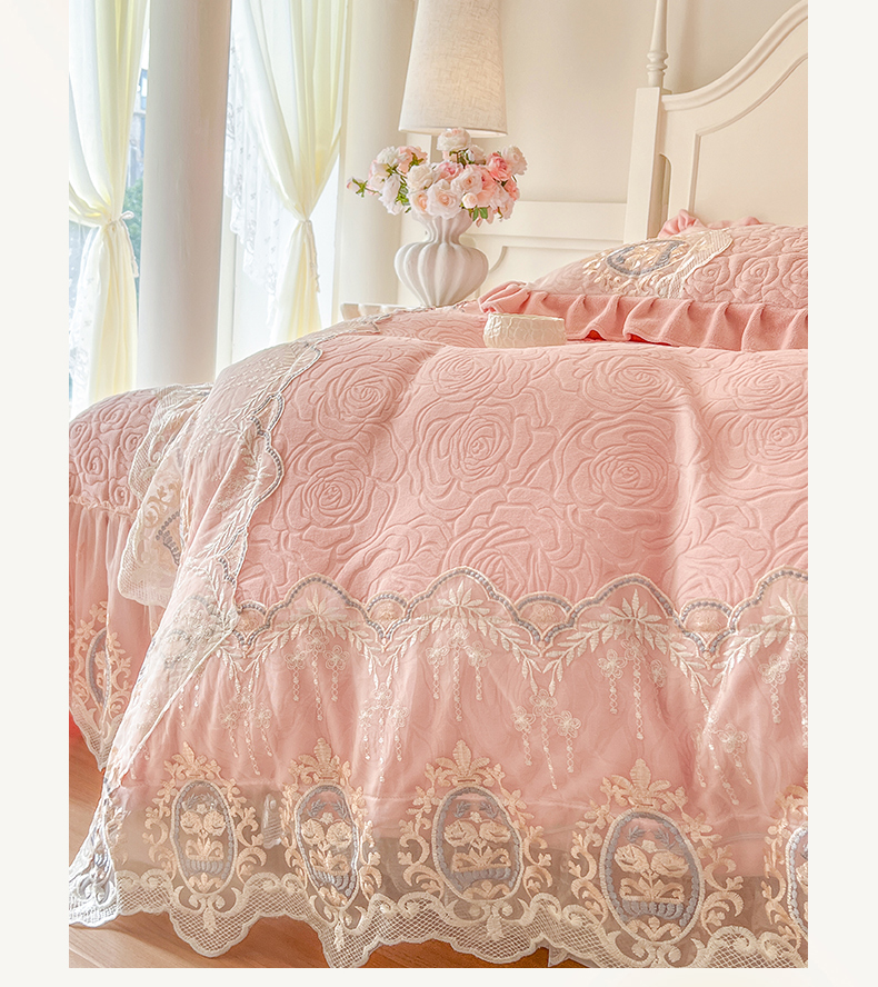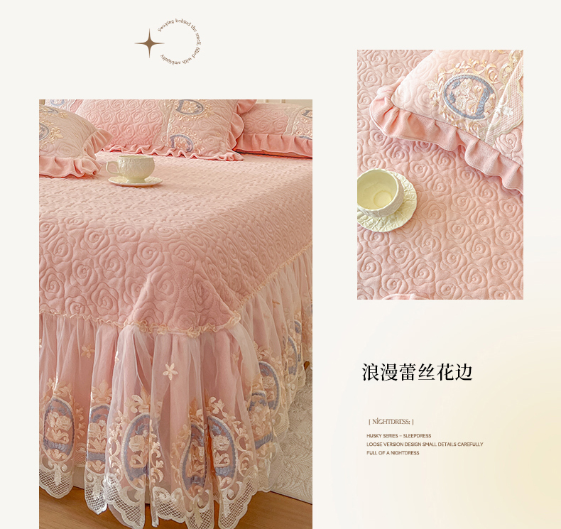 商品名称:恋尚 2025新款雕花牛奶绒绗缝夹棉床盖单品-可可西里(控价145起) 可可西里-清新粉