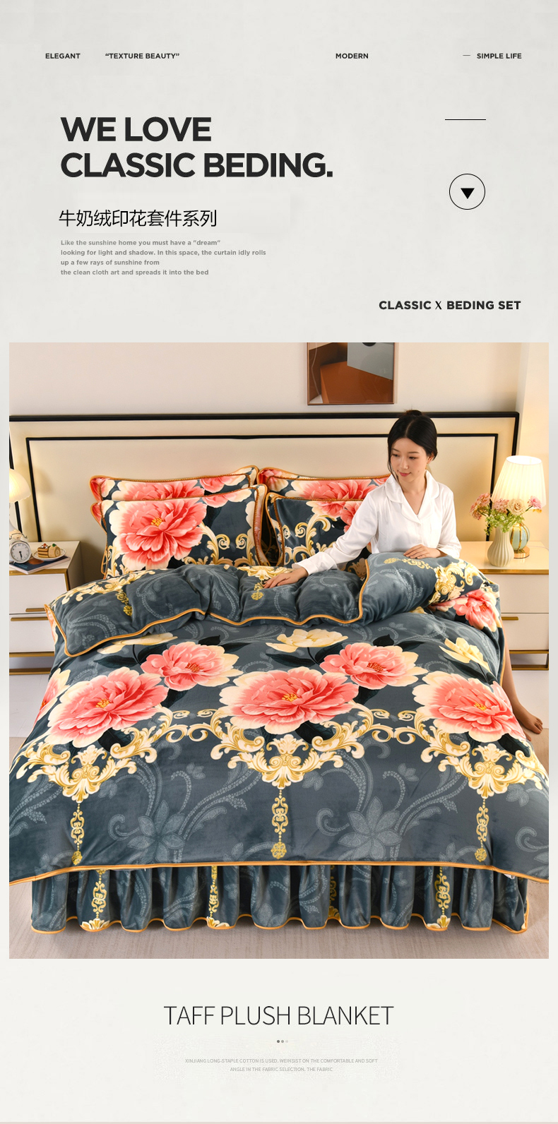 商品名称:栩裕纺织 2025新款230高克重牛奶绒法莱绒印花四件套-直播热款8斤半 情定今生