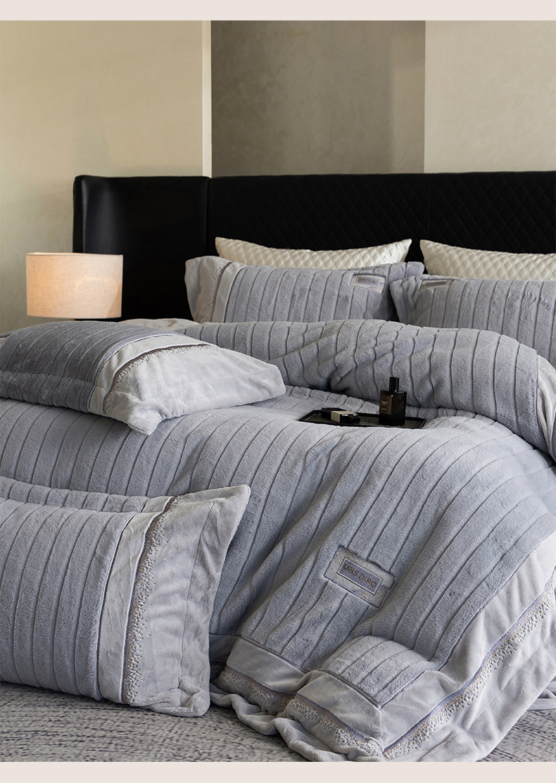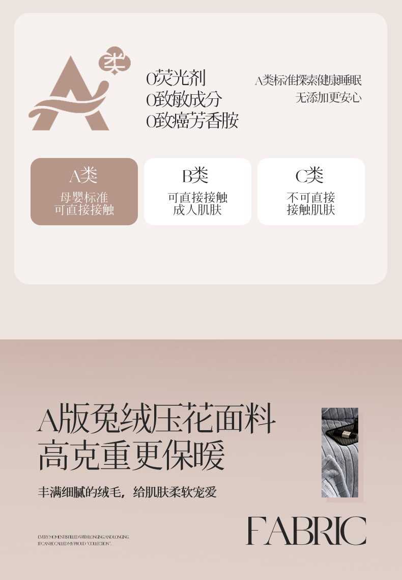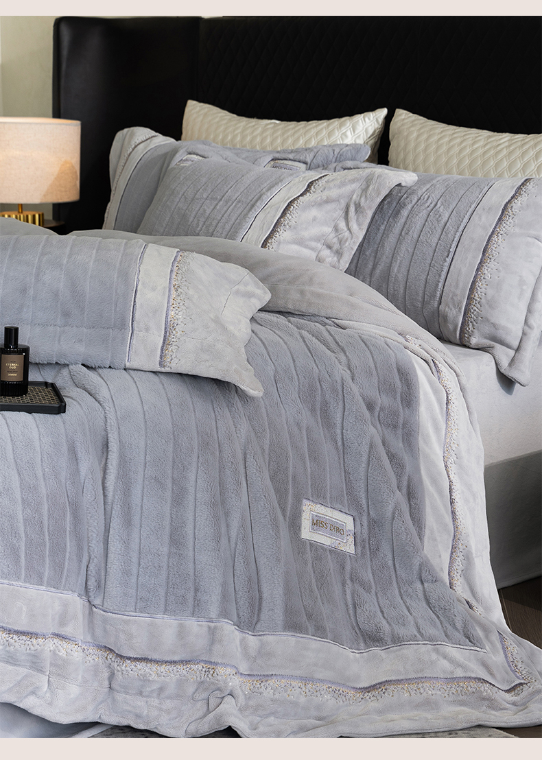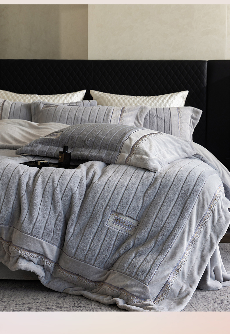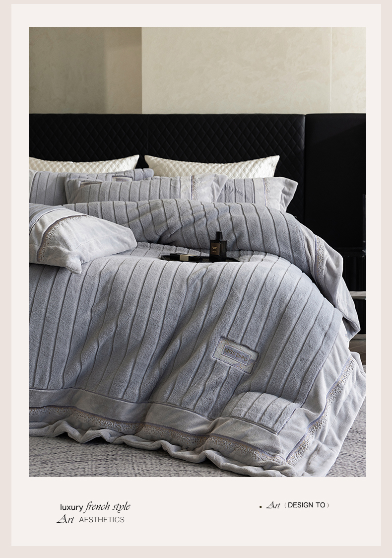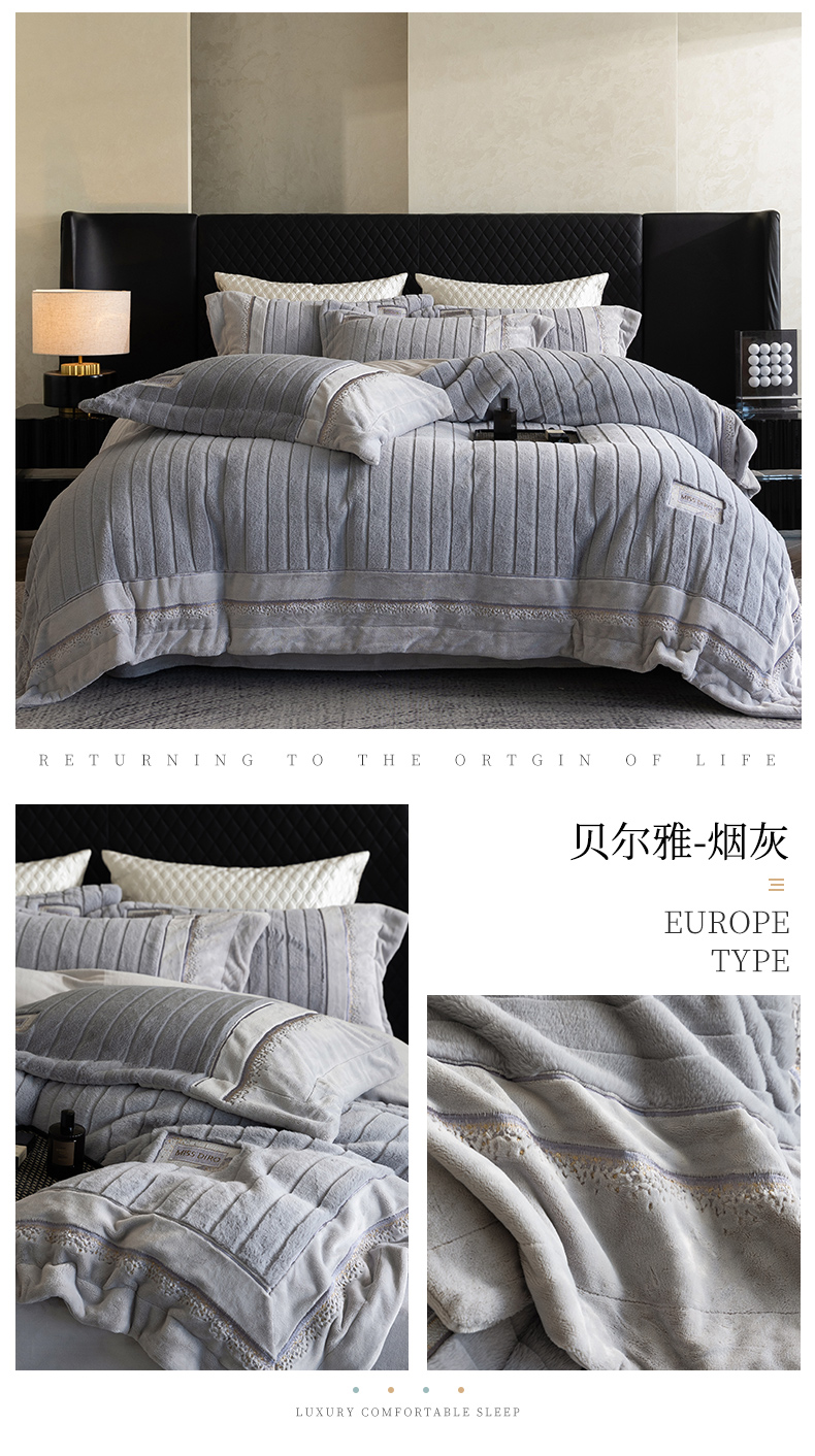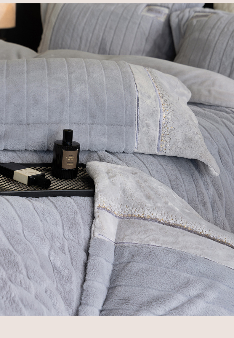 商品名称:鼎飞家纺 2025新款A类兔绒压花+全消光牛奶绒四件套--贝尔雅系列 贝尔雅-烟灰
