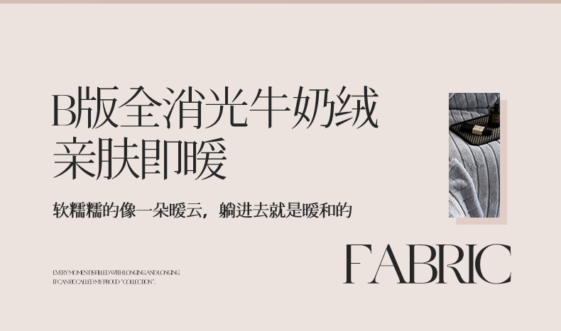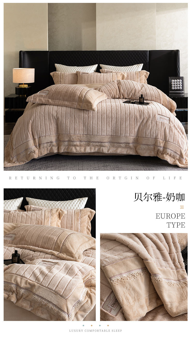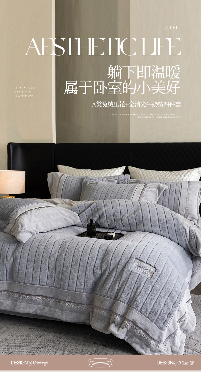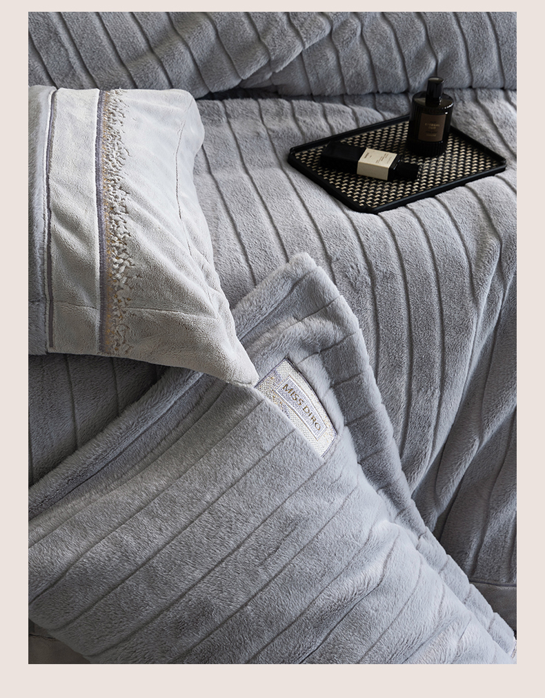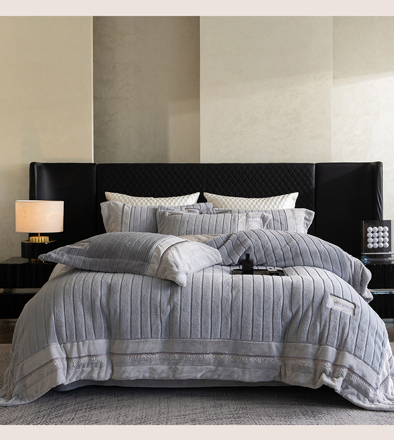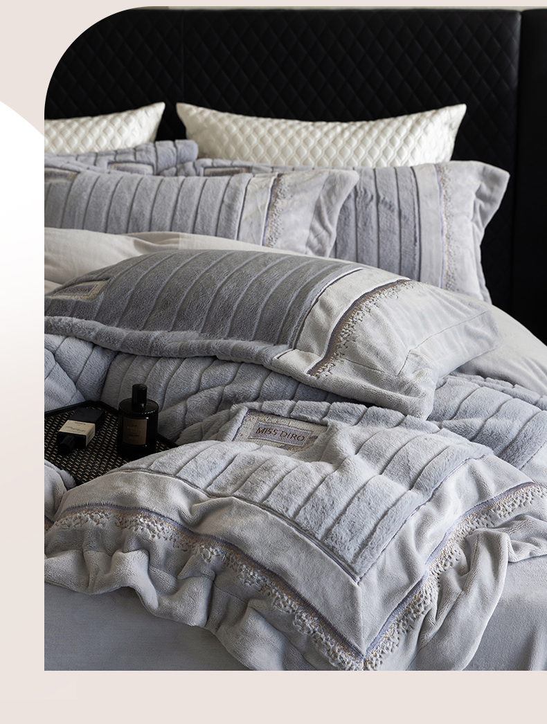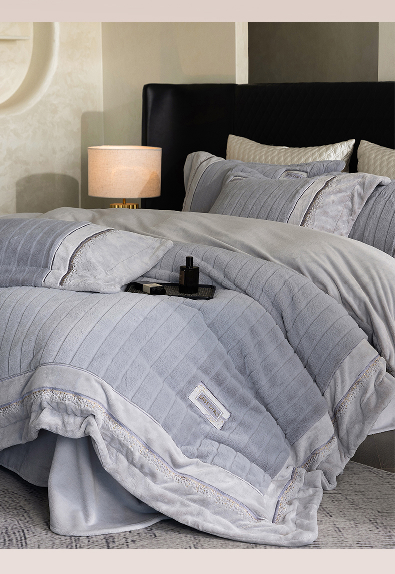 商品名称:鼎飞家纺 2025新款A类兔绒压花+全消光牛奶绒四件套--贝尔雅系列 贝尔雅-烟灰