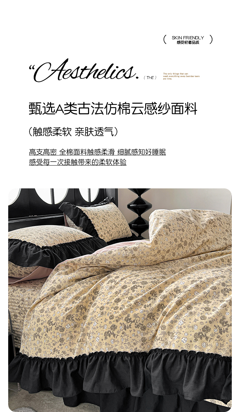 当前位置: 91家纺网 > 商品网购 > 床品套件 > 四件套 > 其它四件套 > 富米莱(原臻工厂) 2026新款法式赫本风大花边A类古法仿棉云感纱床盖床裙四件套 花影浅吟