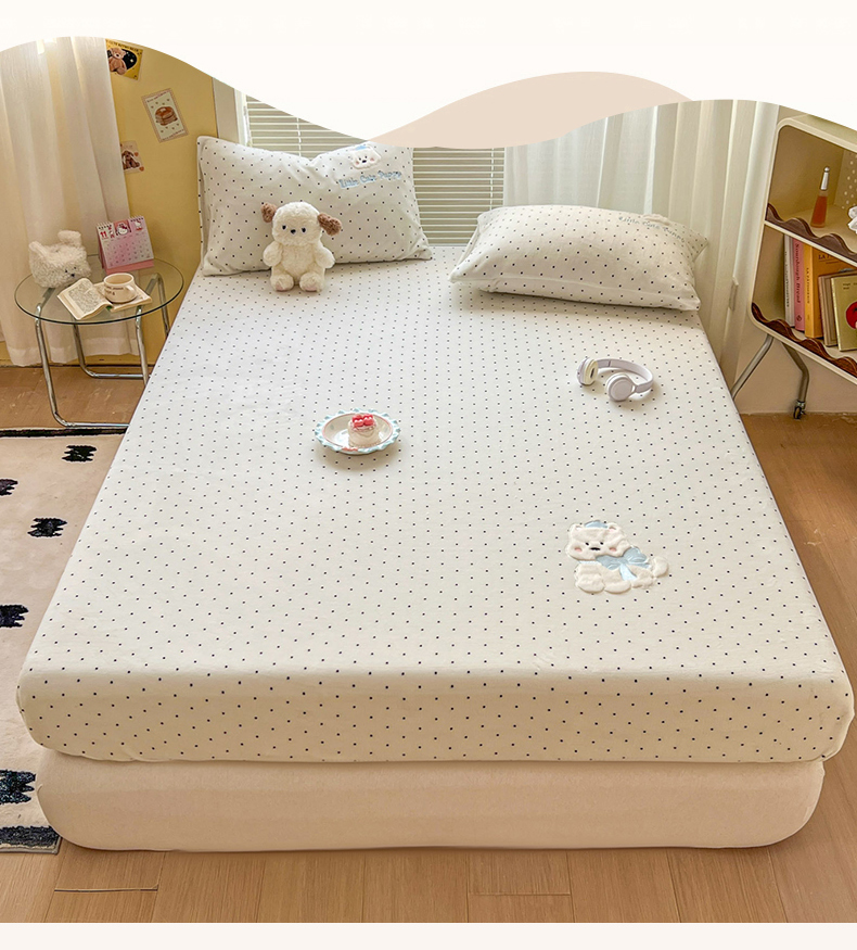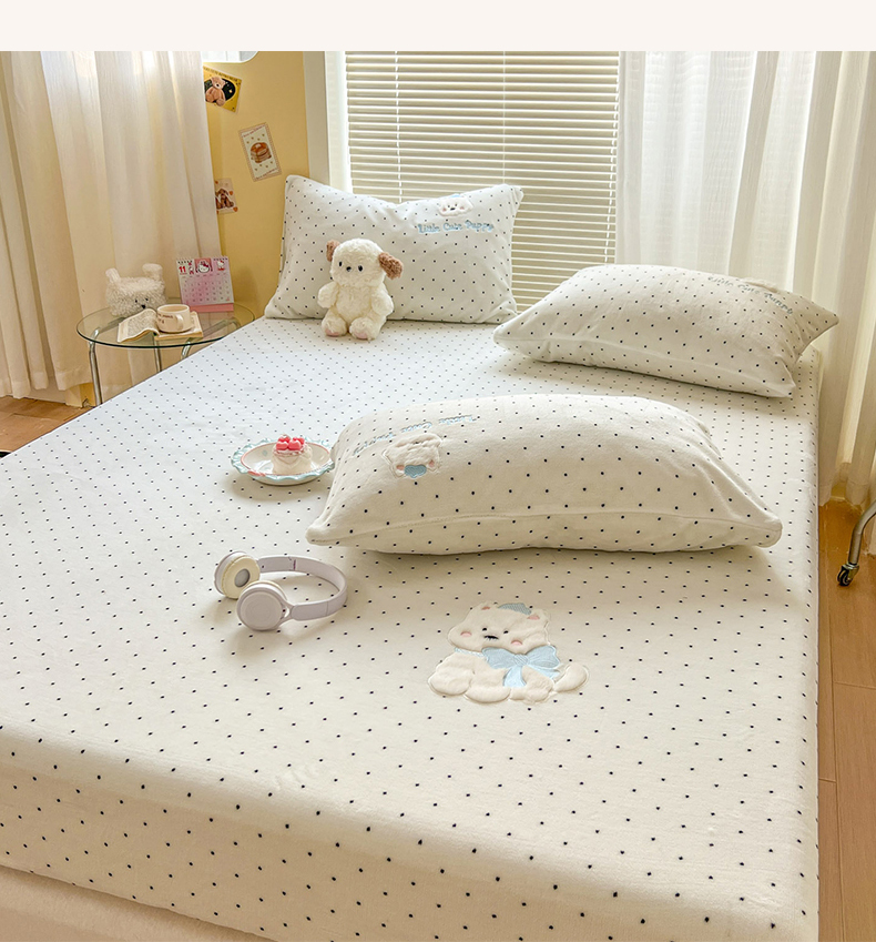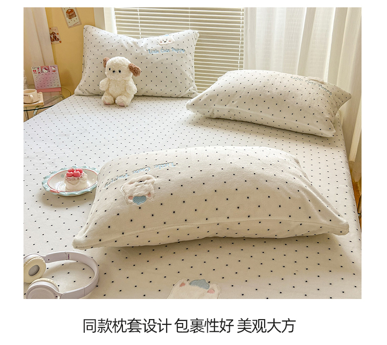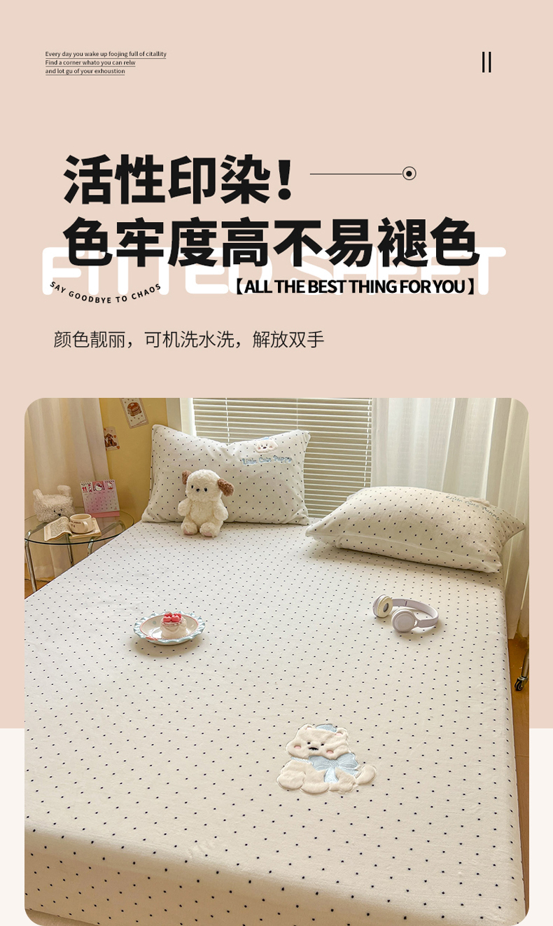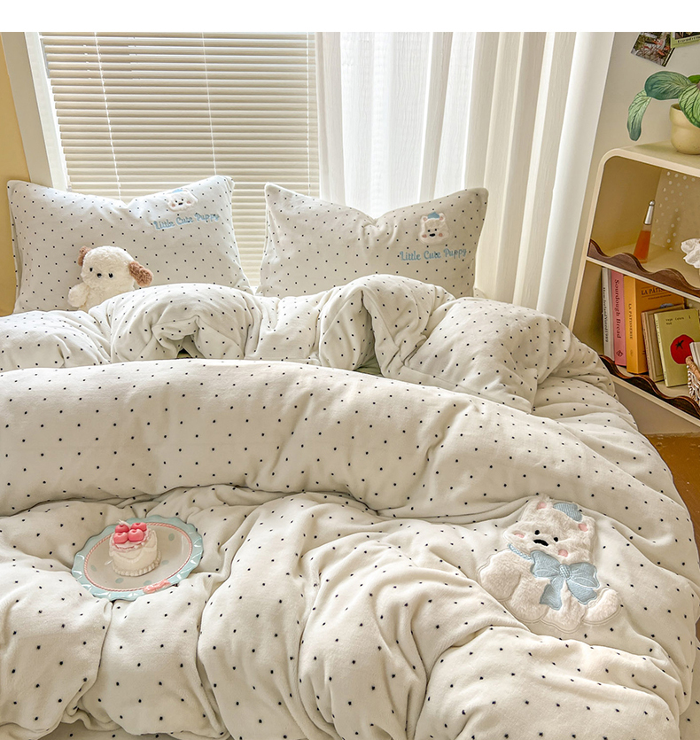 (总)十里居 2026新款韩系牛奶绒兔毛贴布绣床笠三件套四件套,波点小狗蓝,波点小狗白,波点小狗粉,波点小狗咖