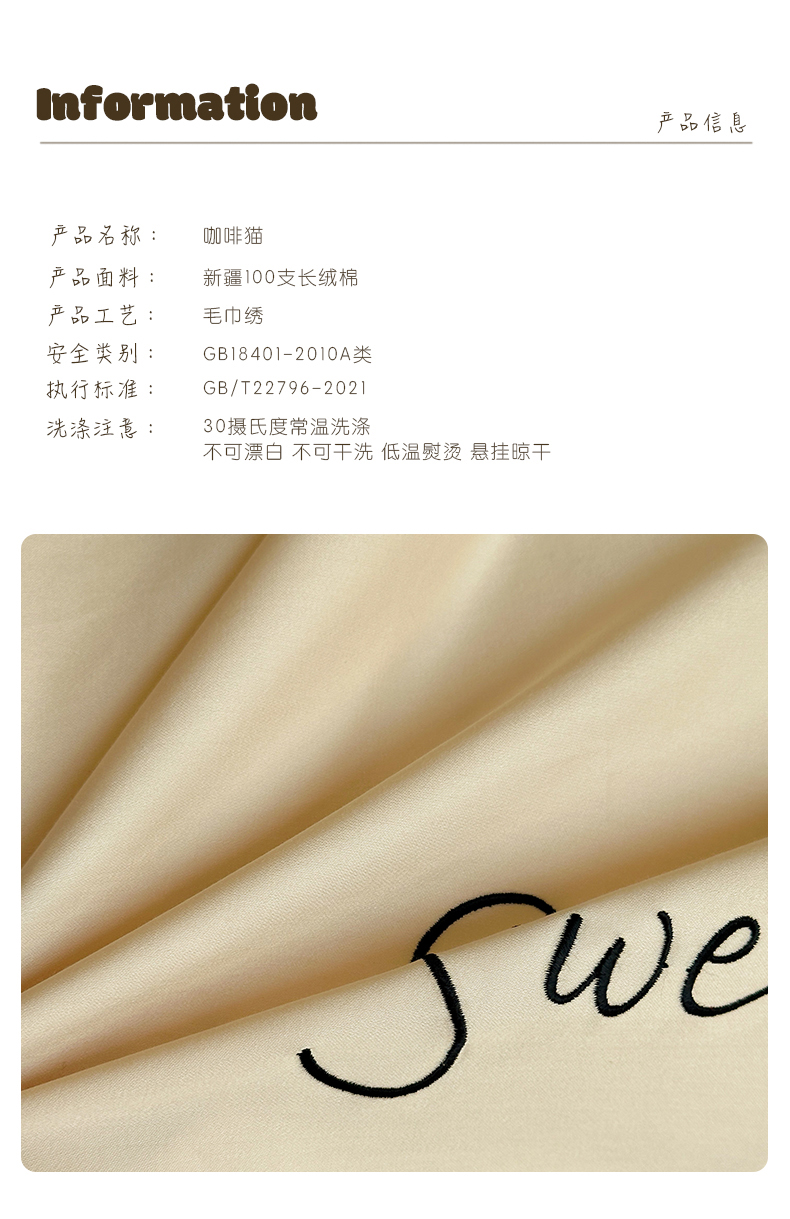 商品名称:波比可可 2026新款50s长绒棉纯棉全棉居家轻奢刺绣四件套 咖啡猫