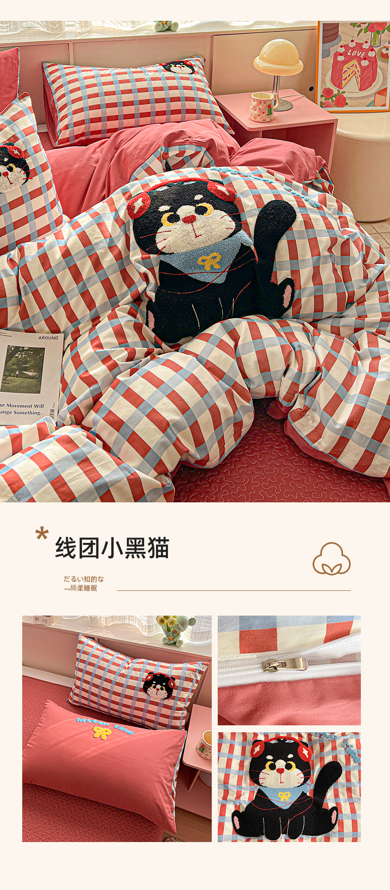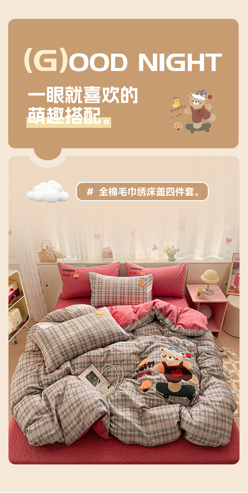 (总)鑫喜莱家纺 2026新款全棉纯棉13372床盖款原创毛巾绣四件套,滑板小熊仔,面包小狗,线团小黑猫,星星人,酷酷的小熊,南瓜小兔,胖熊的星星,苹果小狗