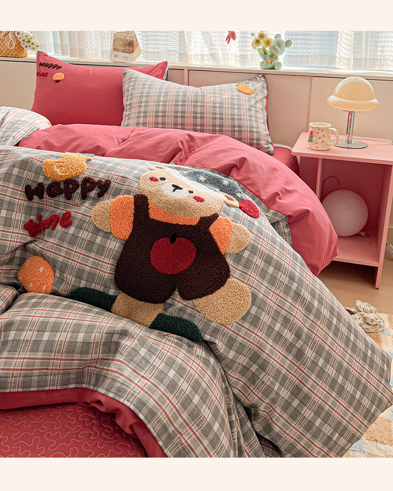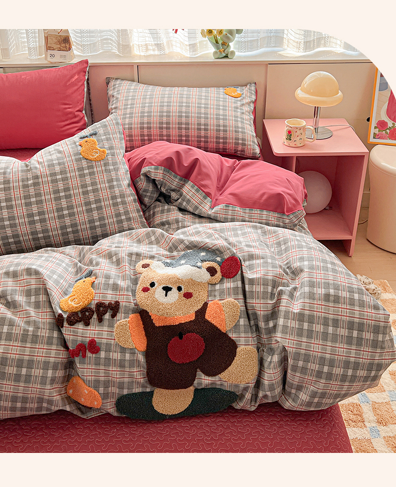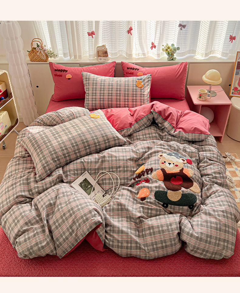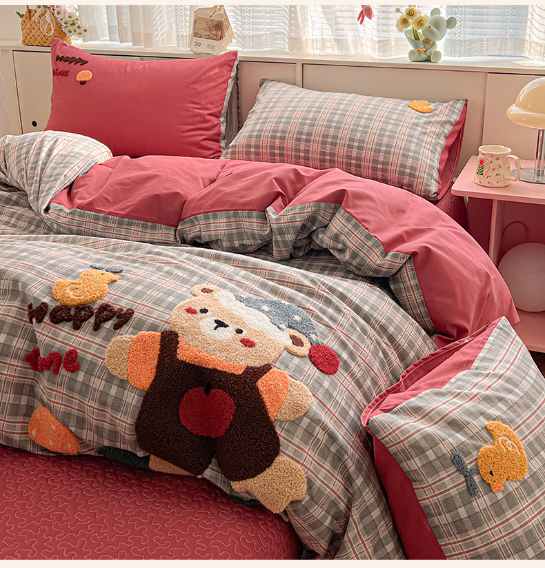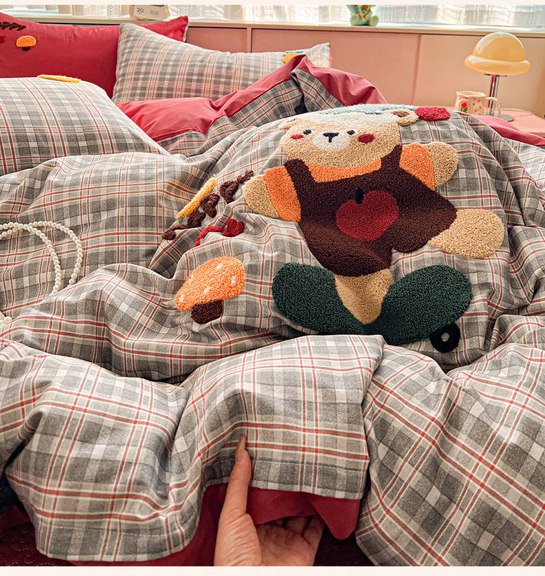 鑫喜莱家纺 2026新款全棉纯棉13372床盖款原创毛巾绣四件套 滑板小熊仔