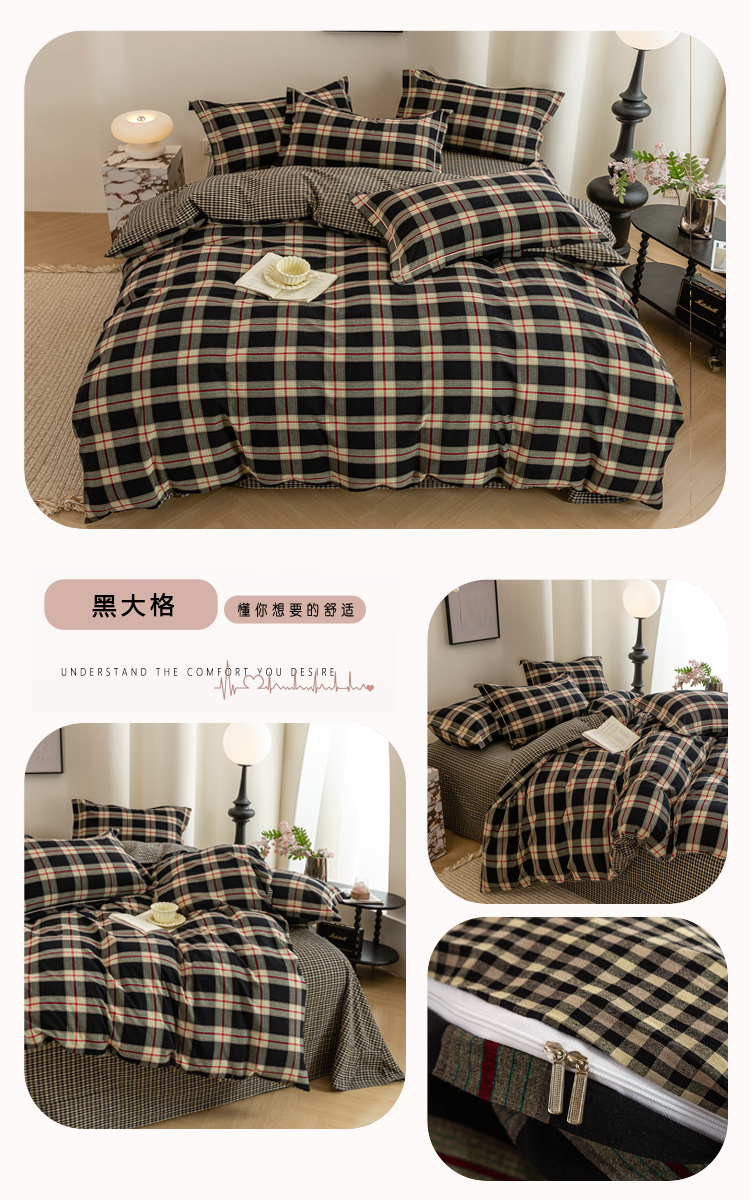 商品名称:喜四方 2026新款全棉色织水洗棉四件套 黑大格