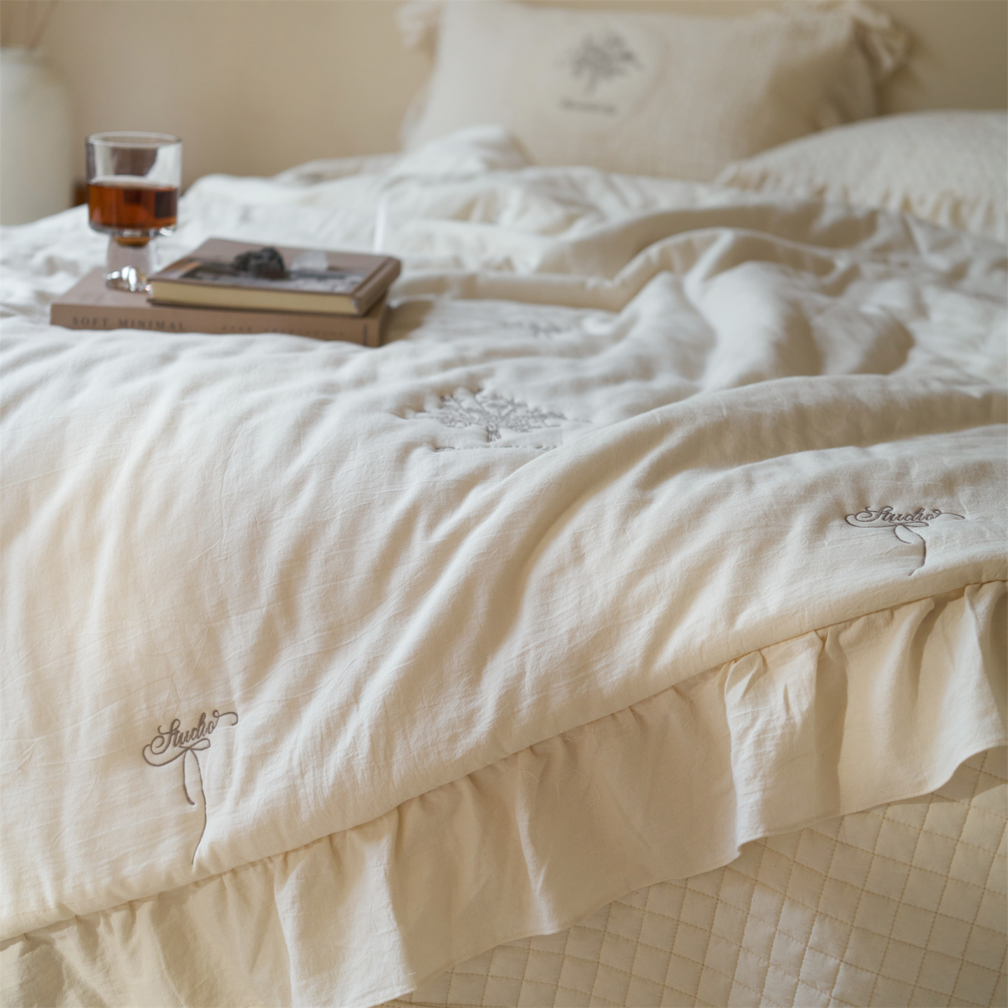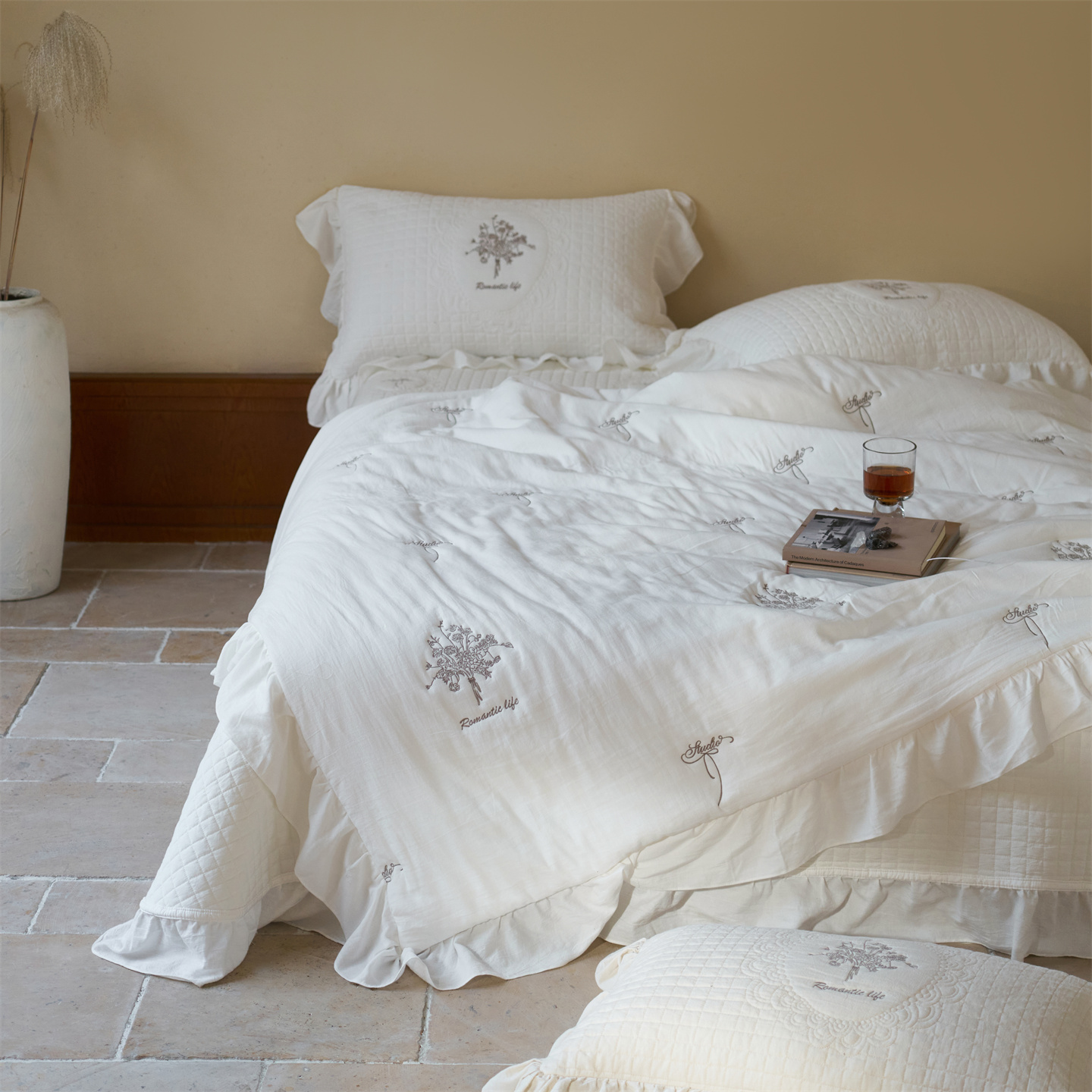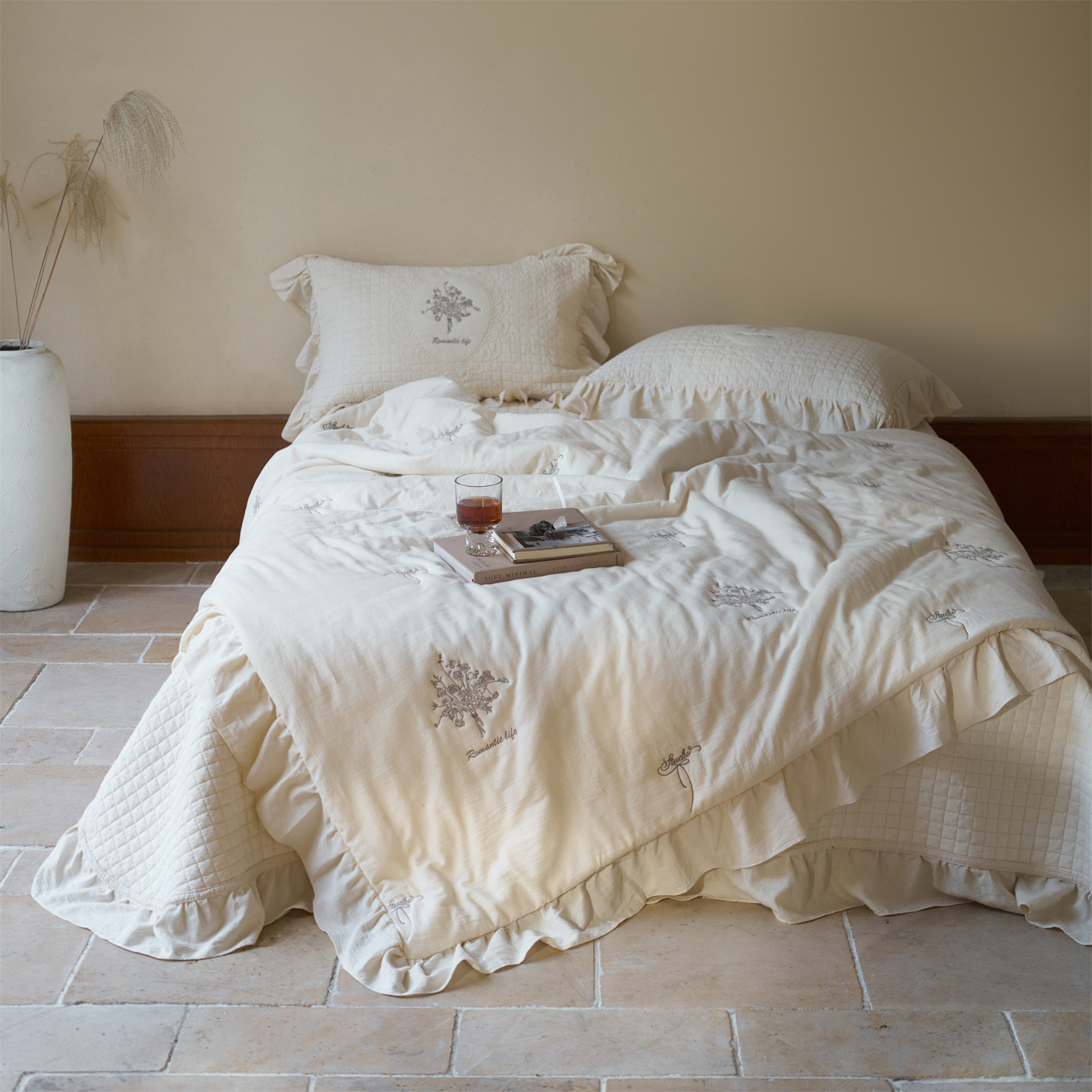 (总)上喜 2026新款棉麻小花刺绣款床盖多功能被子系列,麻本色,麻粉色