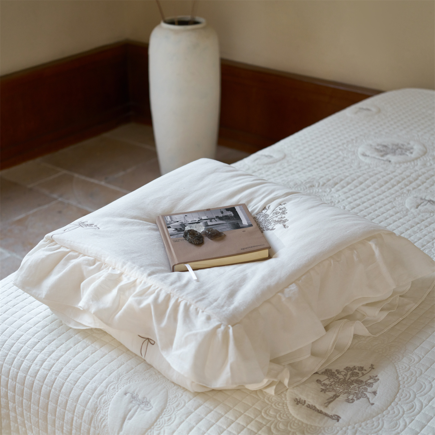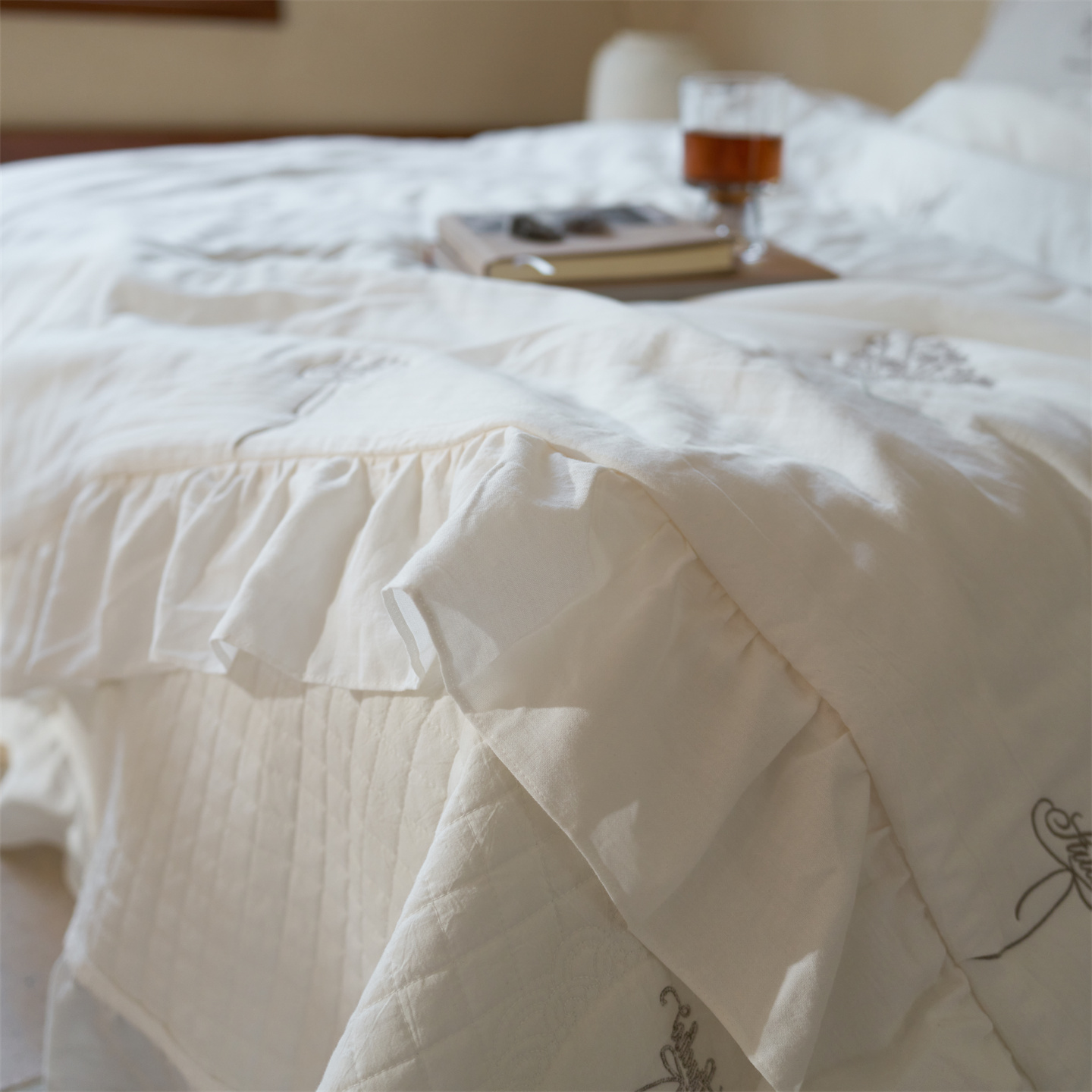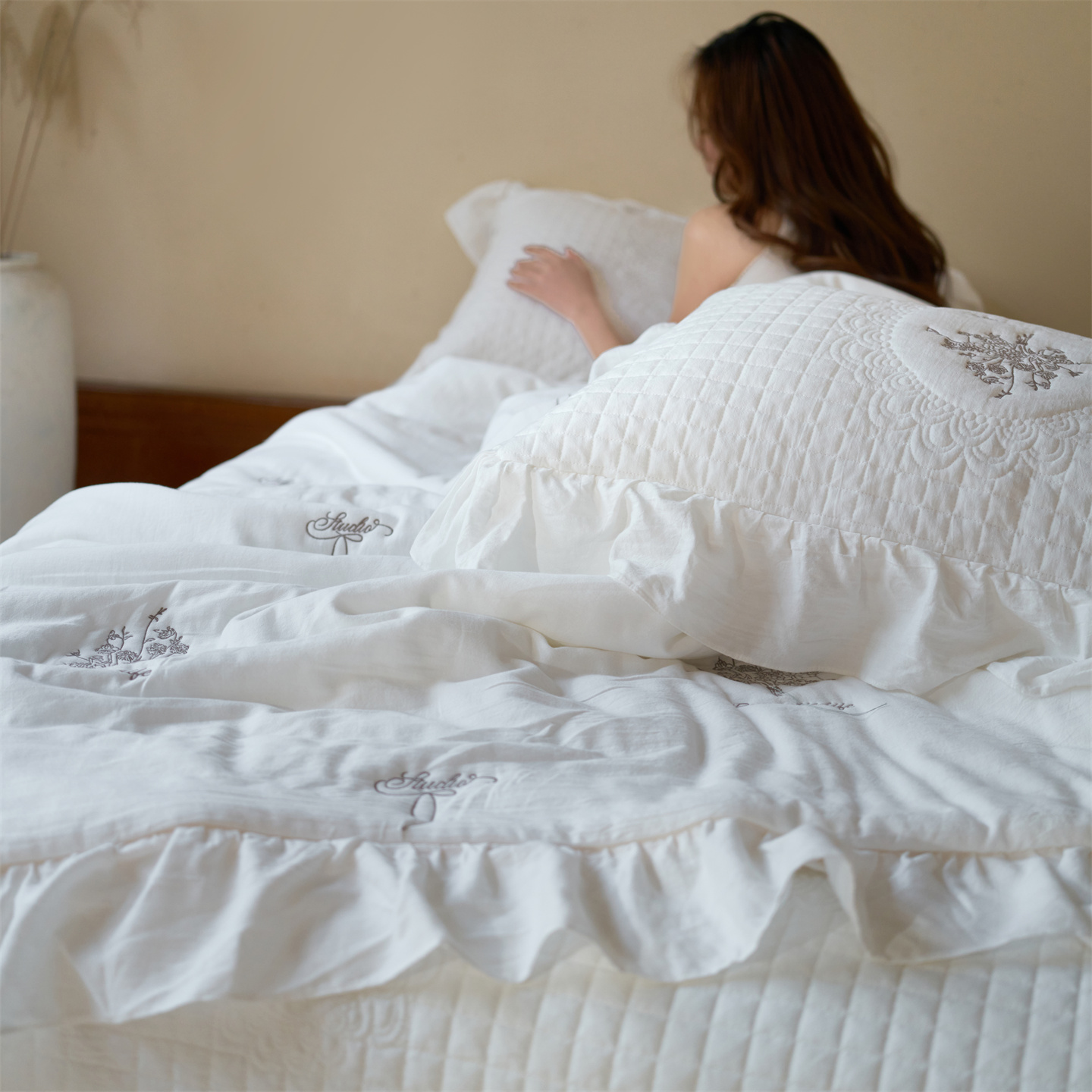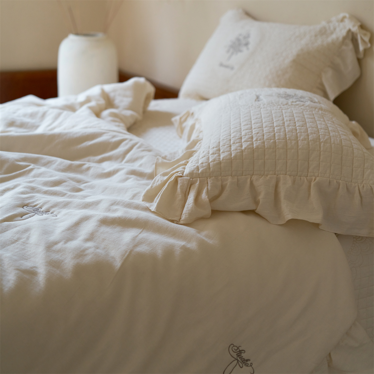 (总)上喜 2026新款棉麻小花刺绣款床盖多功能被子系列,麻本色,麻粉色