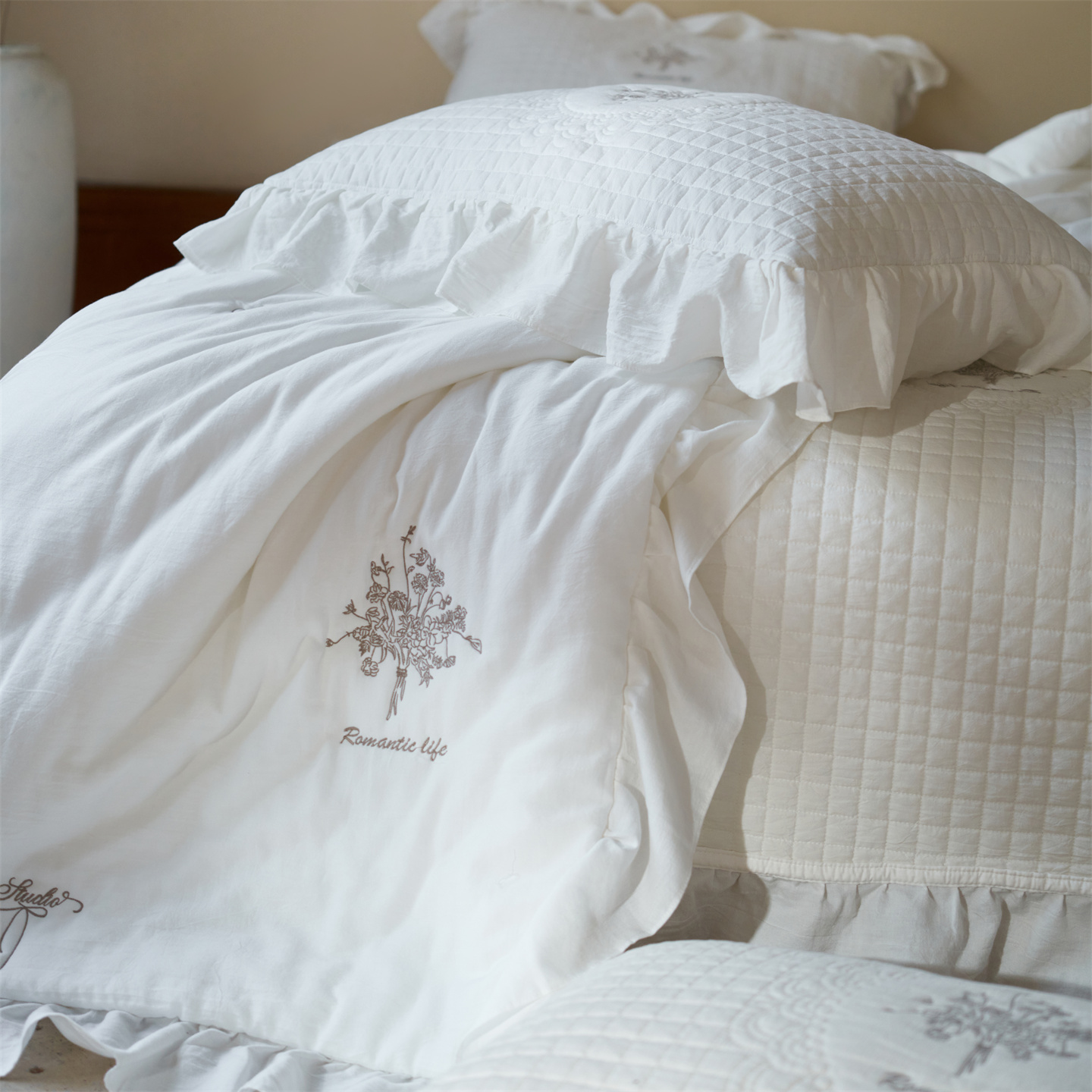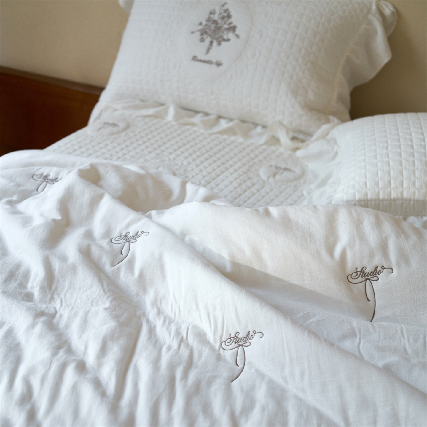 (总)上喜 2025新款全棉砂洗床盖新升级第五代,白色,湖蓝,奶油米,深灰,深咖