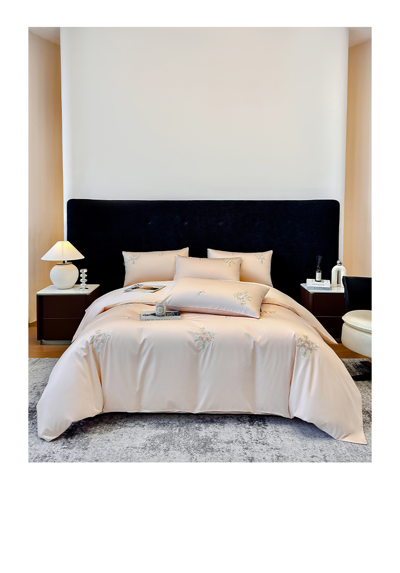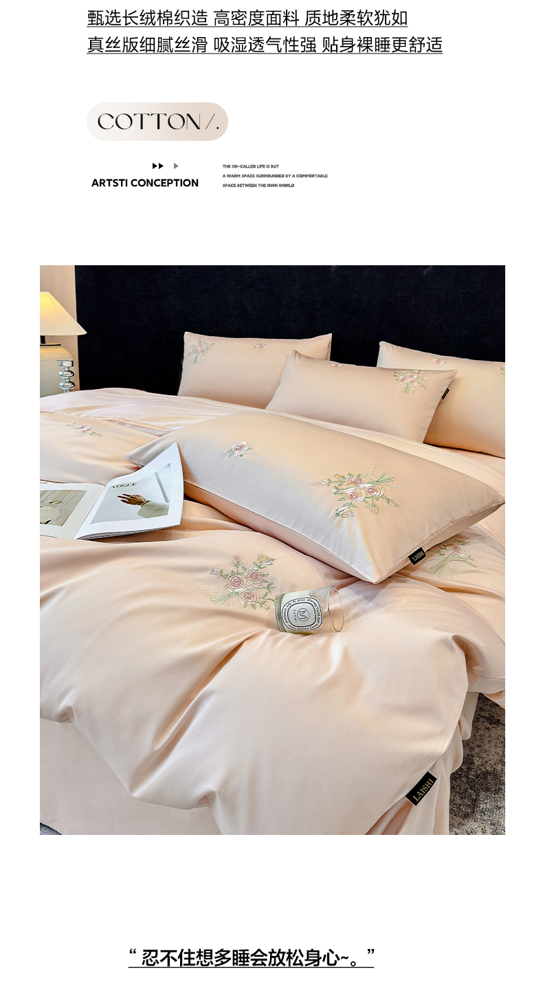 欣宜家纺 2026新款50s纯棉全棉贡缎长绒棉刺绣绣花床上四件套【含高端礼盒】-花影系列 花影-轻奢粉