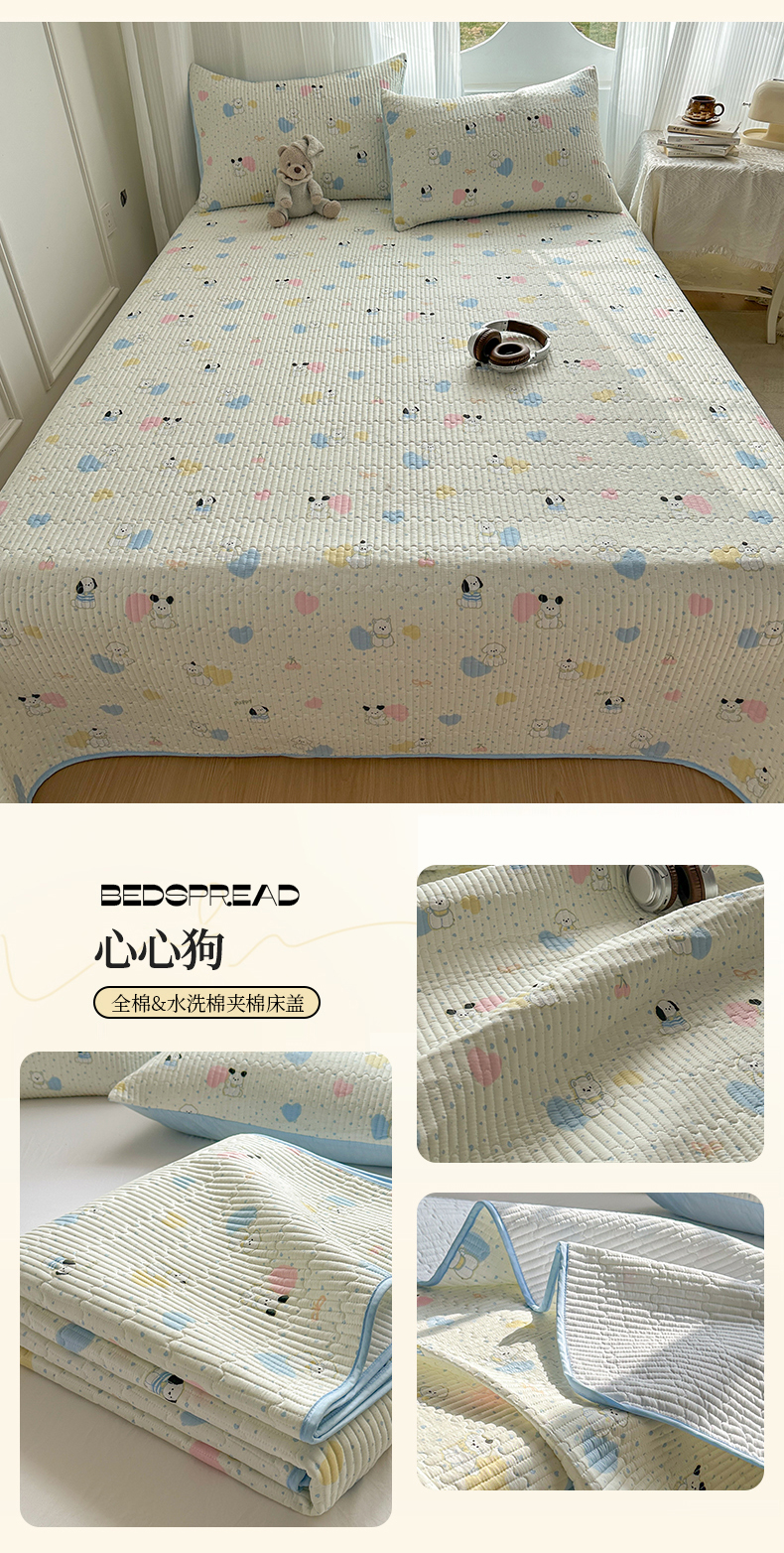 (总)KA家纺 2026春夏新款全棉印花小清新床盖三件套 第二波,贪睡猫,彼得小兔,樱桃熊仔,心心狗,曲奇小狗,格子小狗