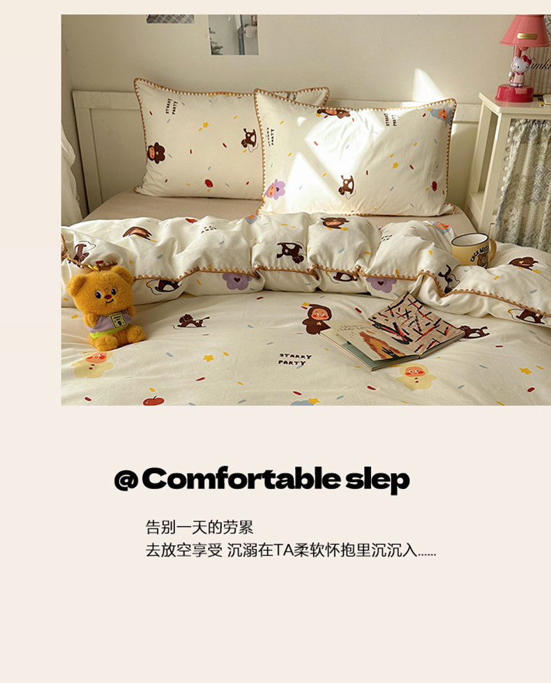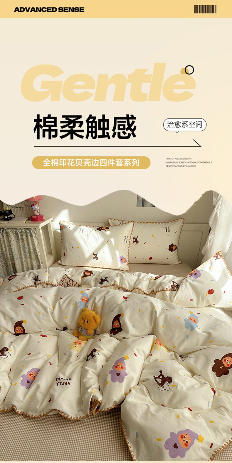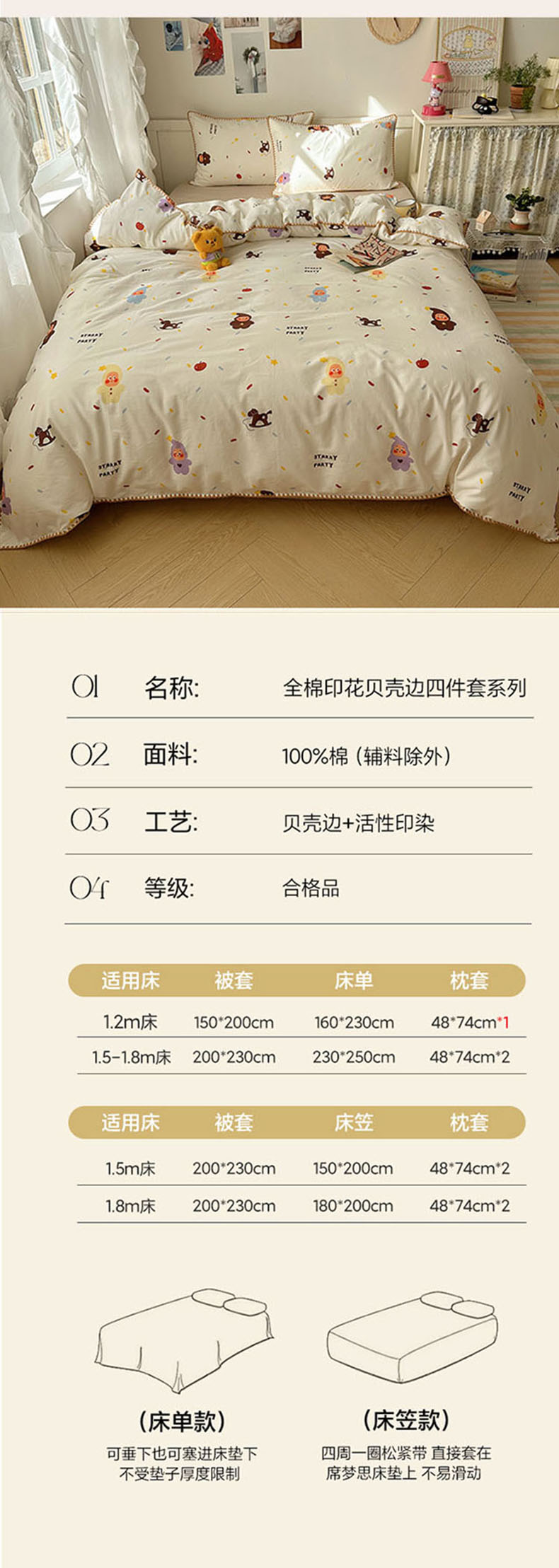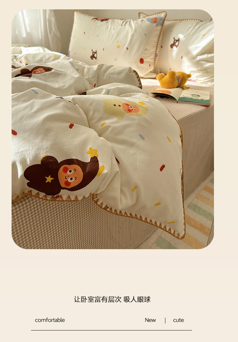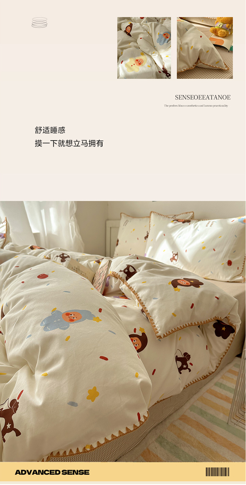 商品名称:桃子家居 2026新款A类纯棉三角针贝壳边工艺卡通撞色猫咪卡通全棉四件套 棉贝壳边-魔法木马