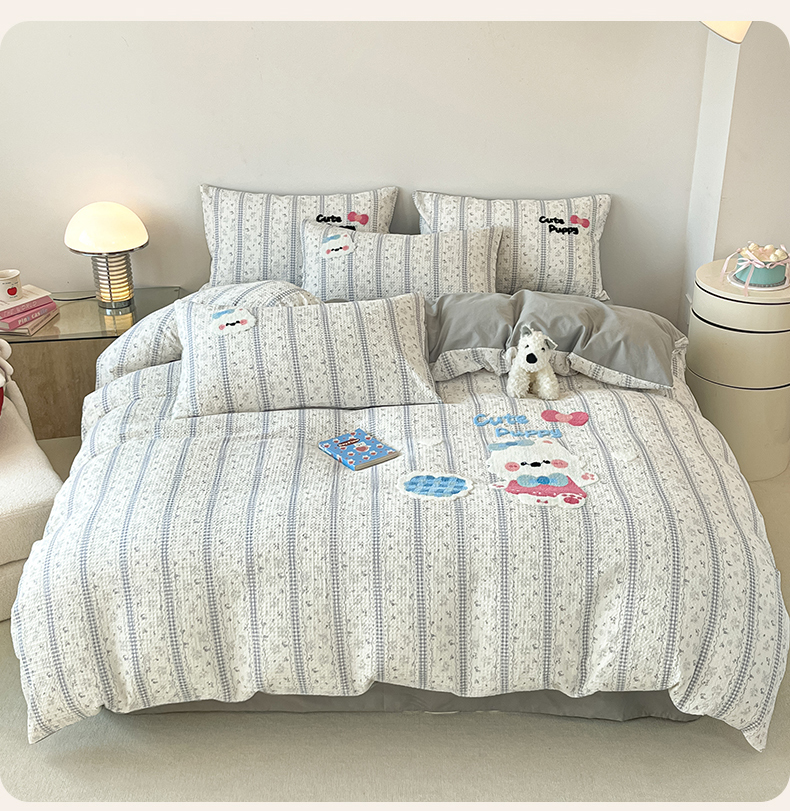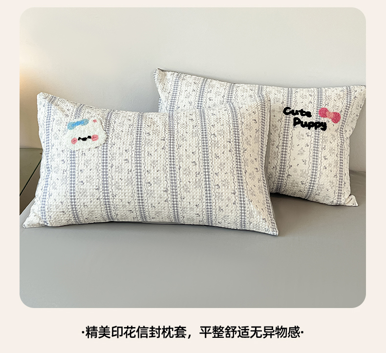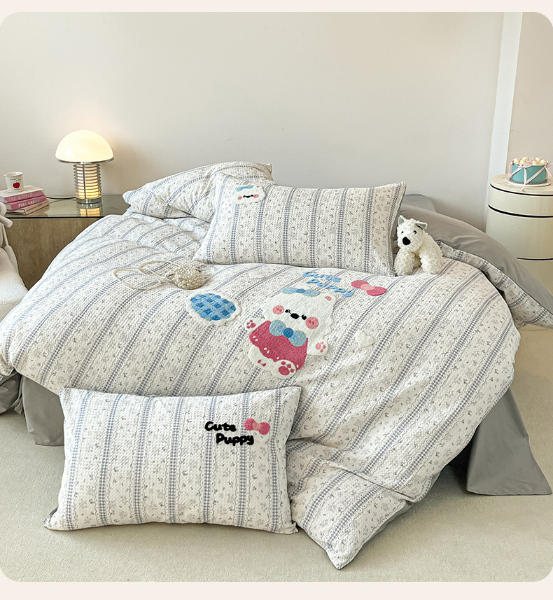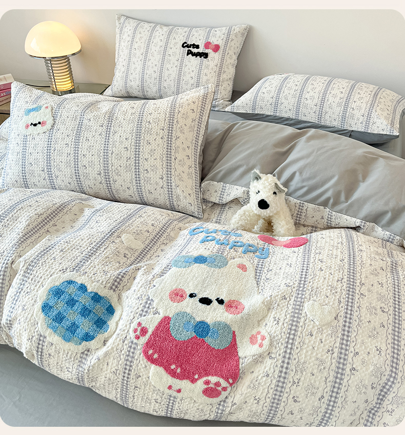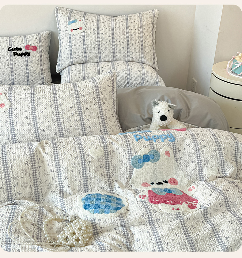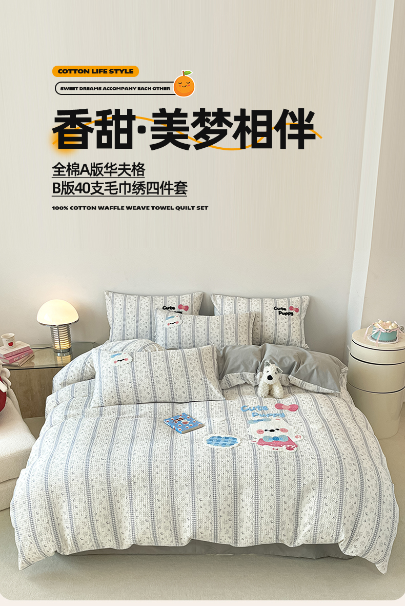 当前位置: 91家纺网 > 商品网购 > 床品套件 > 四件套 > 全棉普通四件套 > 眷恋家纺 2026新款全棉纯棉A版华夫格B版40支毛巾绣四件套 小狗宝宝