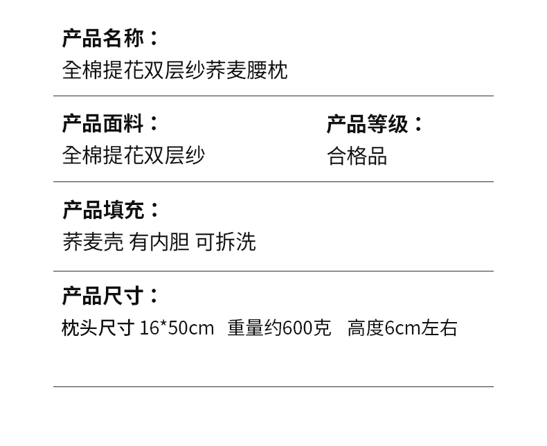 商品名称:(总)仁宇枕业 2026新款全棉提花双层纱腰枕头枕护颈荞麦枕头枕芯