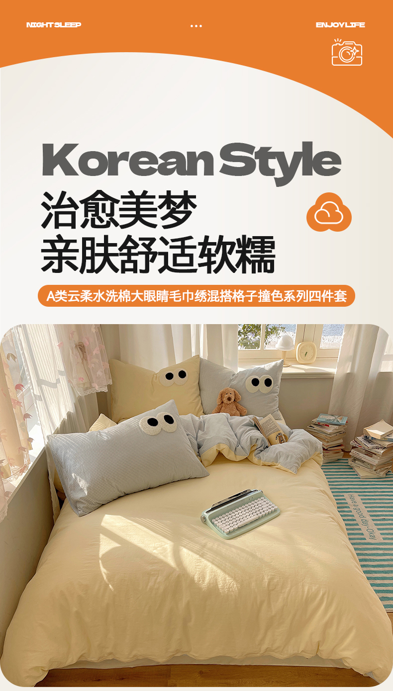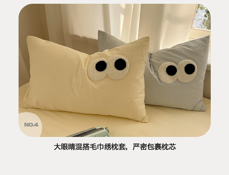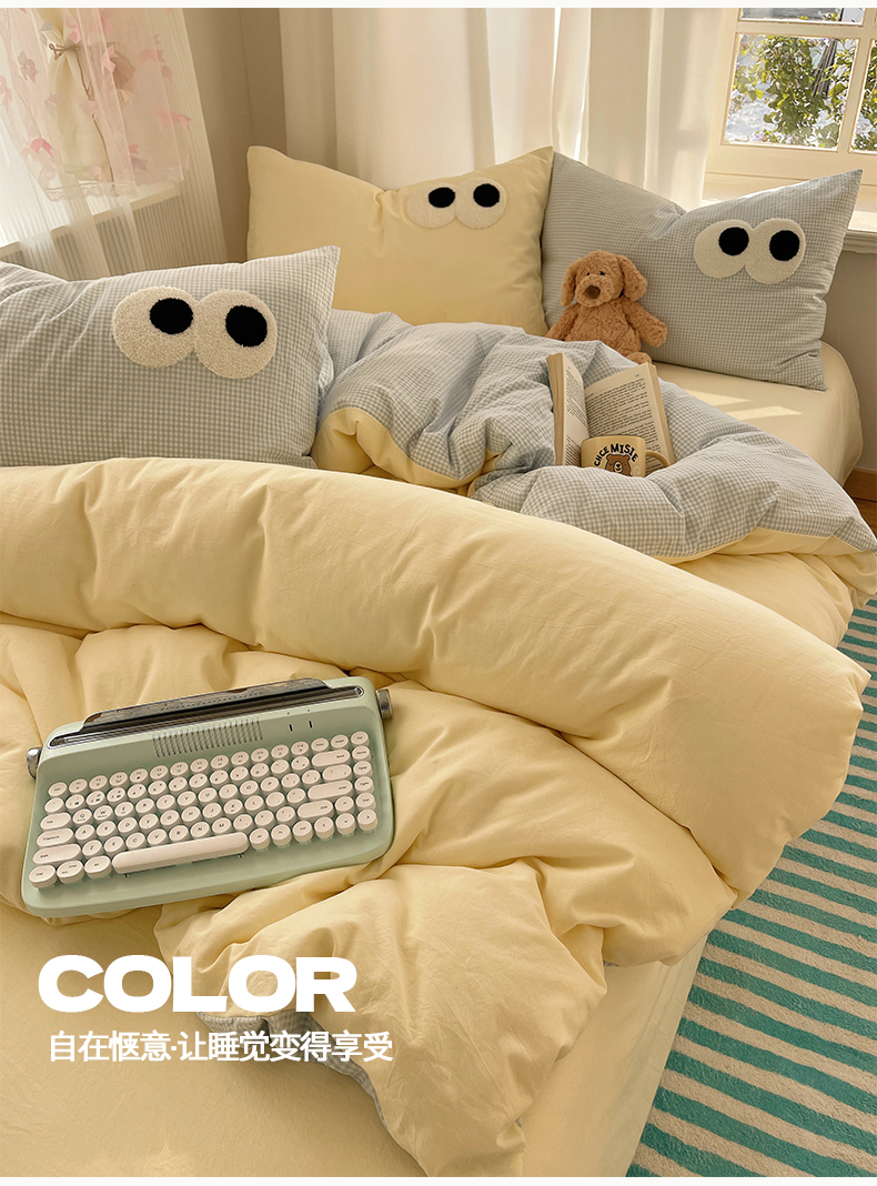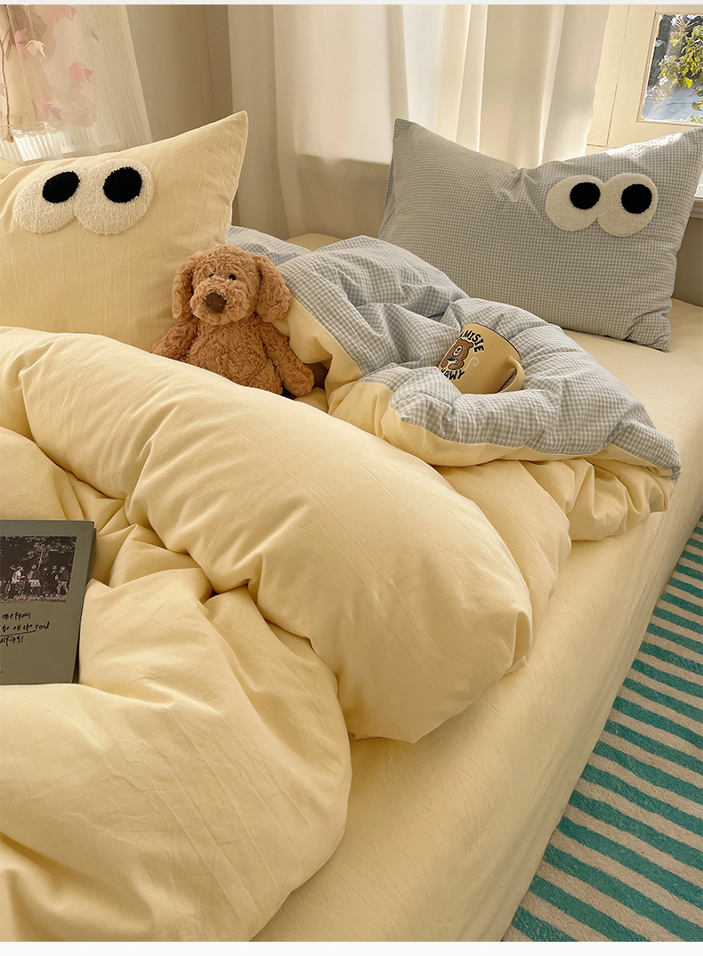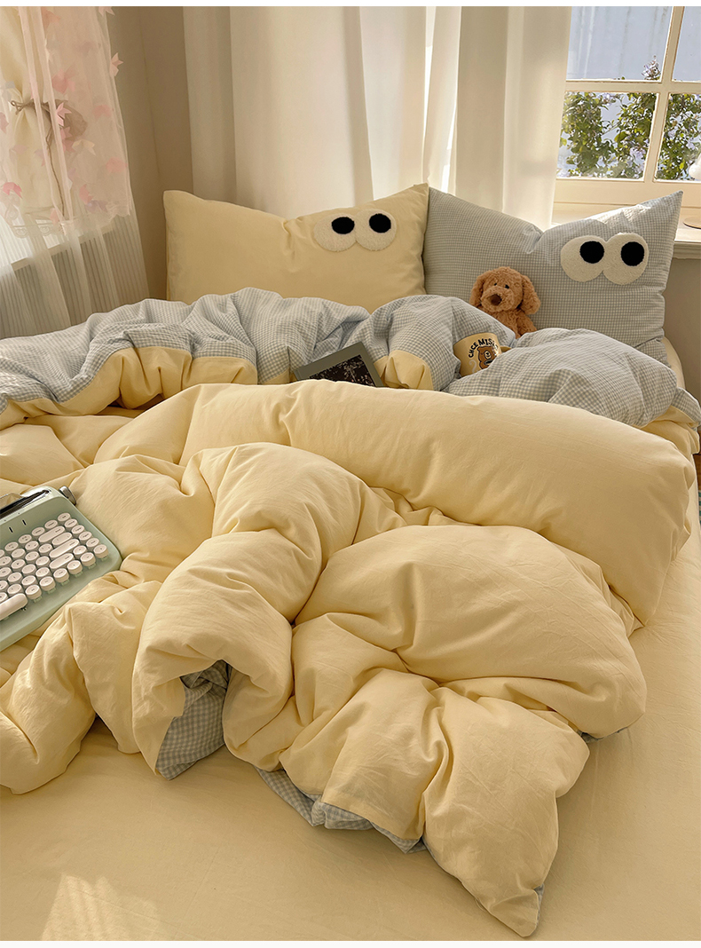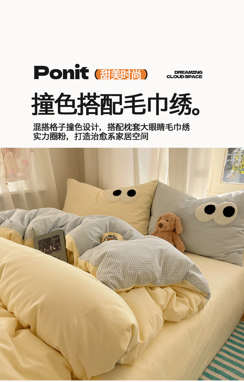 当前位置: 91家纺网 > 商品网购 > 床品套件 > 四件套 > 毛巾绣四件套 > 桃心家居 2026新款A类亲肤舒适软糯云柔水洗棉大眼睛毛巾绣混搭格子撞色系列四件套 云柔水洗棉-大眼奶黄小蓝格