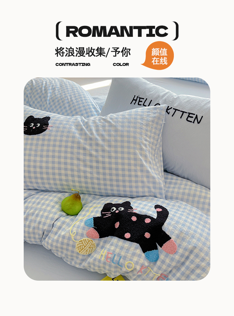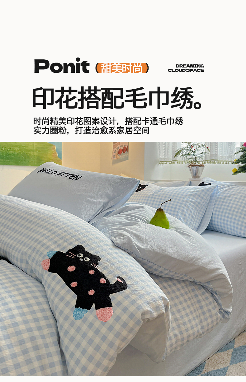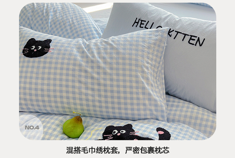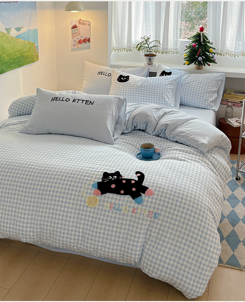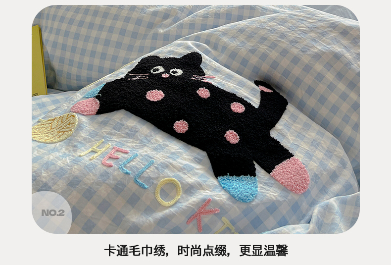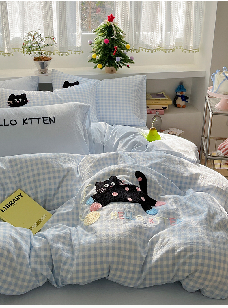 当前位置: 91家纺网 > 商品网购 > 床品套件 > 四件套 > 毛巾绣四件套 > 桃心家居 2026新款A类亲肤舒适软糯云柔水洗棉少女卡通格子混搭毛巾绣水洗棉系列四件套 云柔水洗棉-印加绣蓝格黑小猫