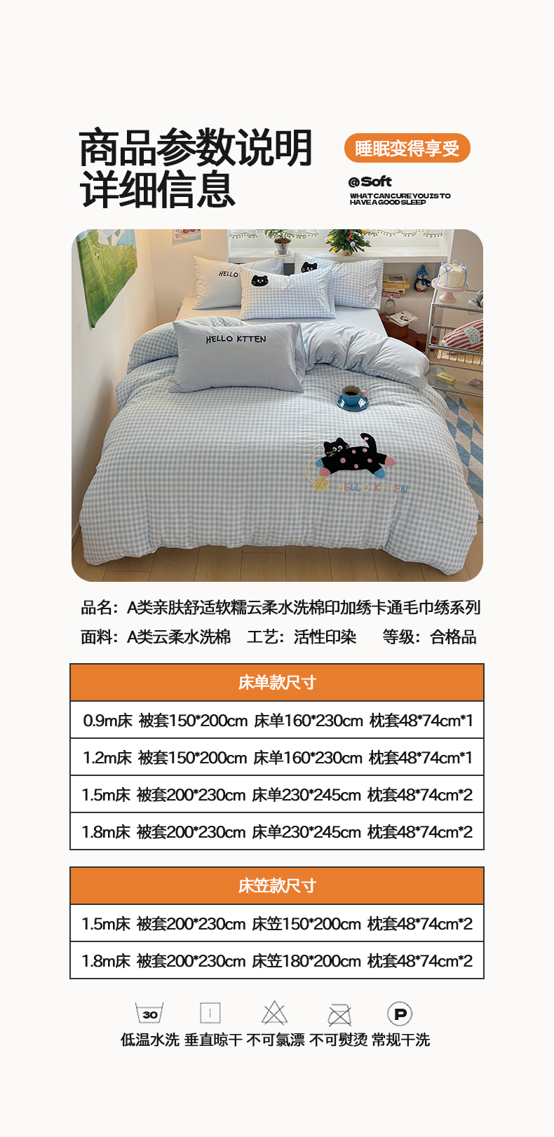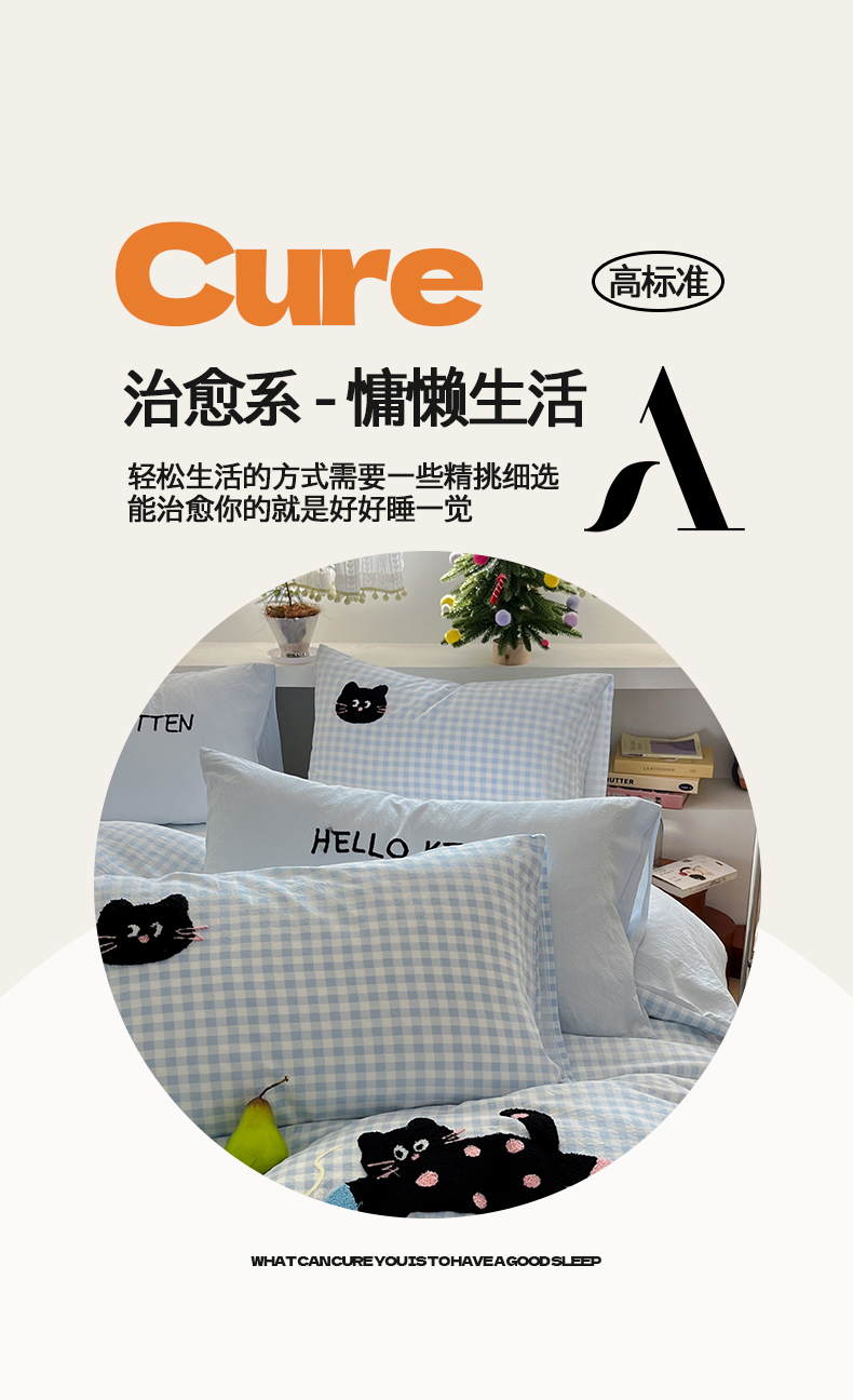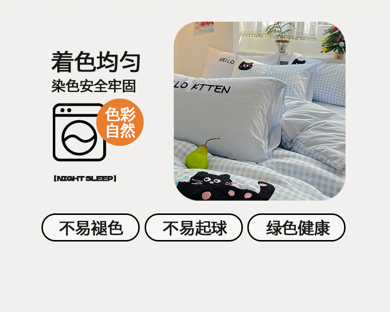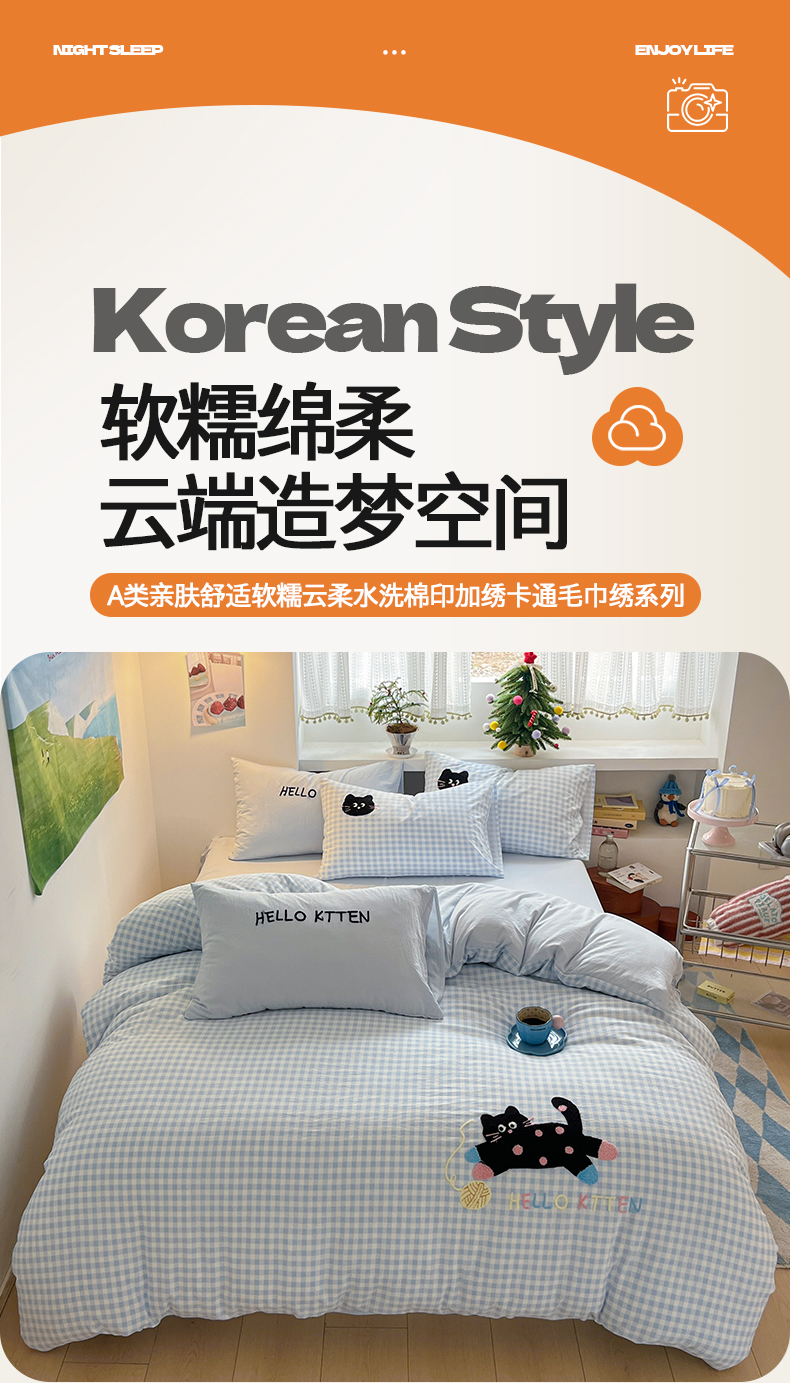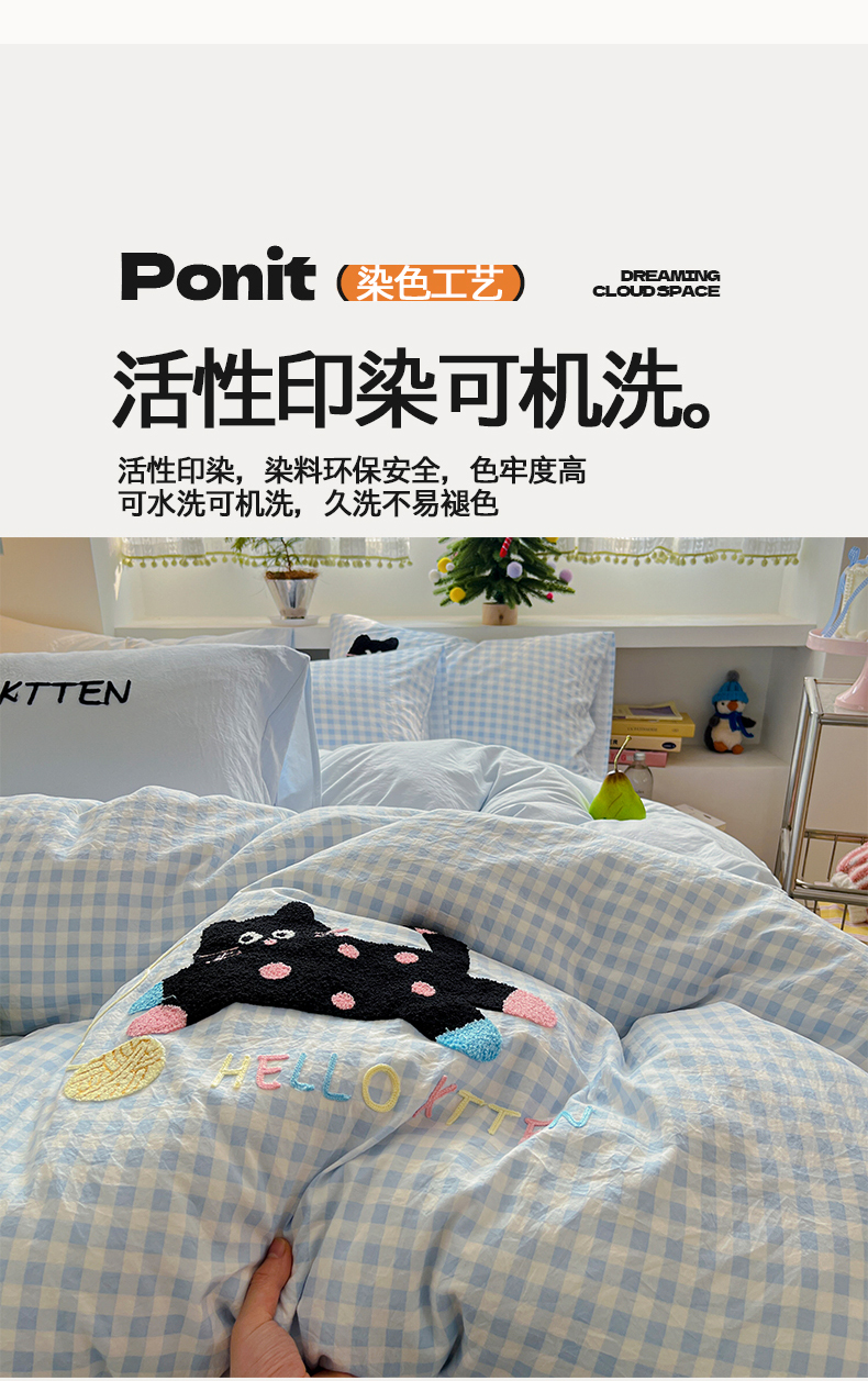 当前位置: 91家纺网 > 商品网购 > 床品套件 > 四件套 > 毛巾绣四件套 > 桃心家居 2026新款A类亲肤舒适软糯云柔水洗棉少女卡通格子混搭毛巾绣水洗棉系列四件套 云柔水洗棉-印加绣蓝格黑小猫