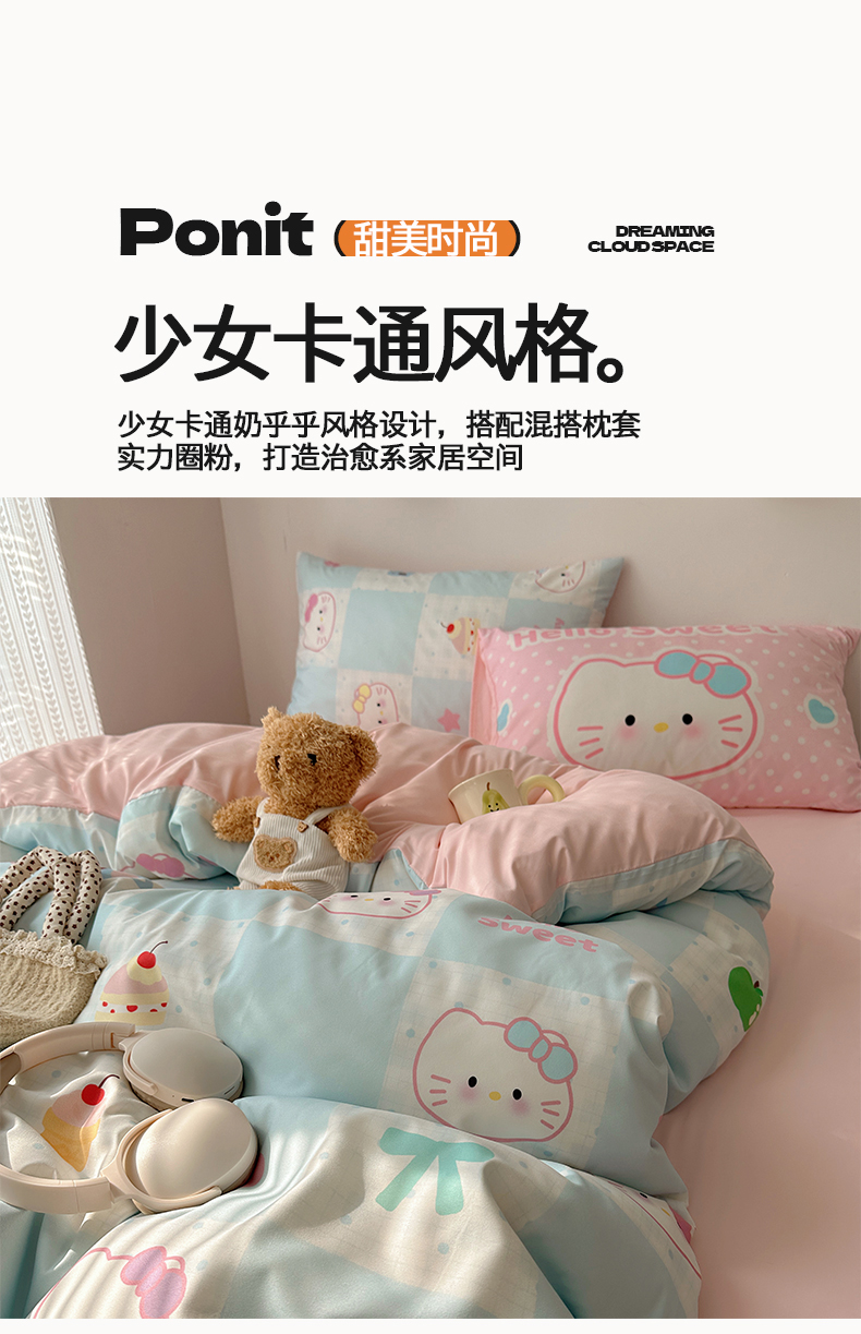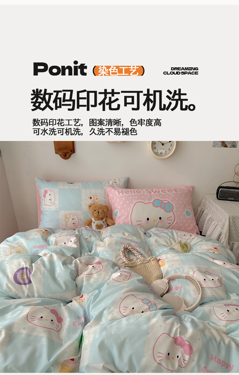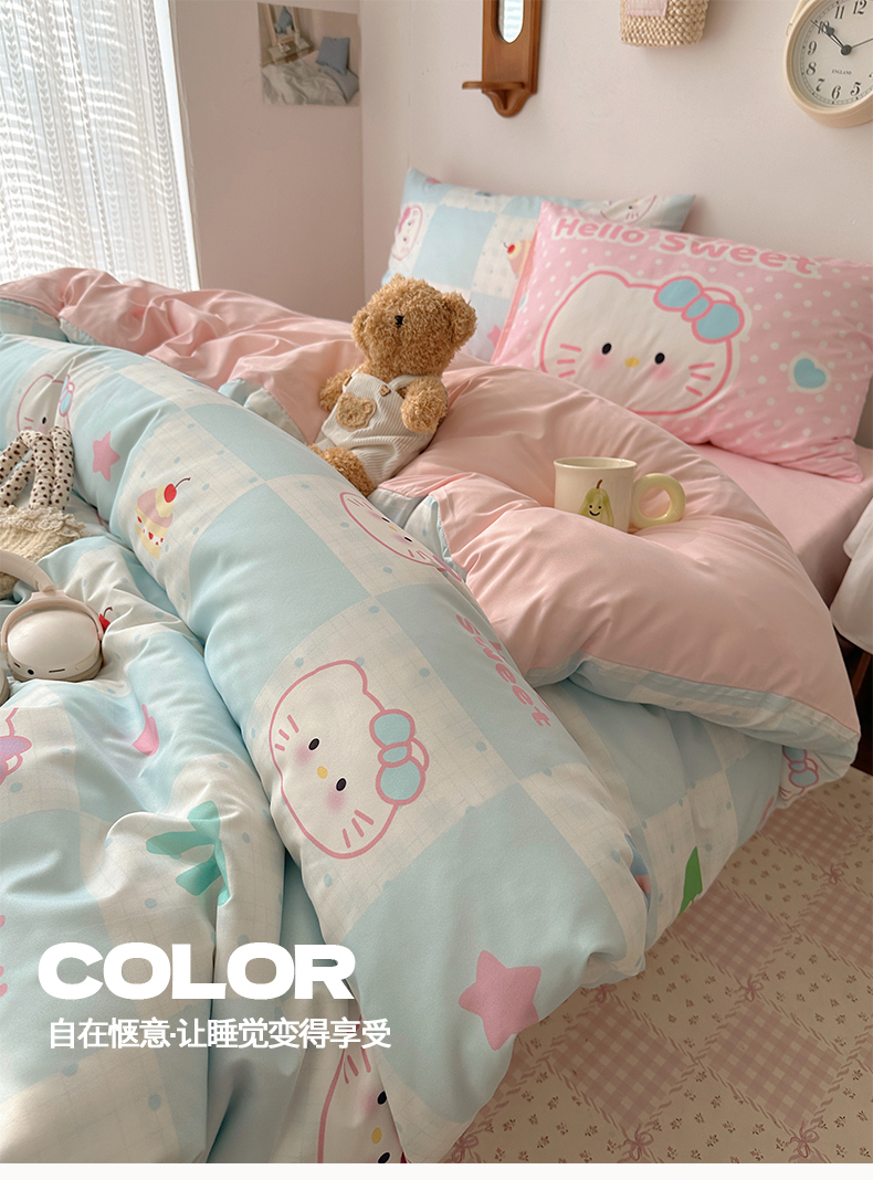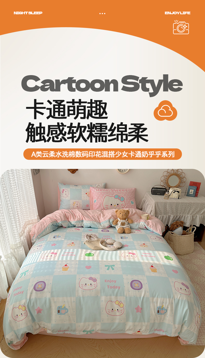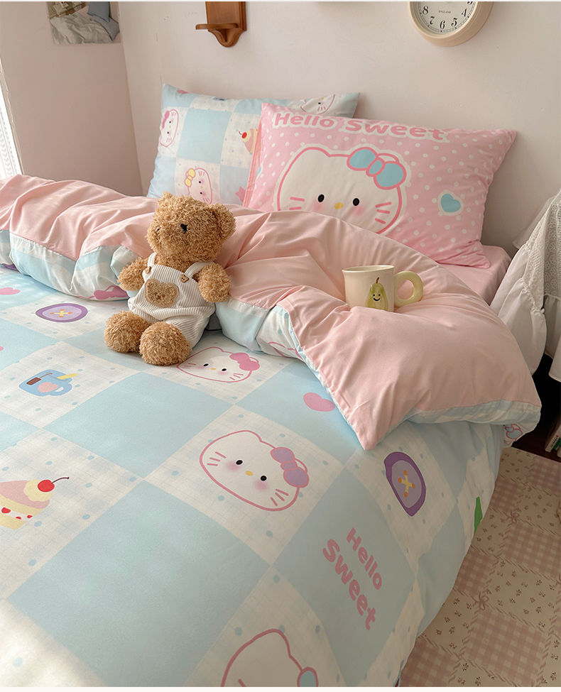 当前位置: 91家纺网 > 商品网购 > 床品套件 > 四件套 > 水洗棉四件套 > 桃心家居 2026新款A类亲肤舒适软糯云柔水洗棉数码印花混搭少女卡通奶乎乎系列四件套 云柔水洗棉-甜心蓝格猫