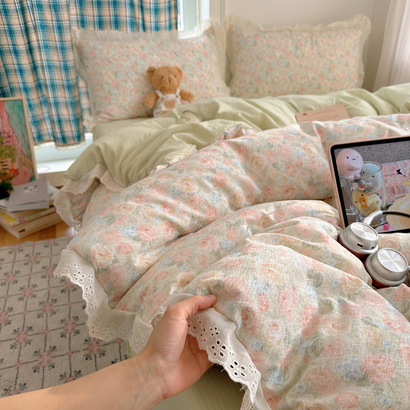 (总)一比一 2026新款云感皱皱双层纱四件套-全棉花边款【控价99元销售】,半夏绿,百福蓝,薄荷微凉,春风里,春晓,豆蔻,蝴蝶梦,可颂,兰黛,山野栀子,素颜,太妃糖,心动,遇见,芝士奶酪,紫爱心,紫苏,花园兔,蜡笔画,小黑兔,白茶-绿,初恋,莱茵河畔,桃花诺