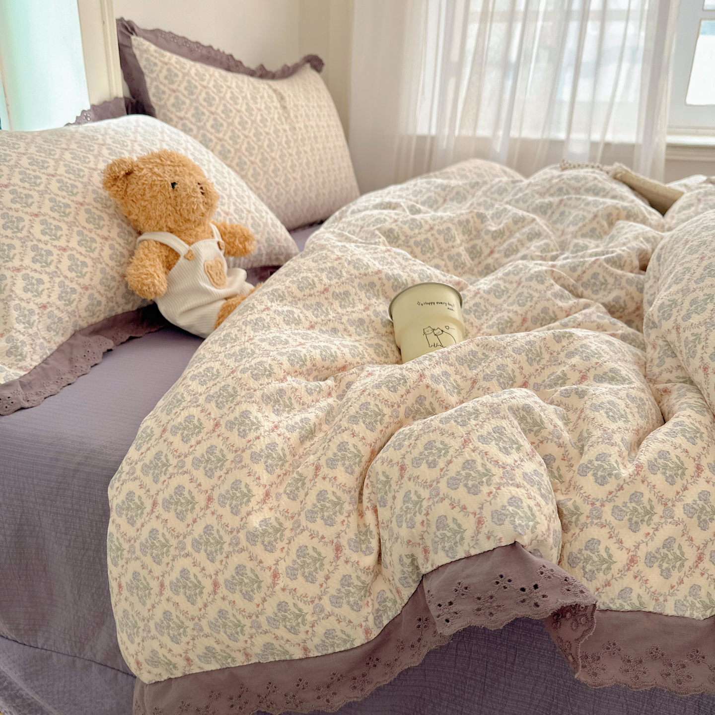 一比一家纺 2026新款彩色花边木棉皱皱纱四件套 邂逅