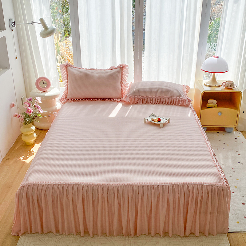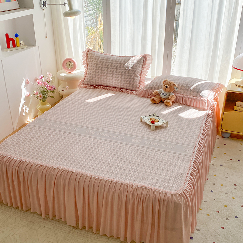 七里香 2026春夏新款2026新款华夫格3D千鸟格冰豆豆凉席床裙款三件套 华夫格-粉玉,华夫格-粉玉