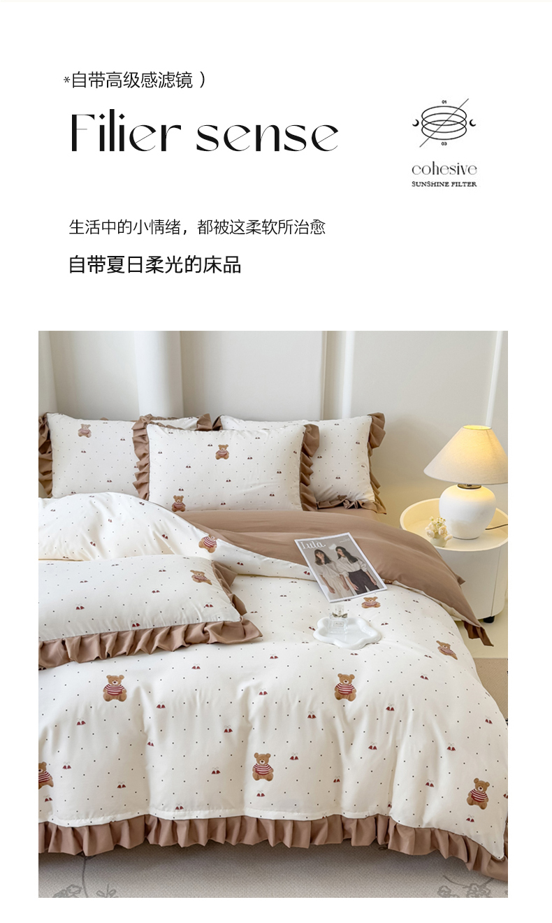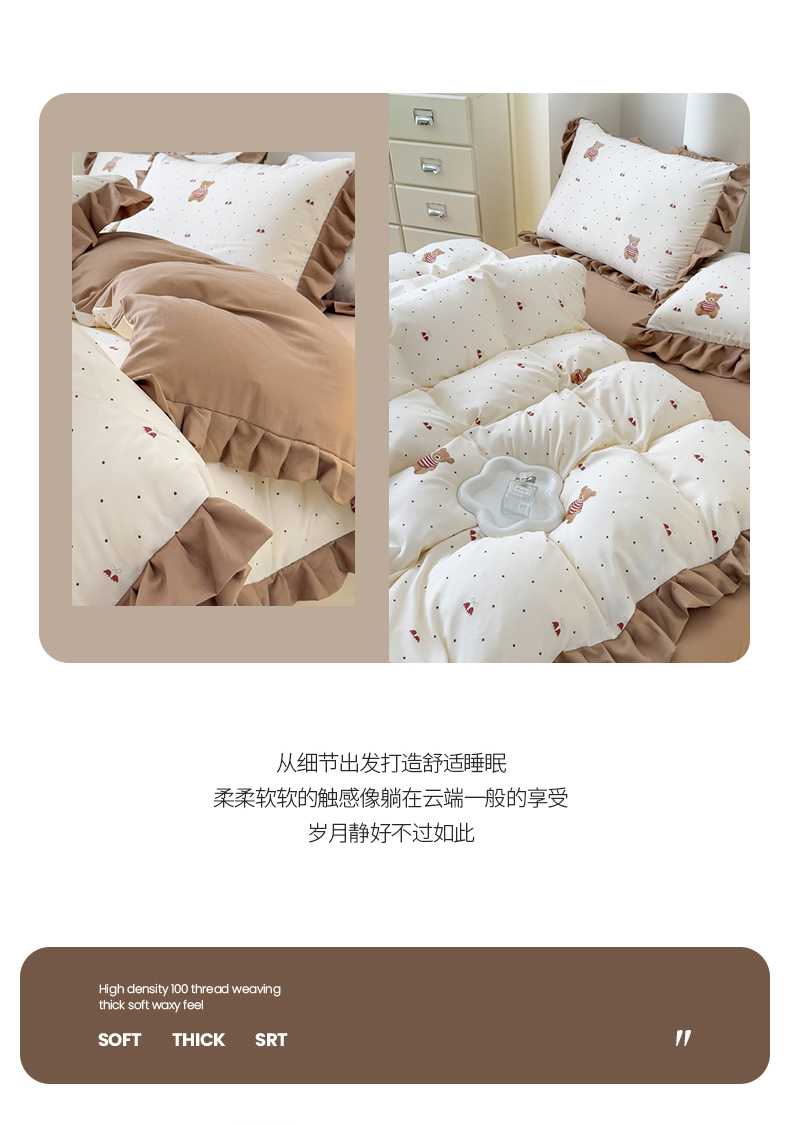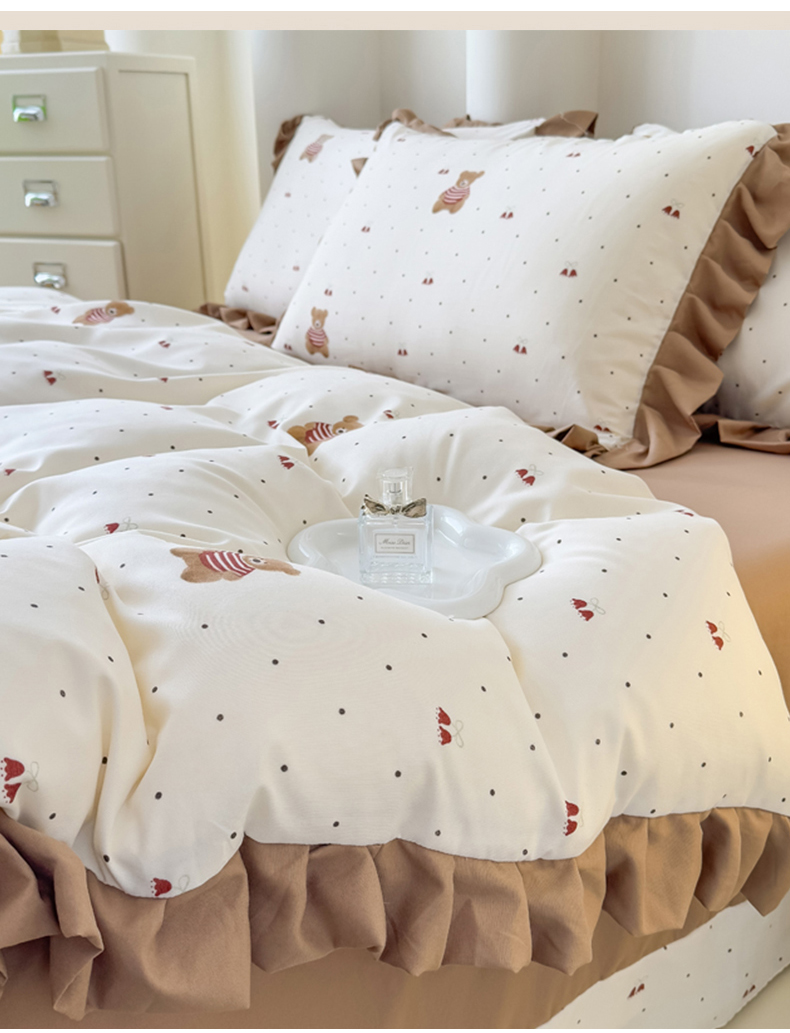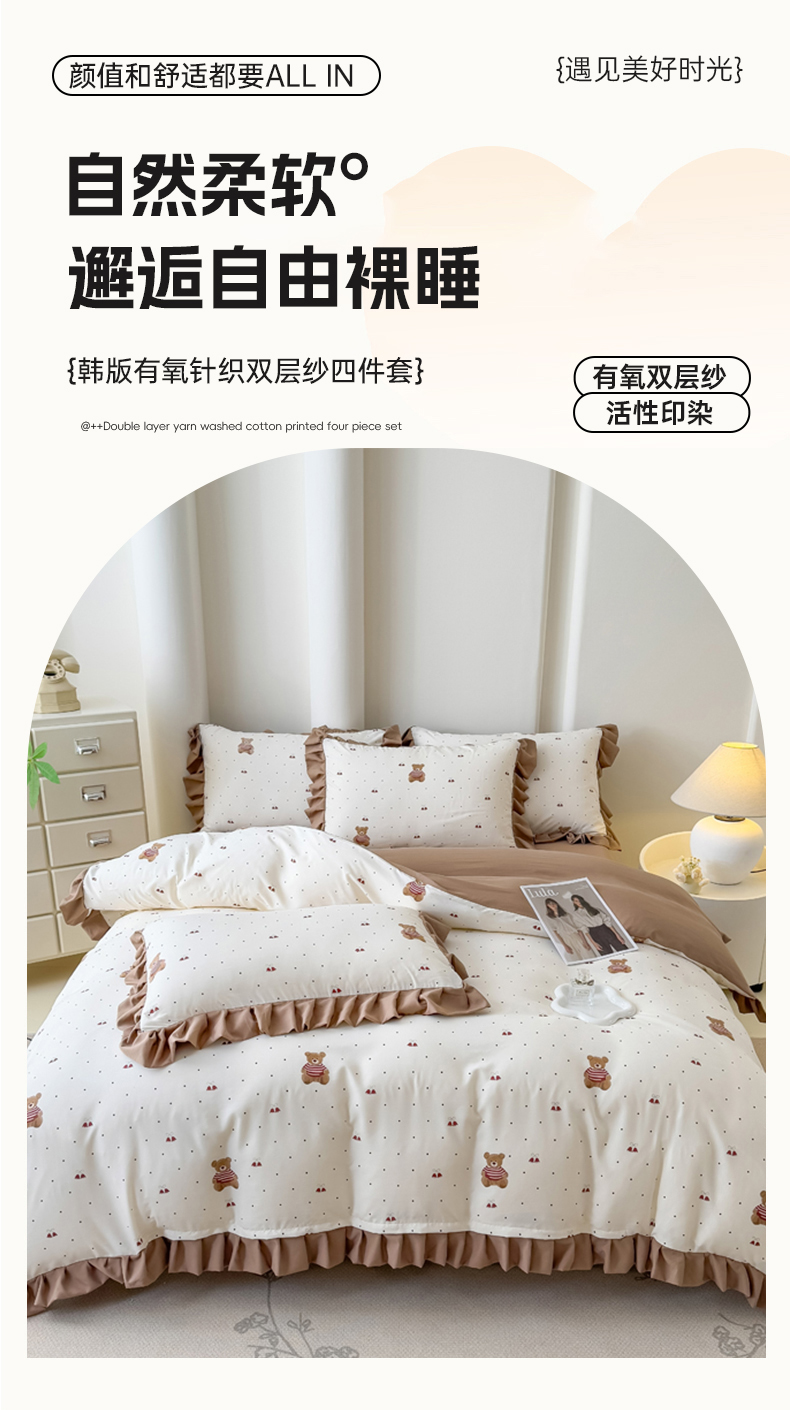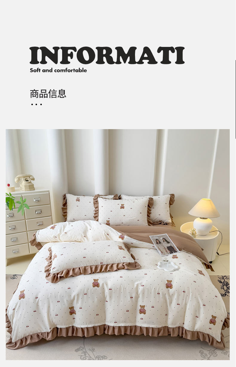 当前位置: 91家纺网 > 商品网购 > 床品套件 > 四件套 > 其它四件套 > 晚爱家纺(原晚安家居) 2026韩版花边四件套 有氧针织双层纱天竺棉超柔小清新四件套 铃铛熊