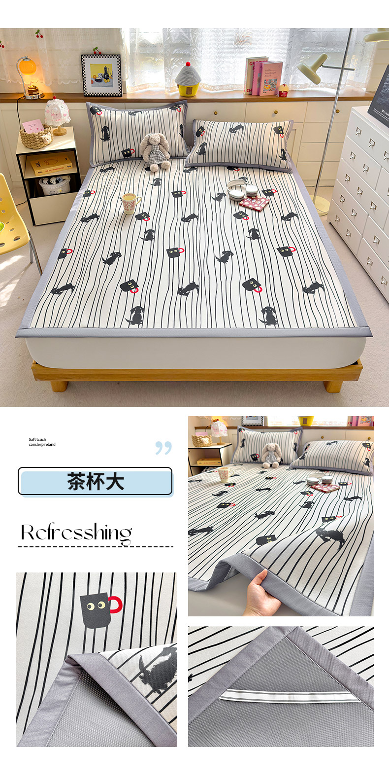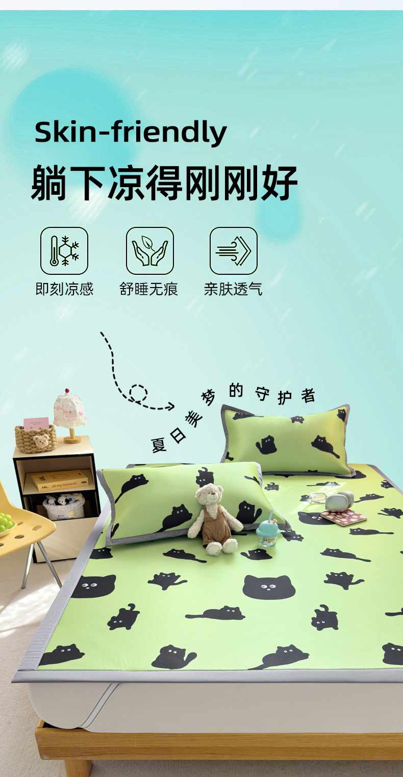 (总)圣比熊 2026新款烫光数码印花冰丝凉席,粉雾KT猫,薄荷喵星,茶杯大,腊肠狗,蓝莓甜熊,奶雾小熊,条纹萌觉