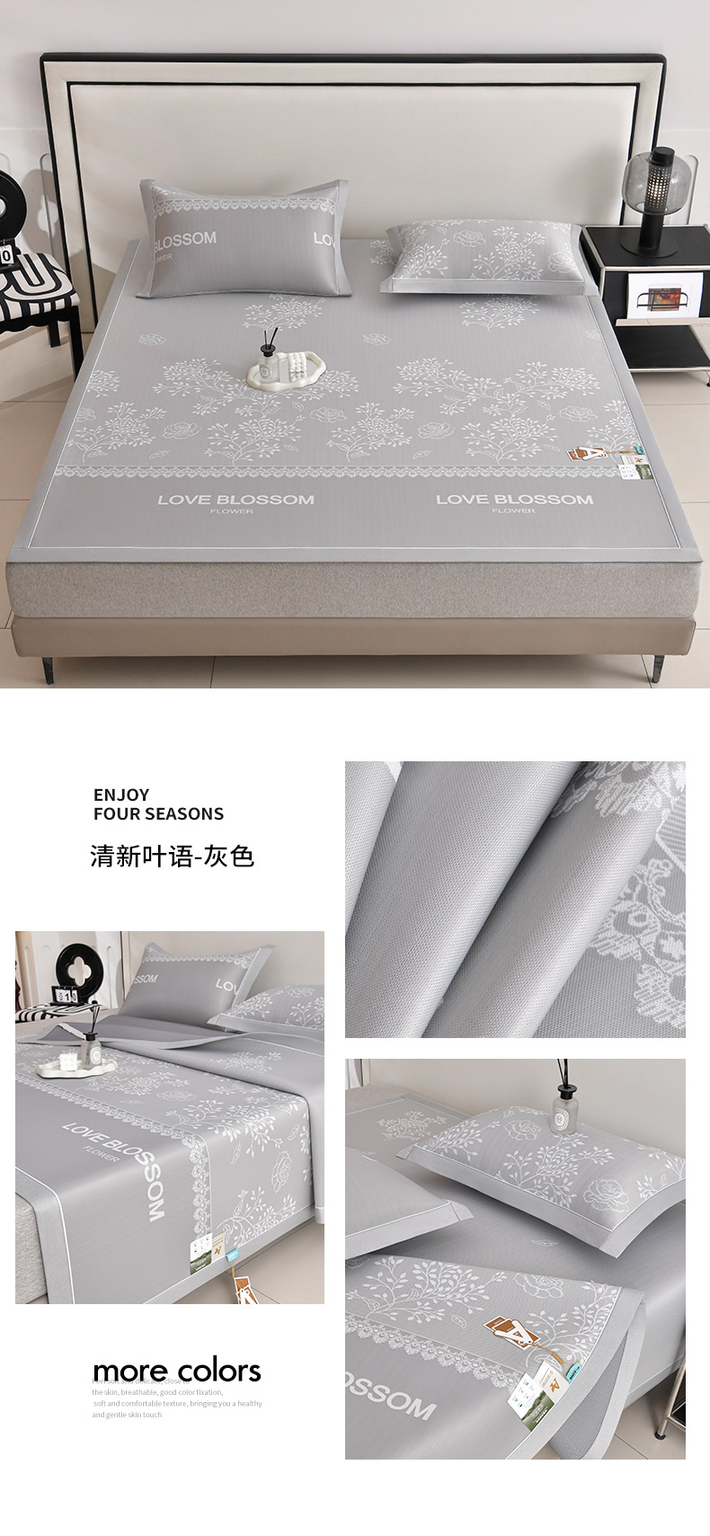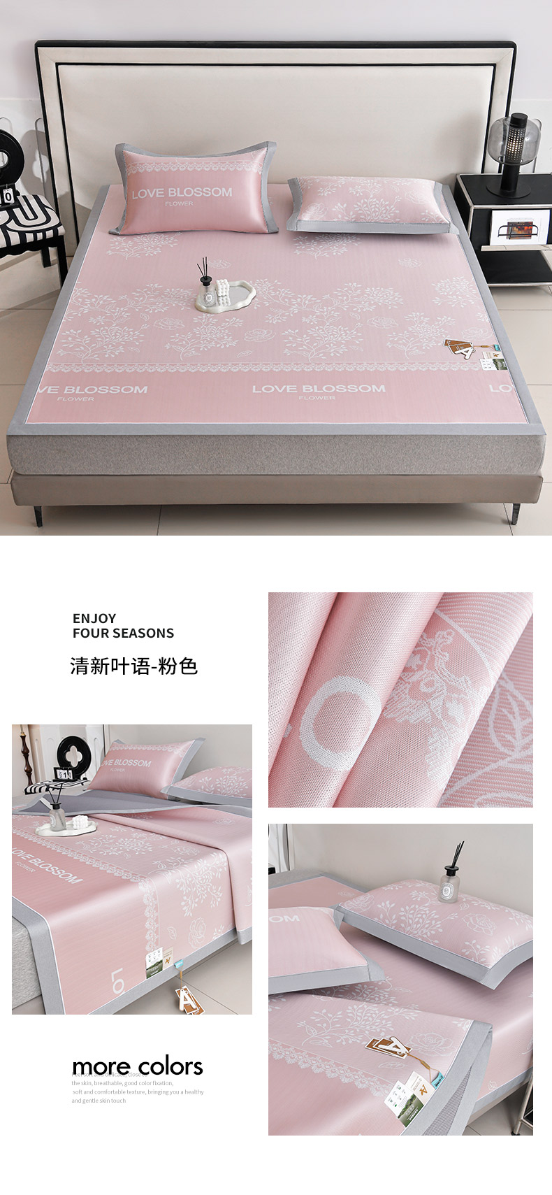 (总)2023新款超精密冰丝席-小斜纹系列-床笠款藤席凉席竹席,粉色,蓝色,绿色,银灰