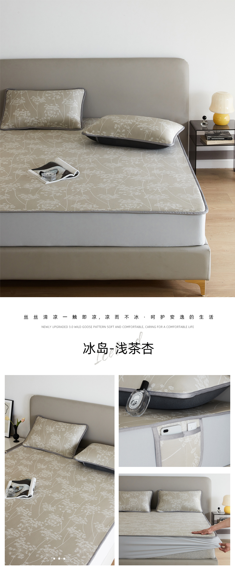 商品名称:千朵森 2026新款冰岛冰感丝床笠款凉席三件套-风格一 冰岛-浅茶杏