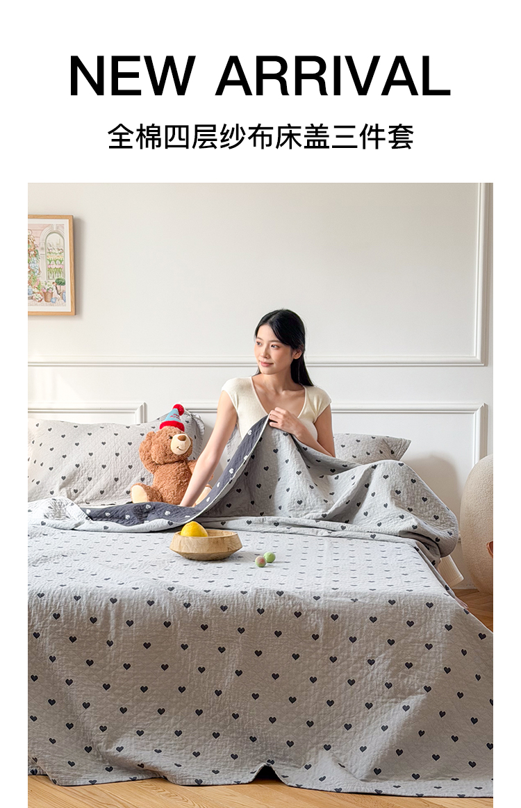 (总)沐瑟家纺 2025新款全棉纱布细纱布大床盖毯子床盖三件套LV系列,LV咖色,春意浓,玫瑰之约,小天鹅-绿,绽放-红色,绽放-姜黄