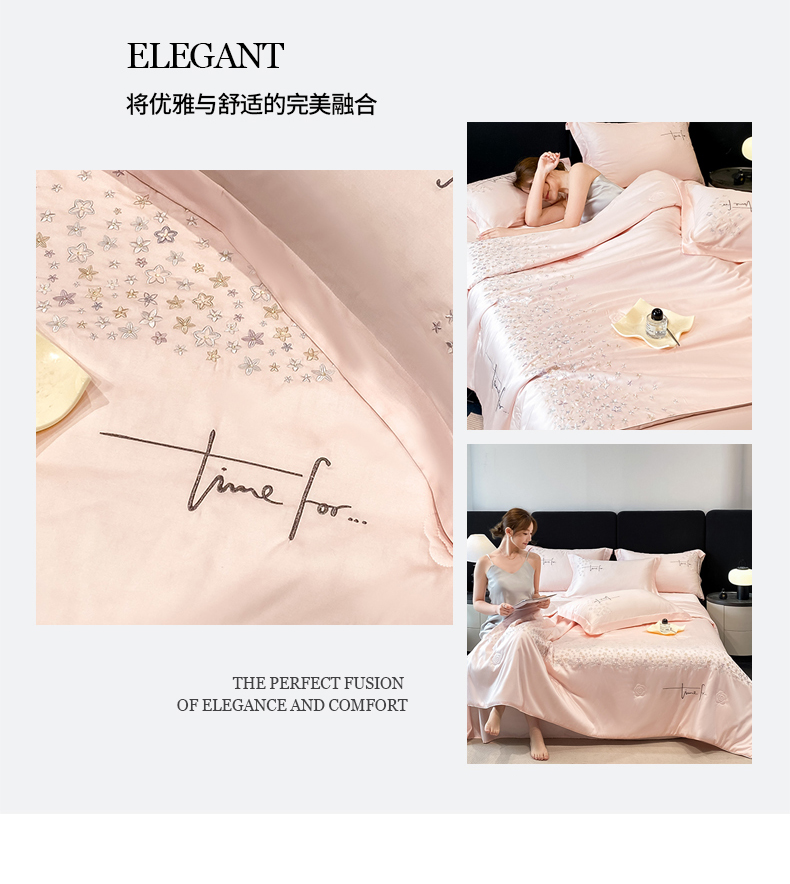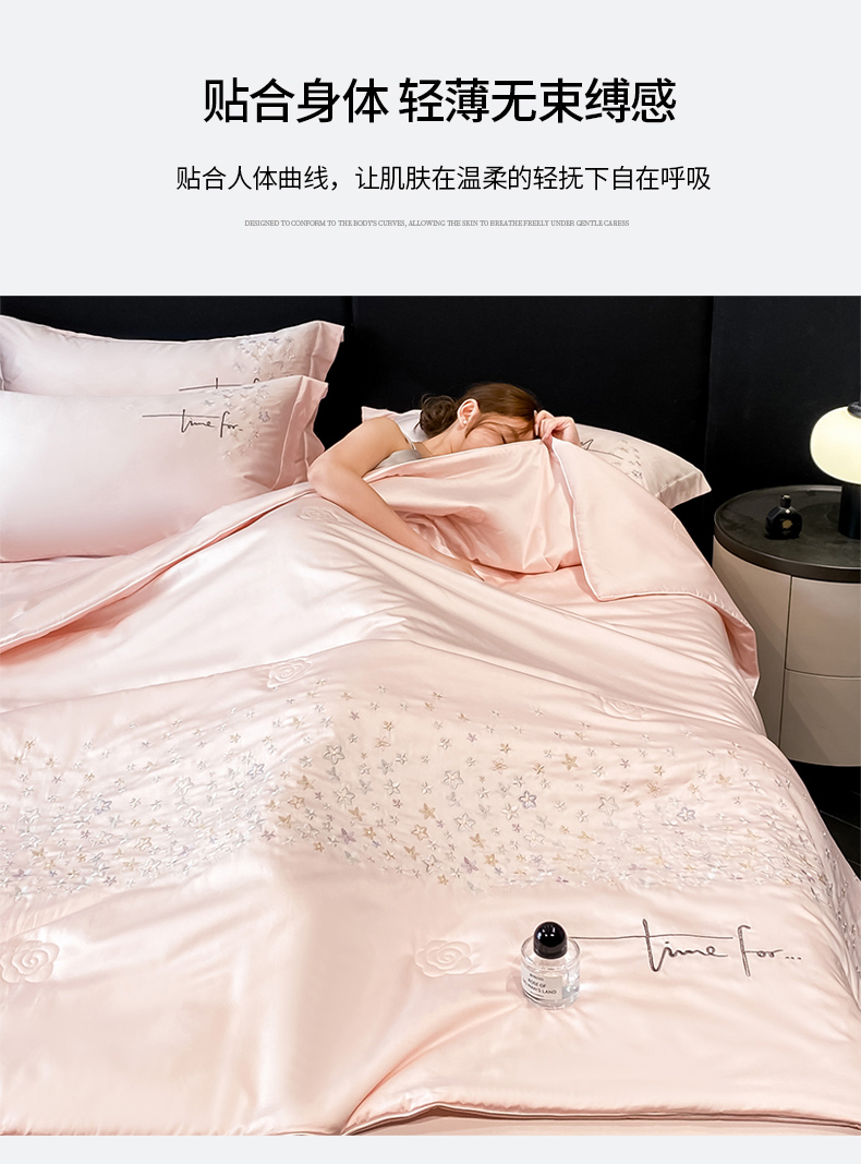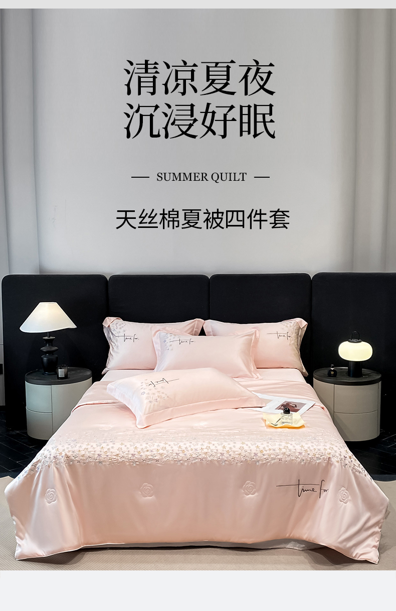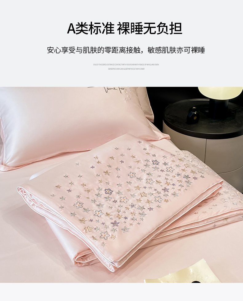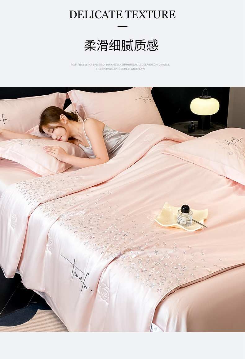 当前位置: 91家纺网 > 商品网购 > 床品套件 > 四件套 > 夏被四件套 > 新方向 2026新款刺绣A类20%蚕丝天丝棉夏被四件套-星耀 星耀-山茶粉