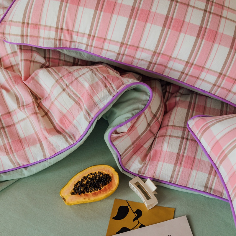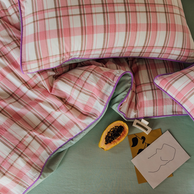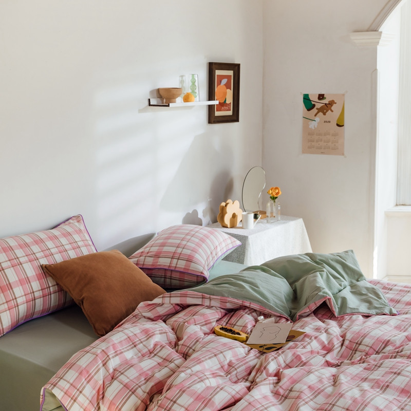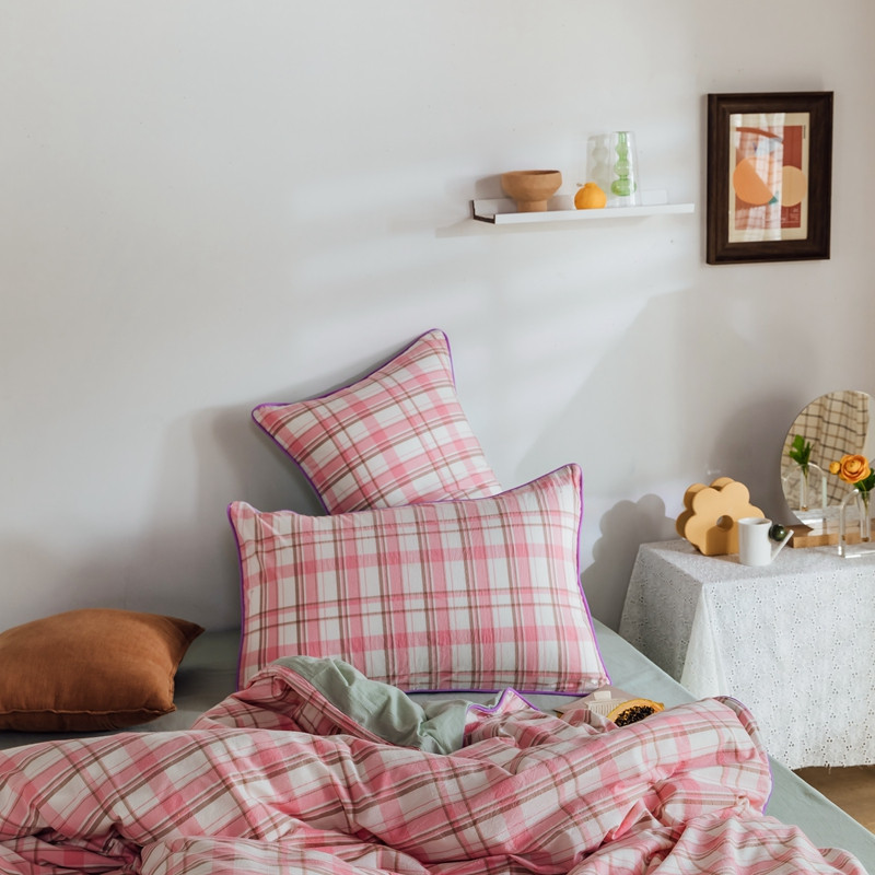 棉眠2020夏季新款32支色织水洗棉四件套 大粉格