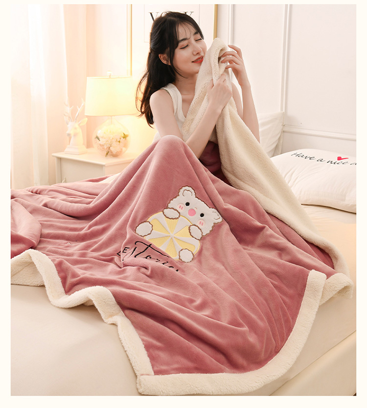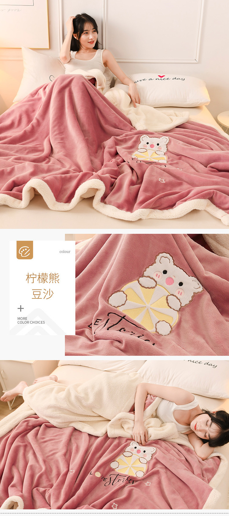 朗莎家纺 2020新款羊羔绒+牛奶绒毛毯 柠檬熊-豆沙