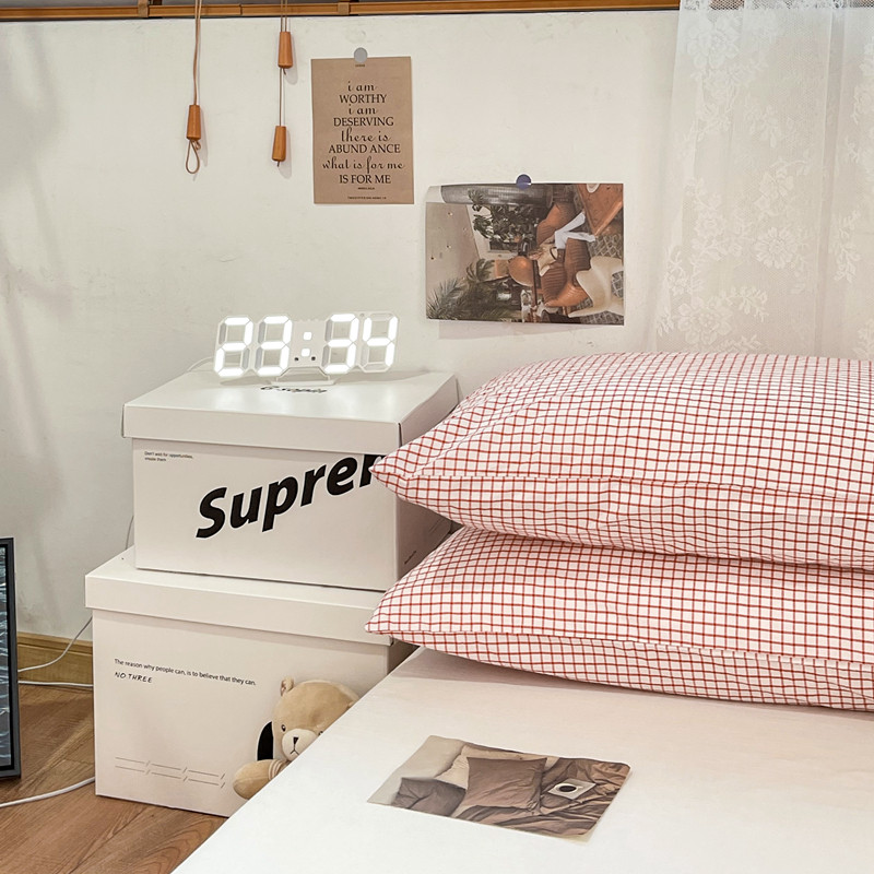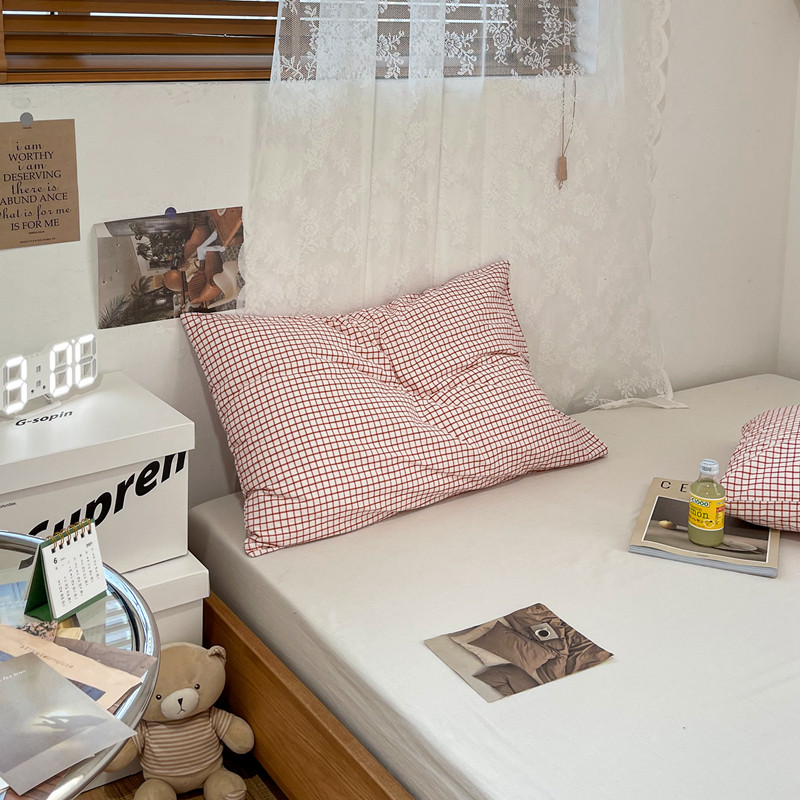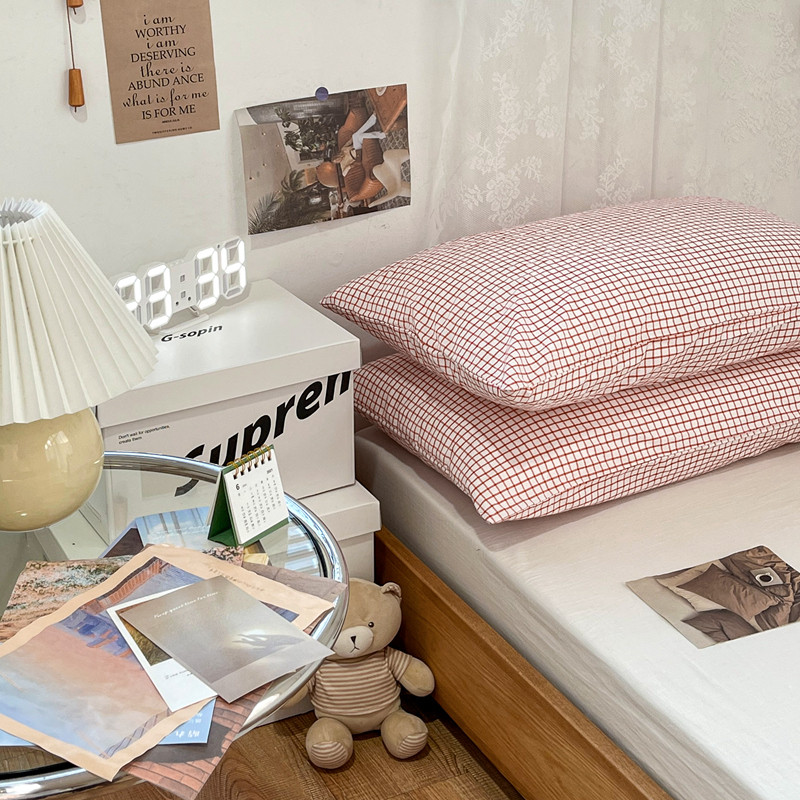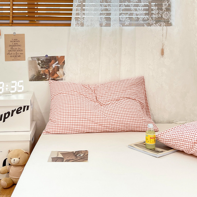安莱生活 2021新款水洗棉全棉单枕套 清新酱红格