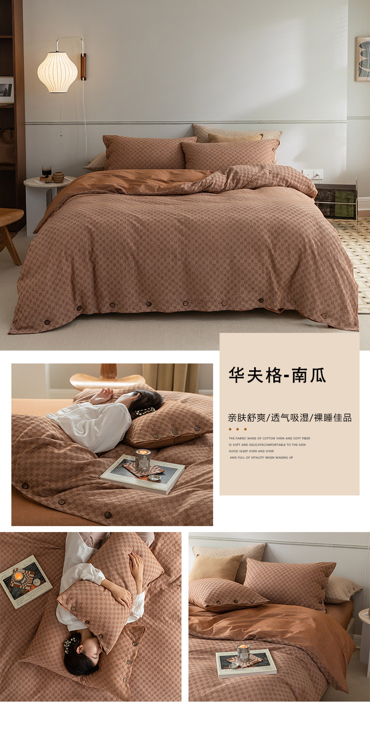 (总)华超针织 2021新款天竺棉魔方格四件套,魔方格姜黄,魔方格奶茶,魔方格南瓜,魔方格深灰,魔方格紫粉