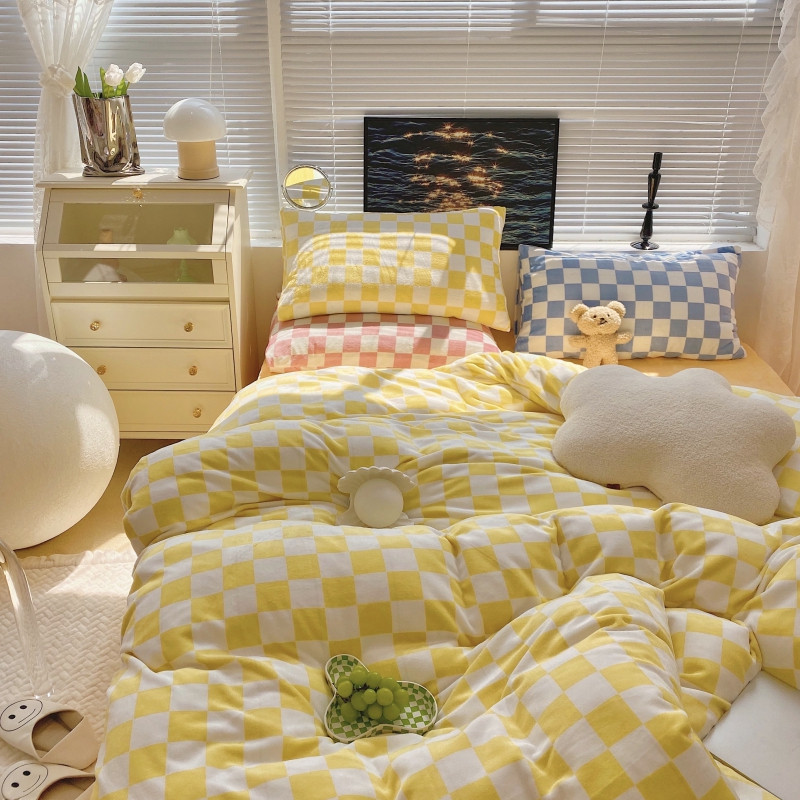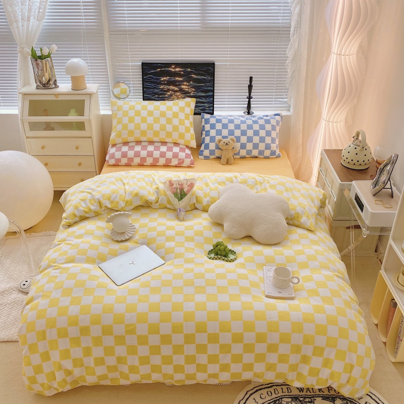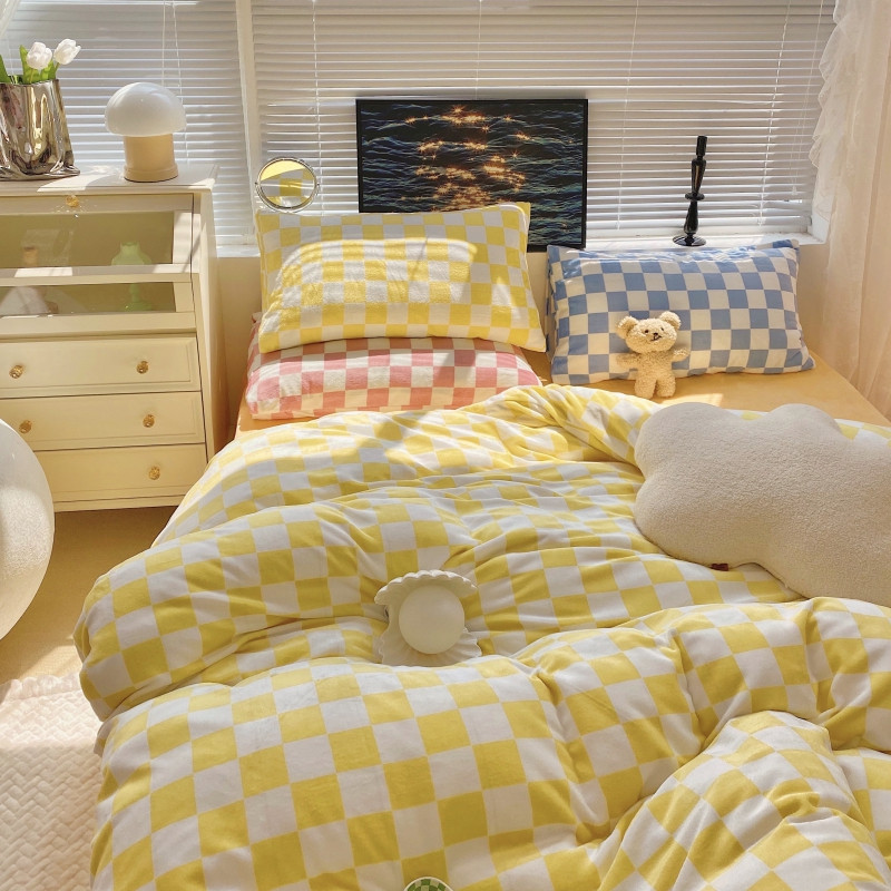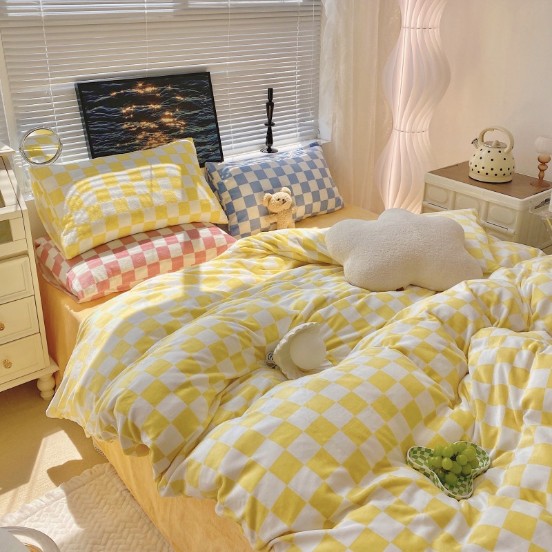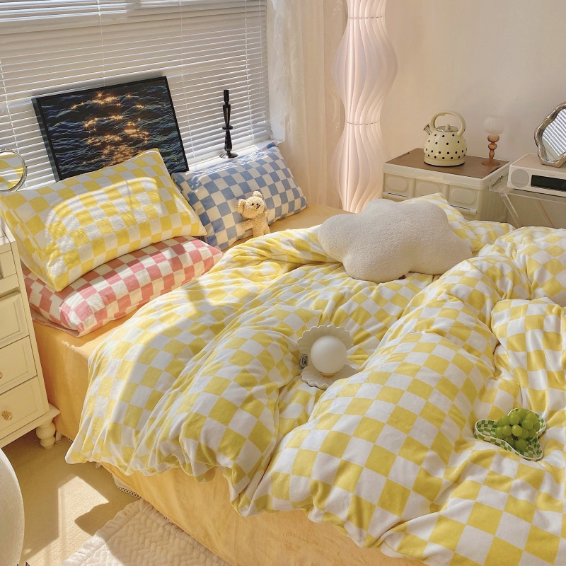顾里家纺 2021新款韩系撞色棋盘格高克重牛奶绒四件套 奶油黄