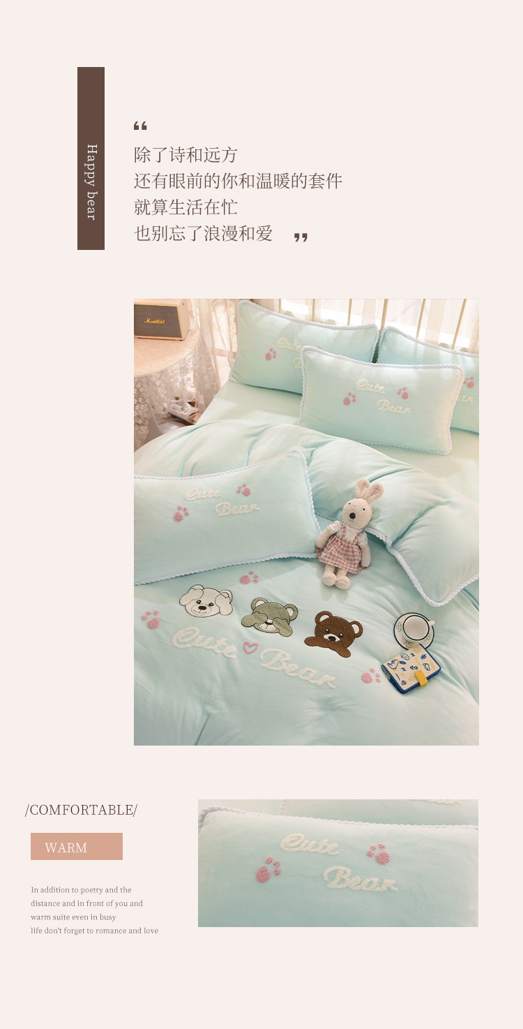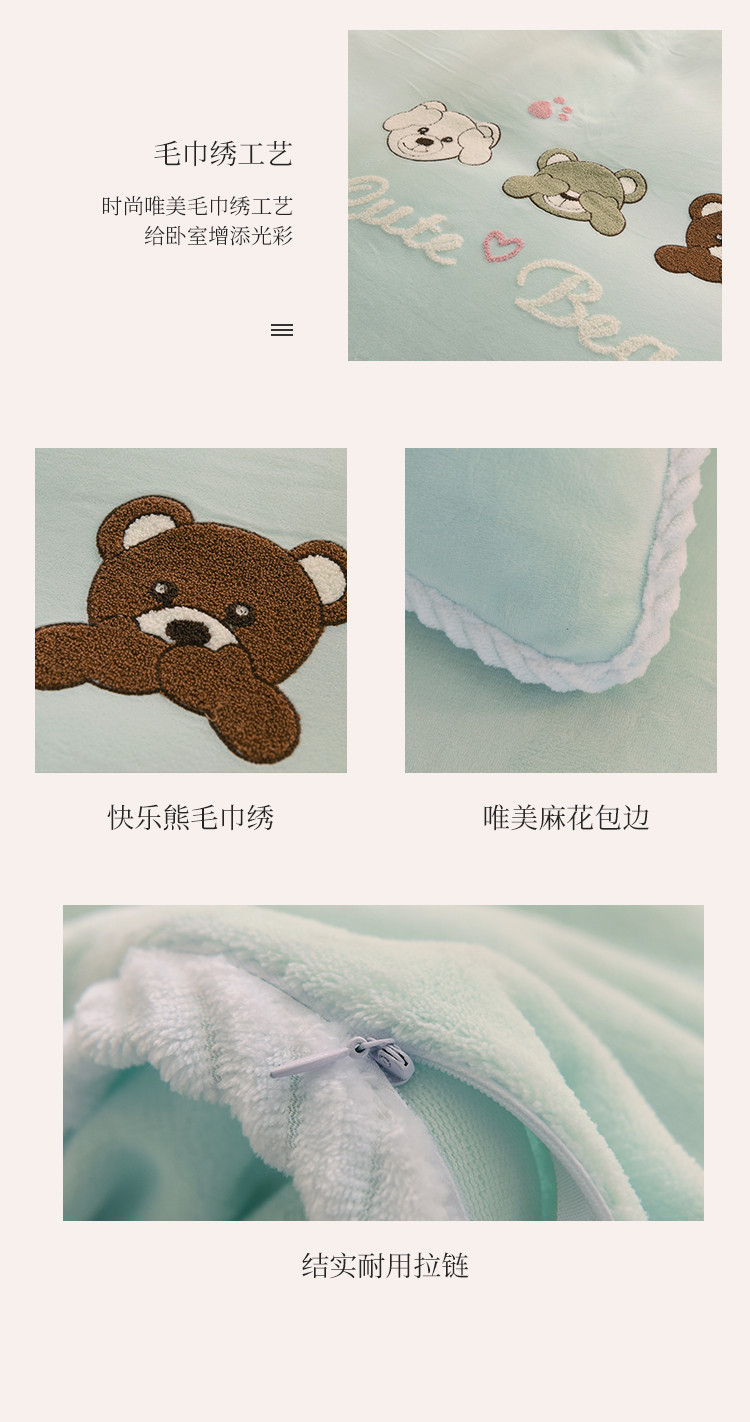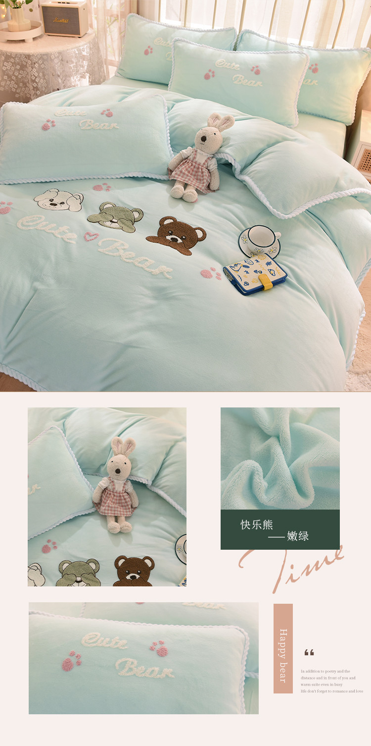 商品名称:菲儿 2021新款牛奶绒四件套法莱水晶绒快乐熊-嫩绿